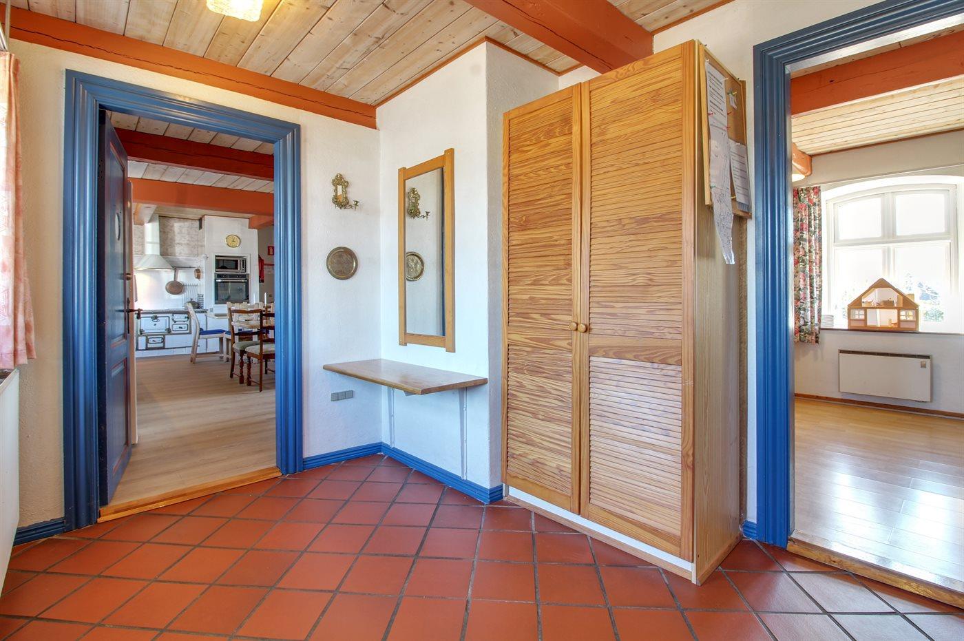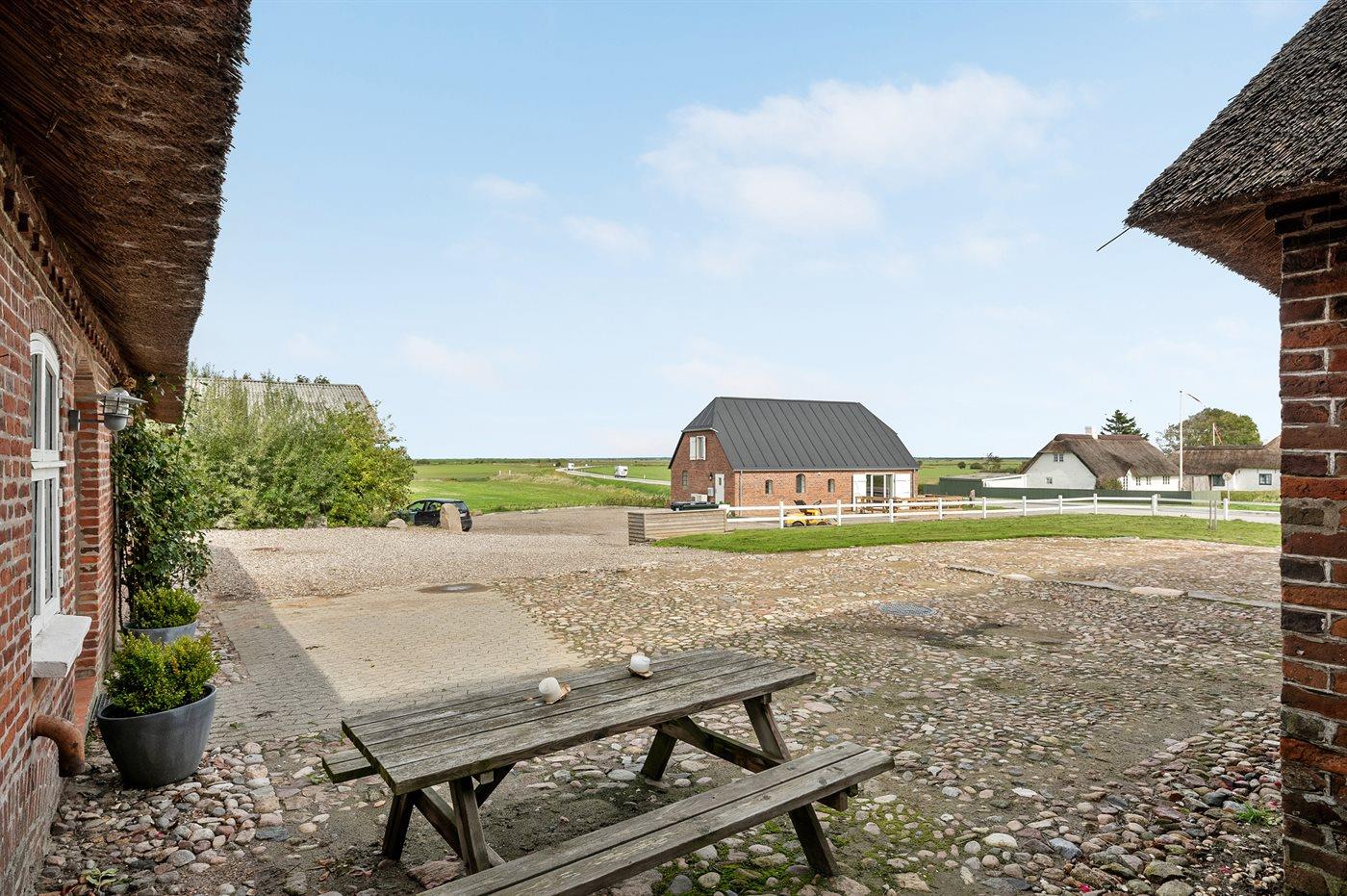 Dieses Ferienhaus für 20 Personen ist ein originaler, ehemaliger westjütischer Marschbauernhof, 1871 gebaut und 2005, renoviert. Es liegt in einem naturschönen Gebiet auf einem Naturgrundstück mit Schaukel, Trampolin, Wippe, Fußballtor und viel Platz zum tummeln und für Ballspiele. Zum Haus gehört ein großes Terrassenareal mit Gartenmöbeln und Grill sowie ein großer Atriumgarten. Innen ist das Haus, das aus 3 zusammengelegte Wohnungen besteht, behutsam renoviert. Es wurde darauf Wert gelegt den ehemaligen Stil und die ehemalige Atmosphäre zu erhalten. Es gibt 5 Badezimmer, alle mit Dusche und Fußbodenheizung. In der Whirlpool-Abteilung finden Sie einen großen 8-Pers.-Whirlpool (Standwasser), eine Sauna und einen Fitnessraum. Außerdem Zutritt zu einem Raum mit Whirlpool und Waschmaschine. Separater Hobby-/Spielraum mit Pooltisch und verschiedene Spielsachen. Jede Wohnung verfügt über eine gut ausgestattete Küche mit verschiedenen Haushaltsgeräten einschl. Tiefkühlgerät sowie kostenlose, kabellose Internetverbindung (Computer ist mitzubringen). In der einen Küche gibt es Essplatz für 20 Personen, Mikrowelle, Stereoanlage mit CD-Spieler, Kaminofen und ein Klavier. Es stehen 3 Fernseher zur Verfügung (mehr als 3 deutsche und 3 dänische Fernsehsender). Die Schlafplätze des Hauses verteilen sich auf 10 Zimmer, alle mit Doppelbett und gutem Schrankplatz. Außerdem stehen 2 Kinderbetten zur Verfügung. Das Haus wird mit Erdwärme beheizt – in den Schlafzimmern jedoch mit Elektroheizung. Übrigens: Es stehen 2 Fahrräder zur Verfügung (für den Zustand der Räder wird keine Haftung übernommen). Ein wirklich nettes und geräumiges Ferienhaus in schöner Natur, nur 600 m vom Wattenmeer, mit guten Angelmöglichkeiten, entfernt. Ballum Enge liegt hinter den Deichen des Wattenmeers. Hier können Sie das reiche Vogelleben beobachten. In jedem Frühjahr und Herbst können Sie mit ein wenig Glück auch ein unvergessliches Phänomen erleben. Millionen von Staren versammeln sich kurz vor Sonnenuntergang und führen laut Aussagen der Einheimischen ein Ballett am Himmel auf. Der Eintritt zur Indoor-Minigolfanlage in Ballum – Adventure Minigolf Vadehavet – ist kostenlos.