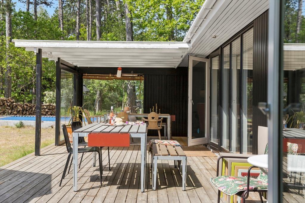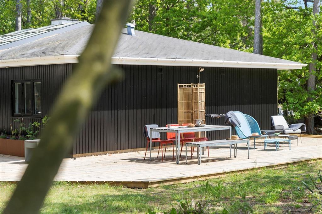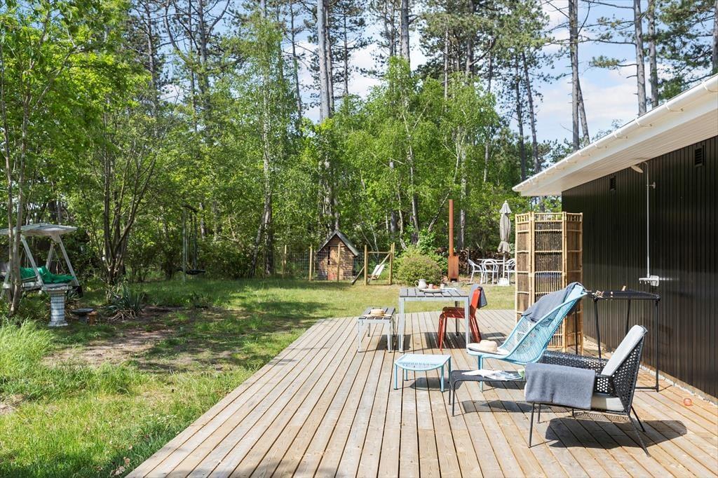 Das Haus befindet sich auf einem 1.369 m² großen Grundstück mit einer schön großen, teilweise überdachten Holzterrasse. Im Schuppen sind Fahrräder, Angelzubehör und Sportgeräte untergebracht, die Sie gerne nutzen dürfen. Gartenmöbel, ein Terrassenheizstrahler, ein Sonnenschirm, eine Hollywoodschaukel, ein Gasgrill und eine Außendusche laden zu gemütlichen und entspannten Stunden im Freien ein. Während Sie sich in vollen Zügen erholen, werden Ihre Kinder vergnügt auf dem Trampolin hüpfen, schaukeln und das Spielhaus nutzen.
