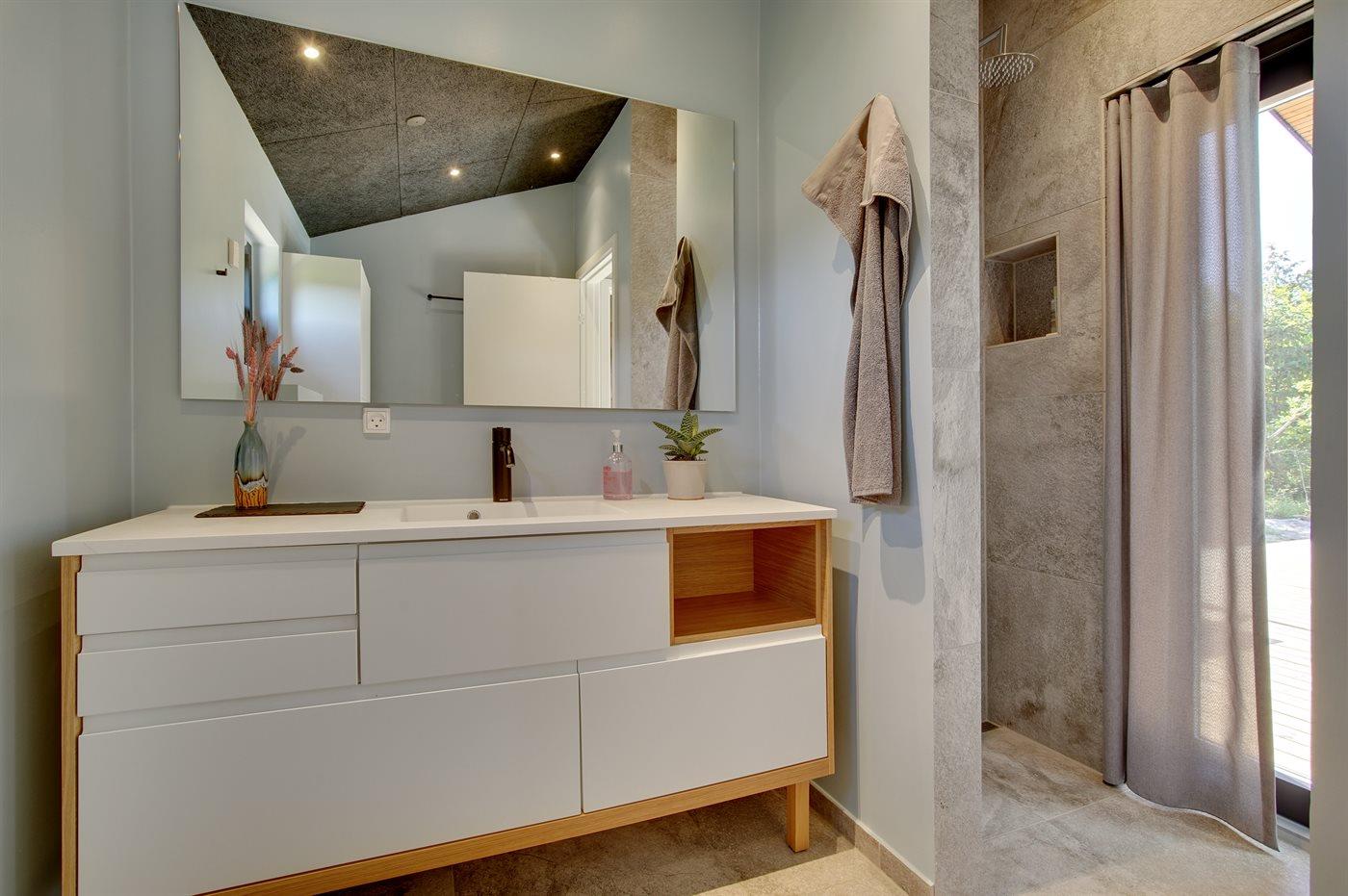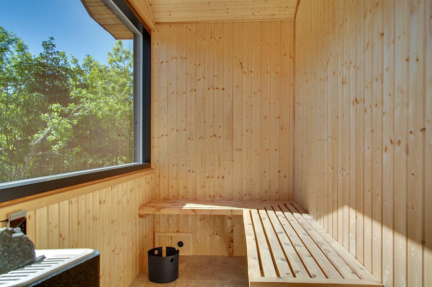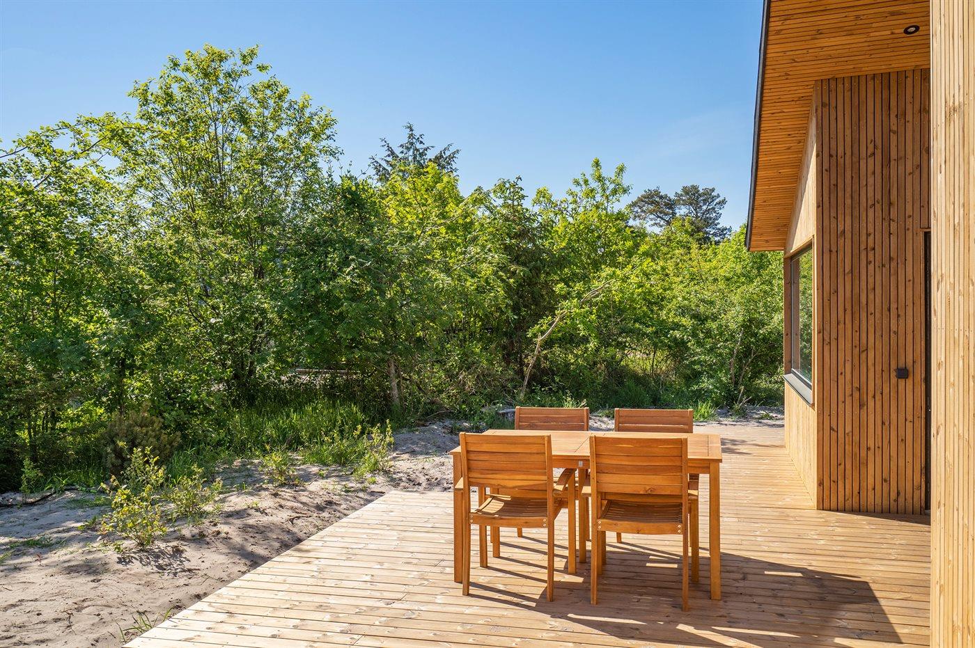 Die Ferienunterkunft liegt auf einem 1251 m² großen Naturgrundstück. Die Entfernung zum Meer beträgt 200 m. Die Entfernung zum Fjord beträgt 5500 m. Die Entfernung zu einem See beträgt 1000 m. Die nächste Einkaufsmöglichkeit liegt 3300 m entfernt. In einem Abstand von 5700 m gibt es einen Golfplatz. Es steht ein 200 m² Terrassenareal zur Verfügung. Außerdem gibt es 40 m² überdachte Terrasse. Außendusche. An Sommerabenden sorgt der Außenkamin für eine gemütliche Atmosphäre. Es beteht die Möglichkeit das Essen in der Außenküche zuzubereiten. Es steht ein Grill zur Verfügung. Parkplatz auf dem Grundstück.