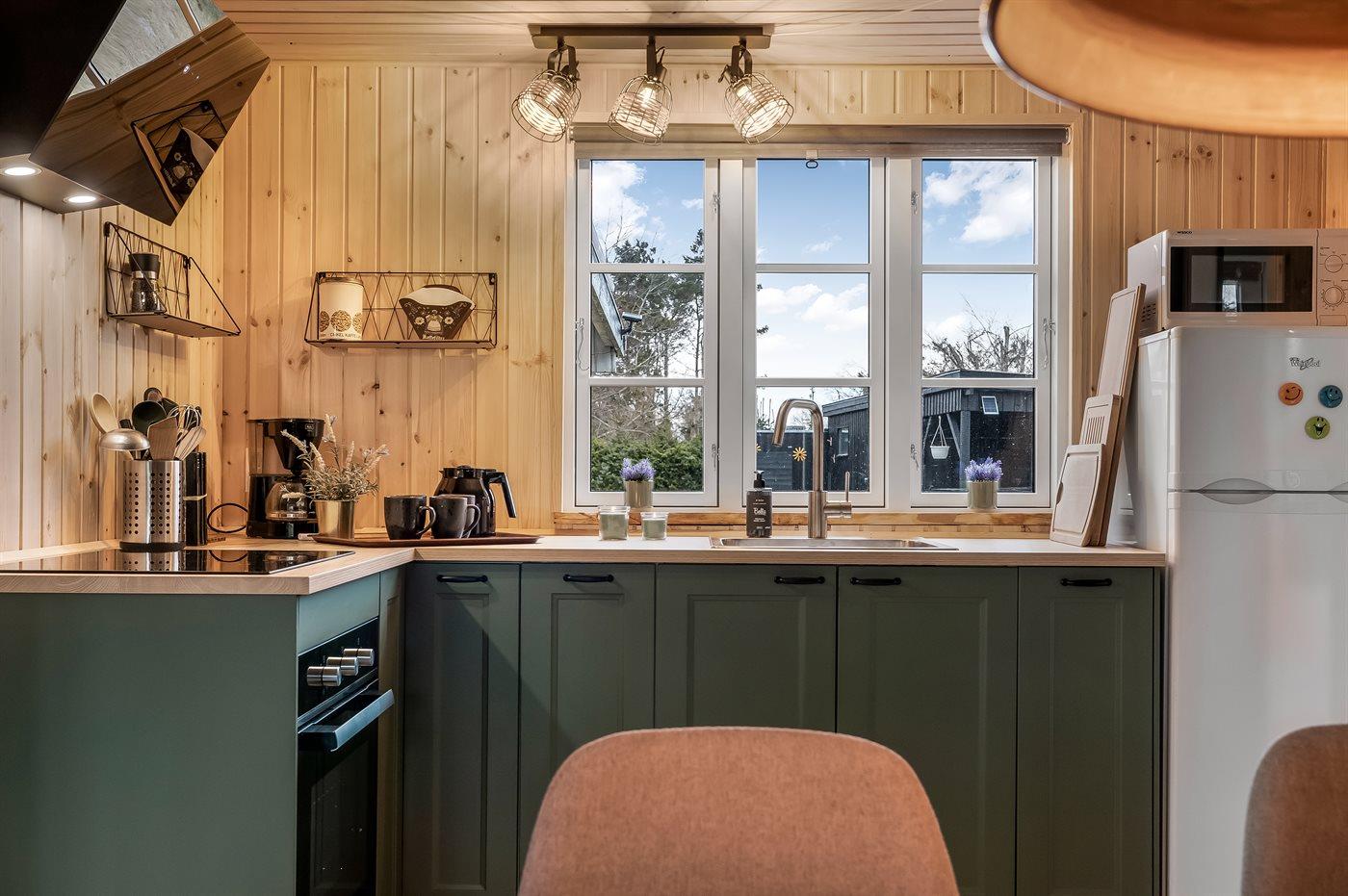 Die Küche ist mit einem Kühlschrank mit kleinem Gefrierfach ausgestattet. Außerdem gibt es 4 Induktions-Kochzonen, einen Umluftofen mit Airfryer-Funktion, eine Heißluftfritteuse und eine Mikrowelle.