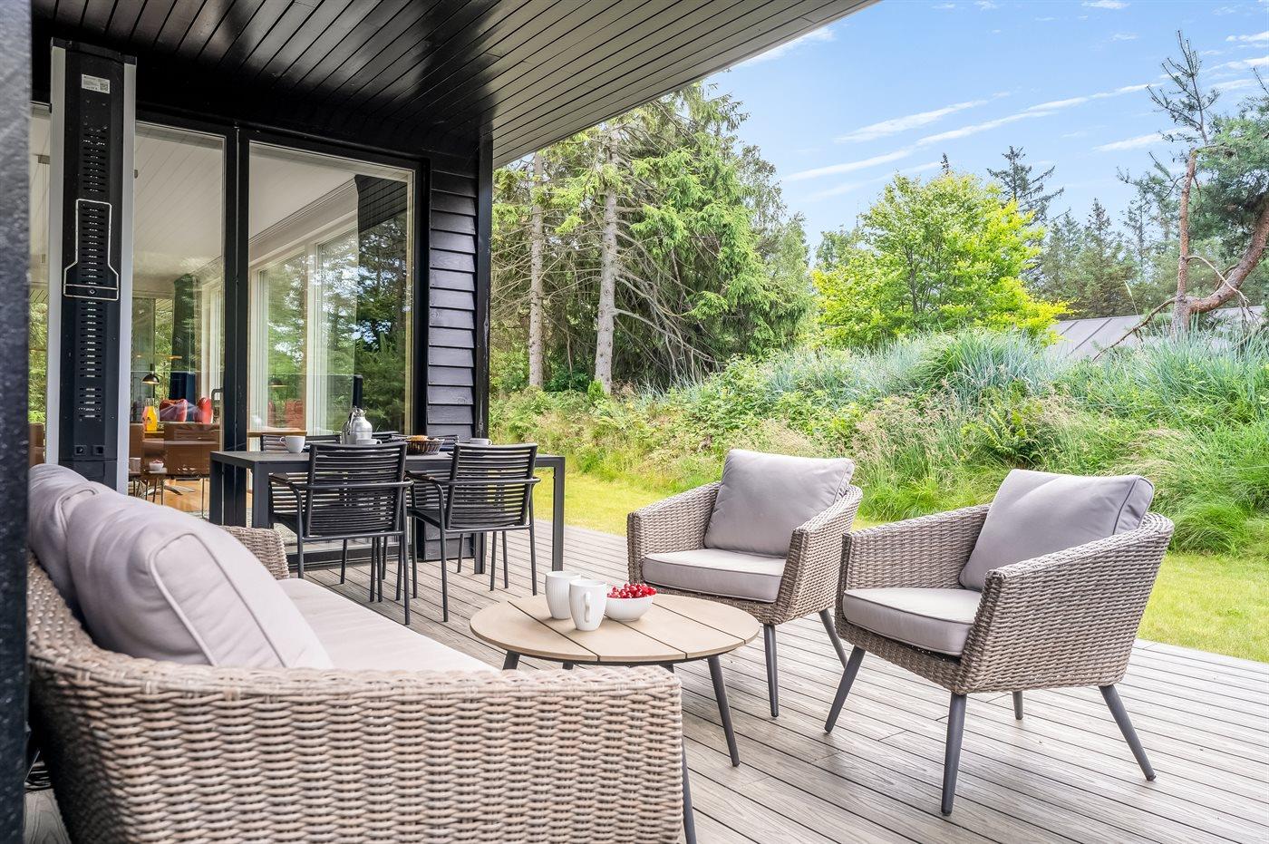 Die Ferienunterkunft liegt auf einem 1253 m² großen Gartengrundstück. Die Entfernung zum Meer beträgt 450 m. Die Entfernung zum Fjord beträgt 2220 m. Die nächste Einkaufsmöglichkeit liegt 2250 m entfernt. In einem Abstand von 1690 m gibt es einen Golfplatz. Es steht ein offenes Terrassenareal zur Verfügung. Außerdem gibt es überdachte Terrasse. Es steht ein Grill zur Verfügung. Parkplatz auf dem Grundstück.