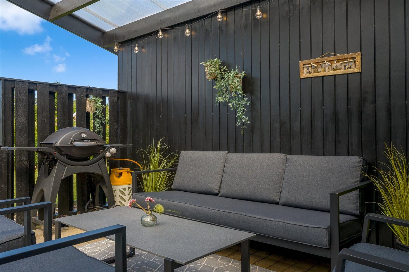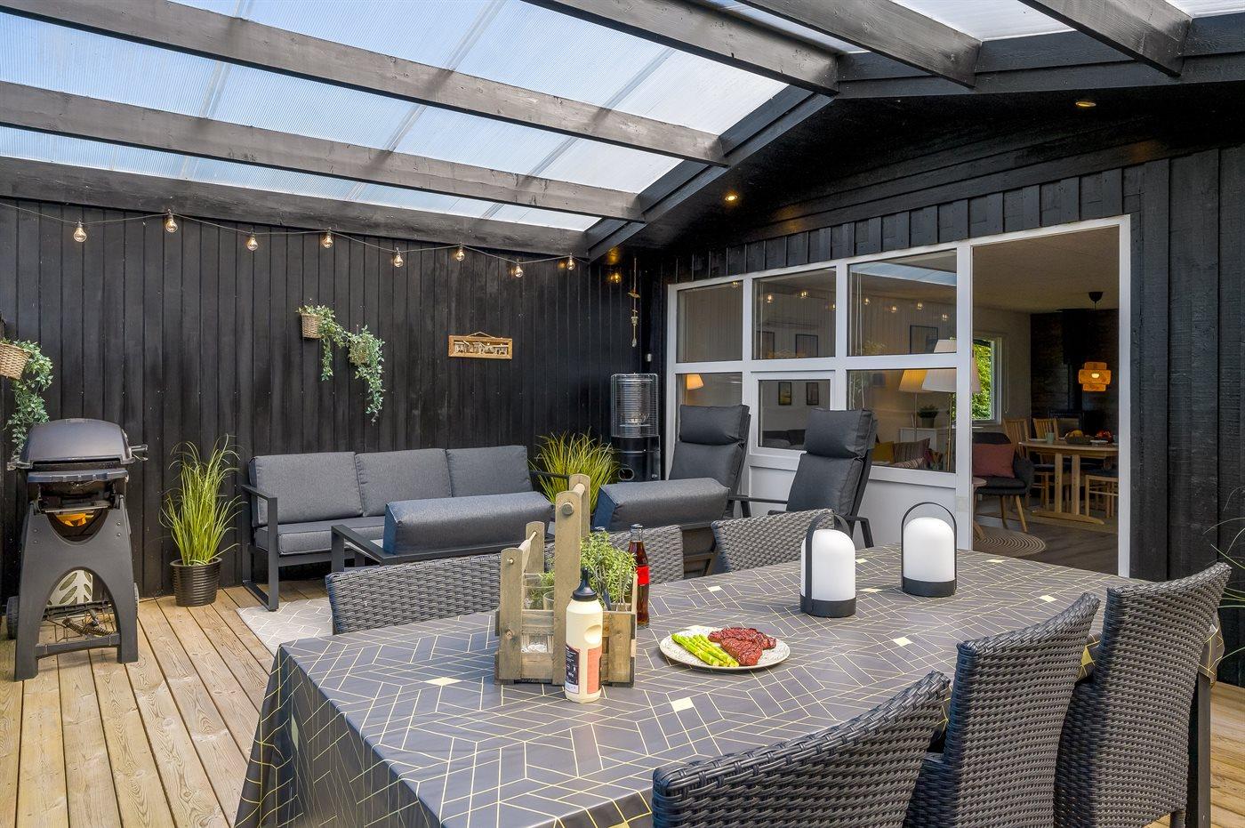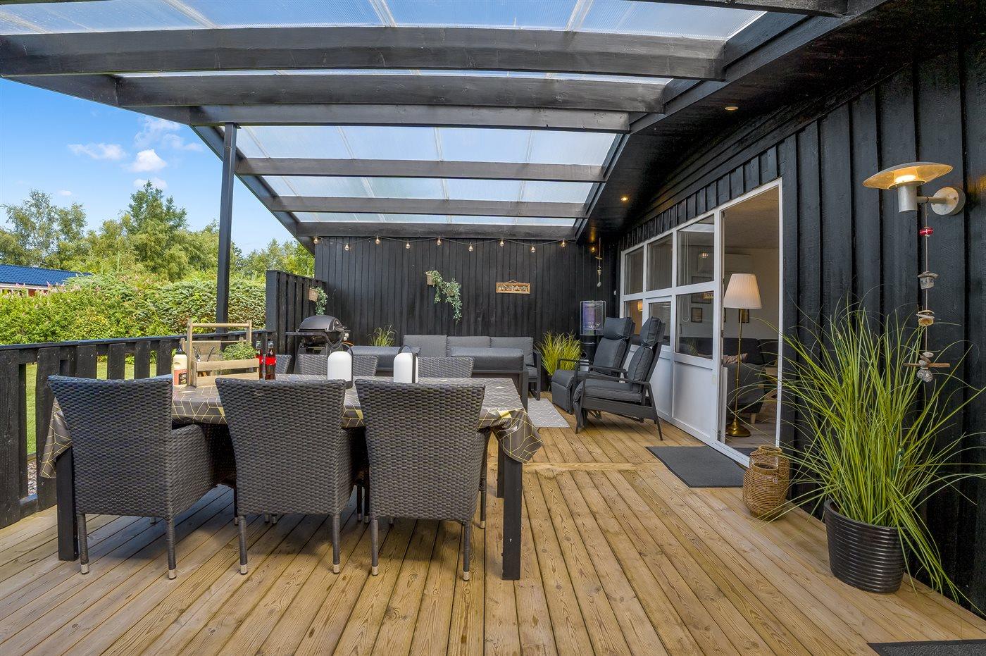 Gemütliches und einladendes Ferienhaus mit einer fantastischen und charmanten überdachten Terrasse, auf der du deinen Urlaub windgeschützt und in Ruhe genießen kannst – ganz egal bei welchem Wetter.