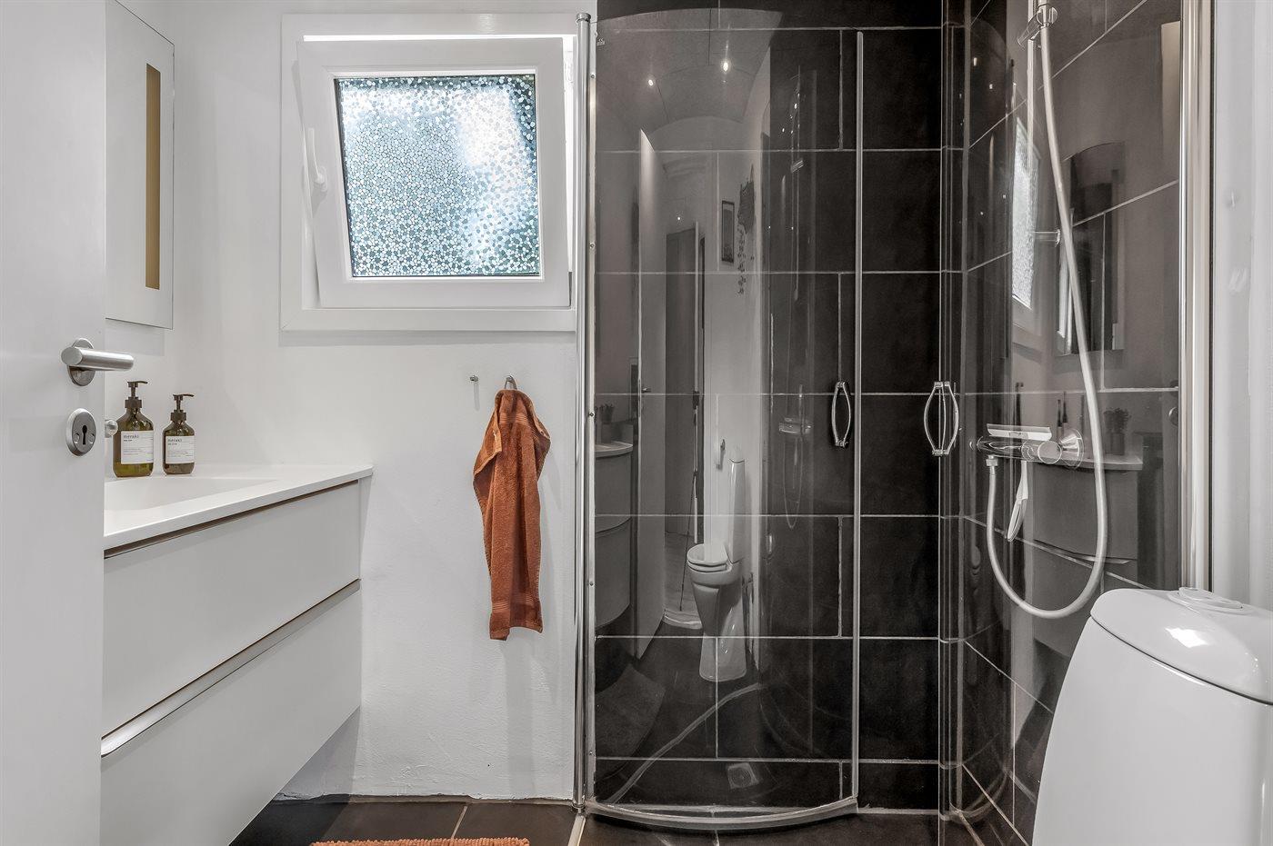 Es gibt 1 Badezimmer mit Duschnische und 2 Toiletten, davon 1 Gästetoilette. Fußbodenheizung in 1 Badezimmer.