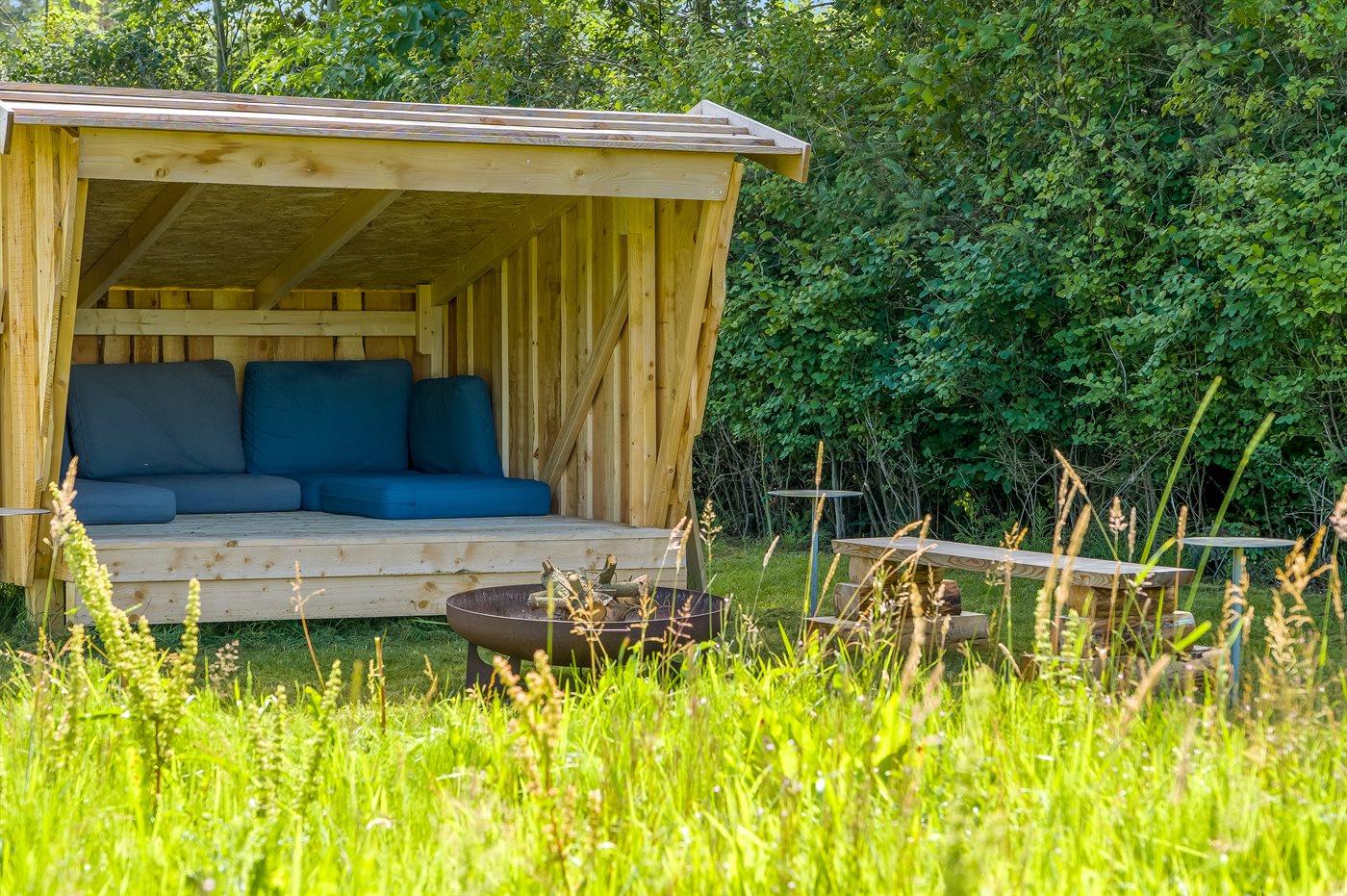 Hinter dem Haus findest du eine große offene Terrasse mit viel Platz zum Entspannen, Sonnenbaden oder für gemütliche Abendessen. Im Garten gibt es außerdem sowohl einen Shelter als auch eine Feuerstelle, was dir authentische Erlebnisse unter freiem Himmel ermöglicht.