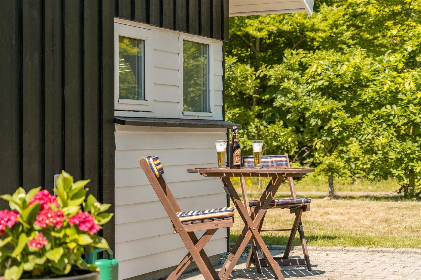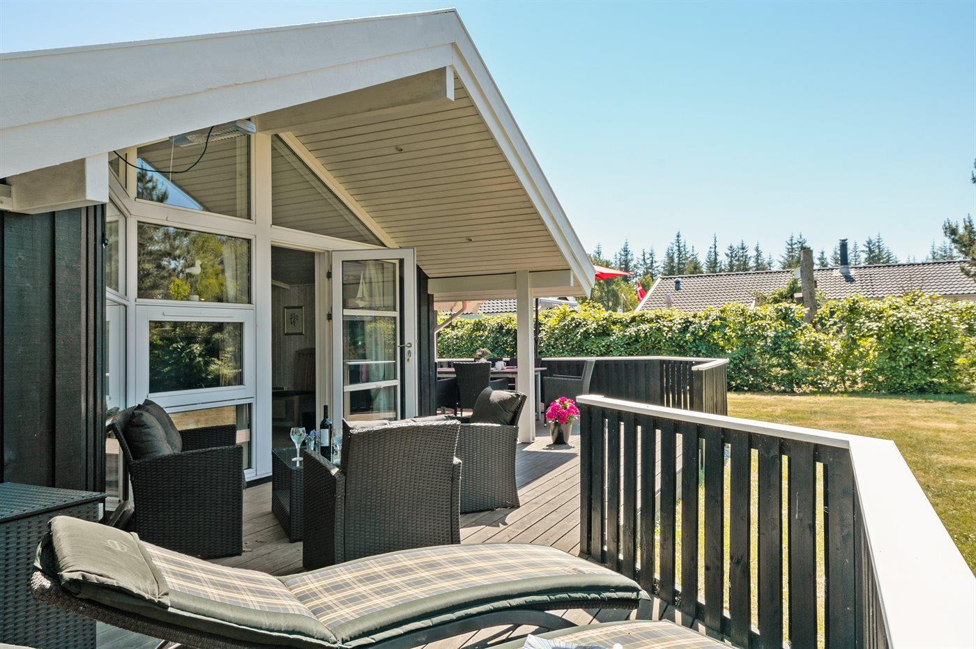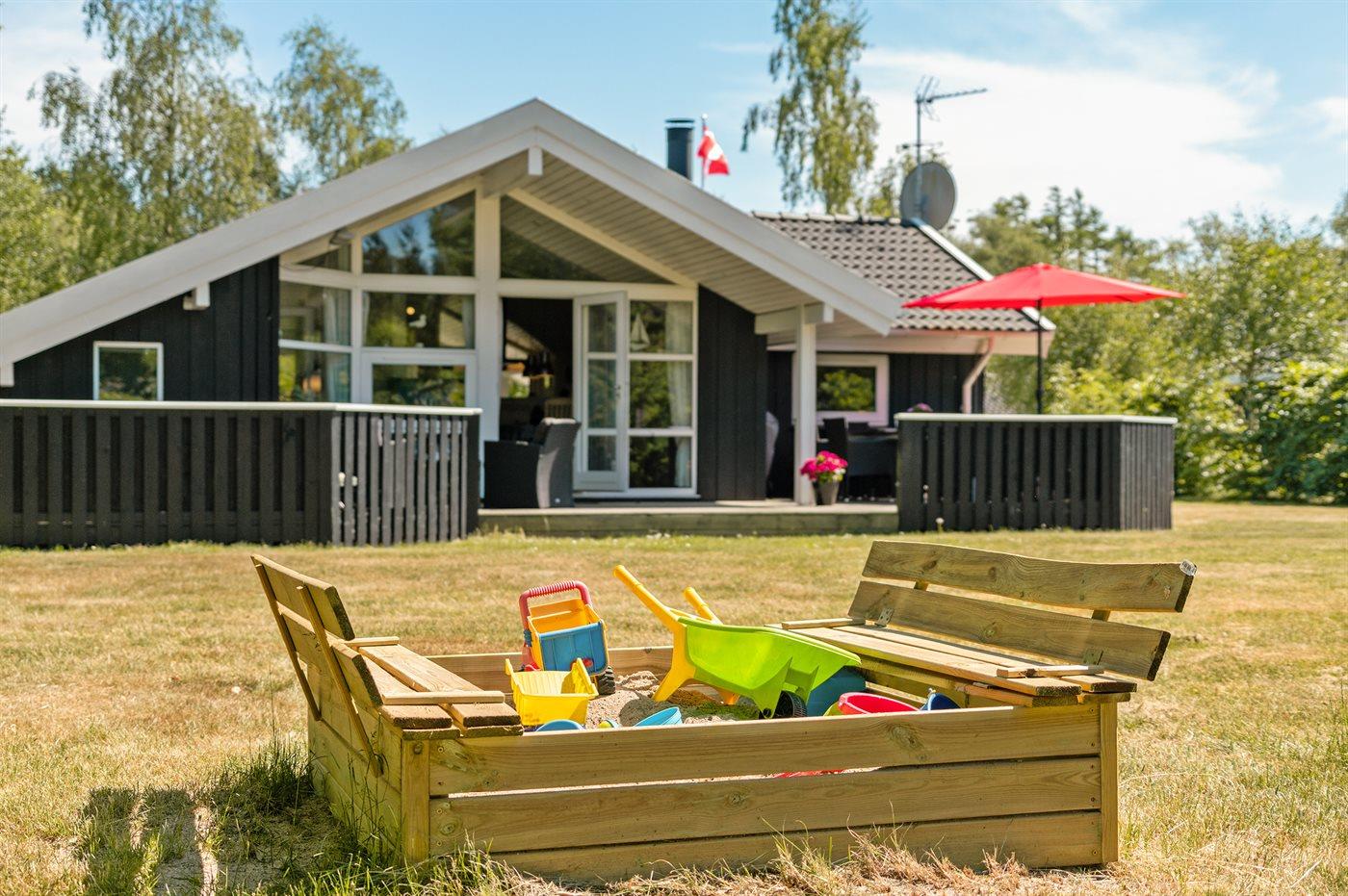 Sehr schönes Ferienhaus in Holz, mit einem Alkoven im Wohnzimmer. Große, teilweise überdachte Terrassen nach Ost, Süd und West mit Gartenmöbeln und Sonnenliegen. Das Grundstück ist groß mit Rasen, Schaukel und Sandkasten für die Kinder.