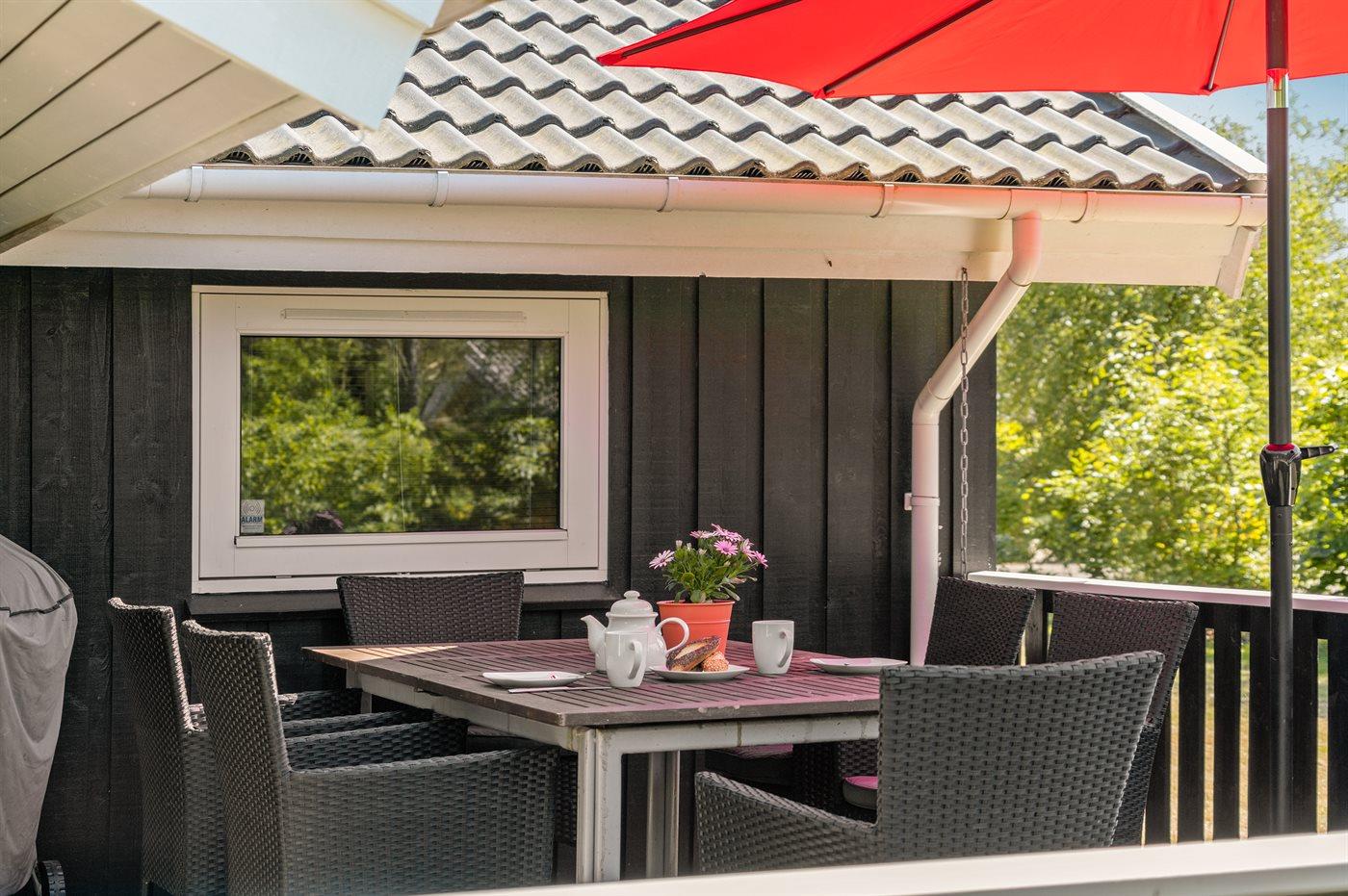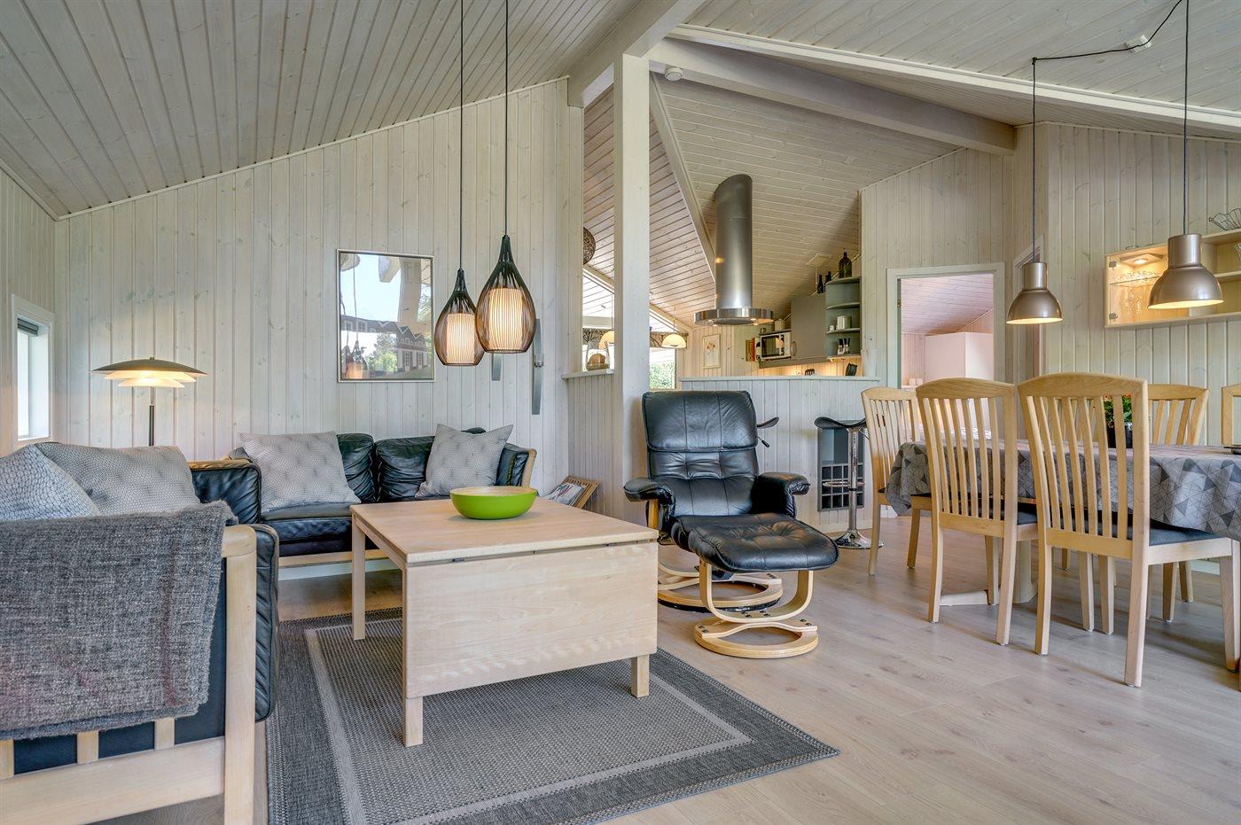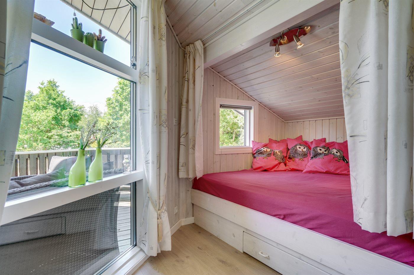 Sehr schönes Ferienhaus in Holz, mit einem Alkoven im Wohnzimmer. Große, teilweise überdachte Terrassen nach Ost, Süd und West mit Gartenmöbeln und Sonnenliegen. Das Grundstück ist groß mit Rasen, Schaukel und Sandkasten für die Kinder.