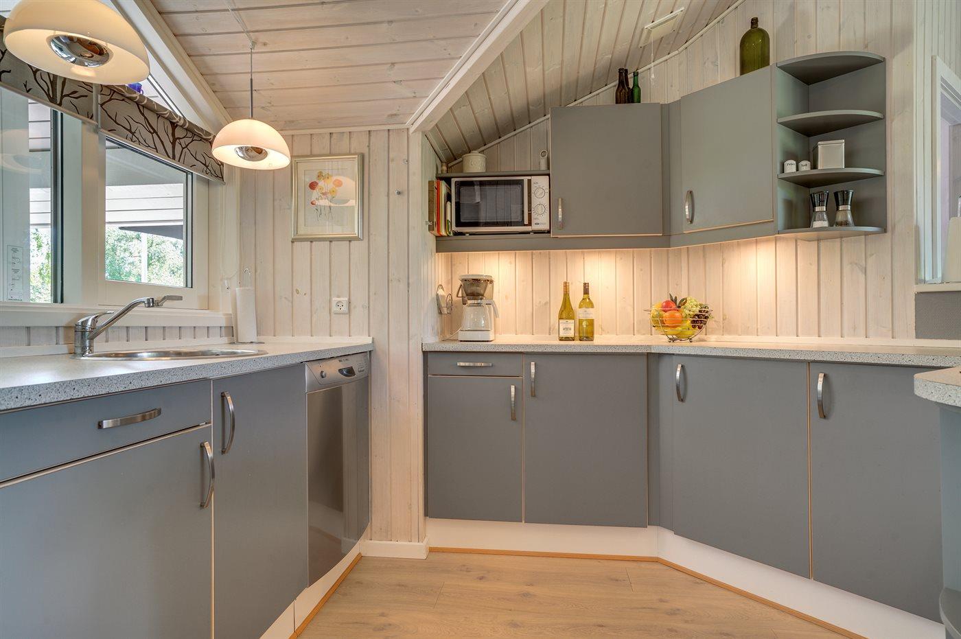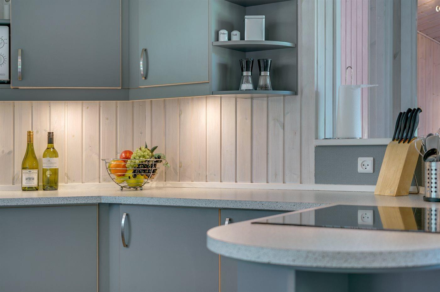 Die Küche ist mit Kühlschrank ausgestattet. Außerdem gibt es 4 Induktions-Kochzonen, Umluftofen, Mikrowelle sowie Geschirrspüler.