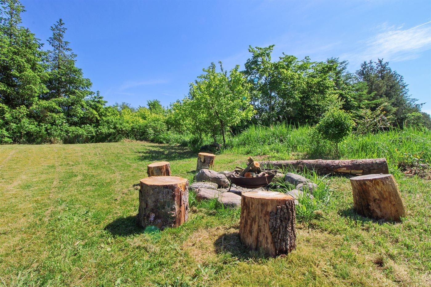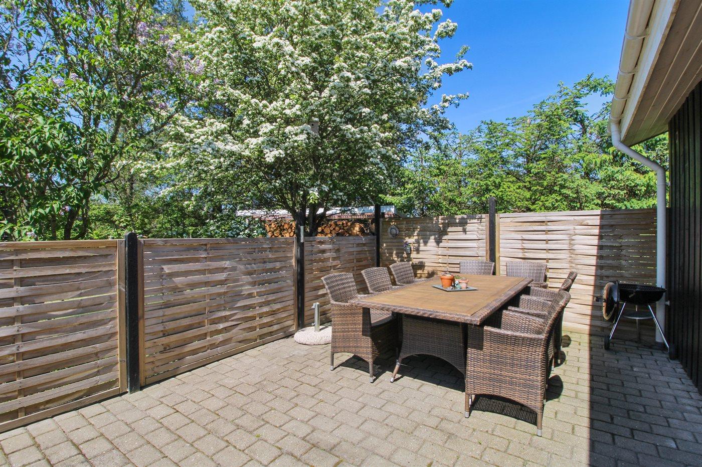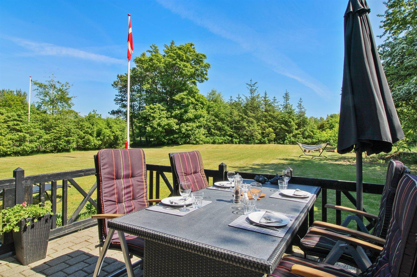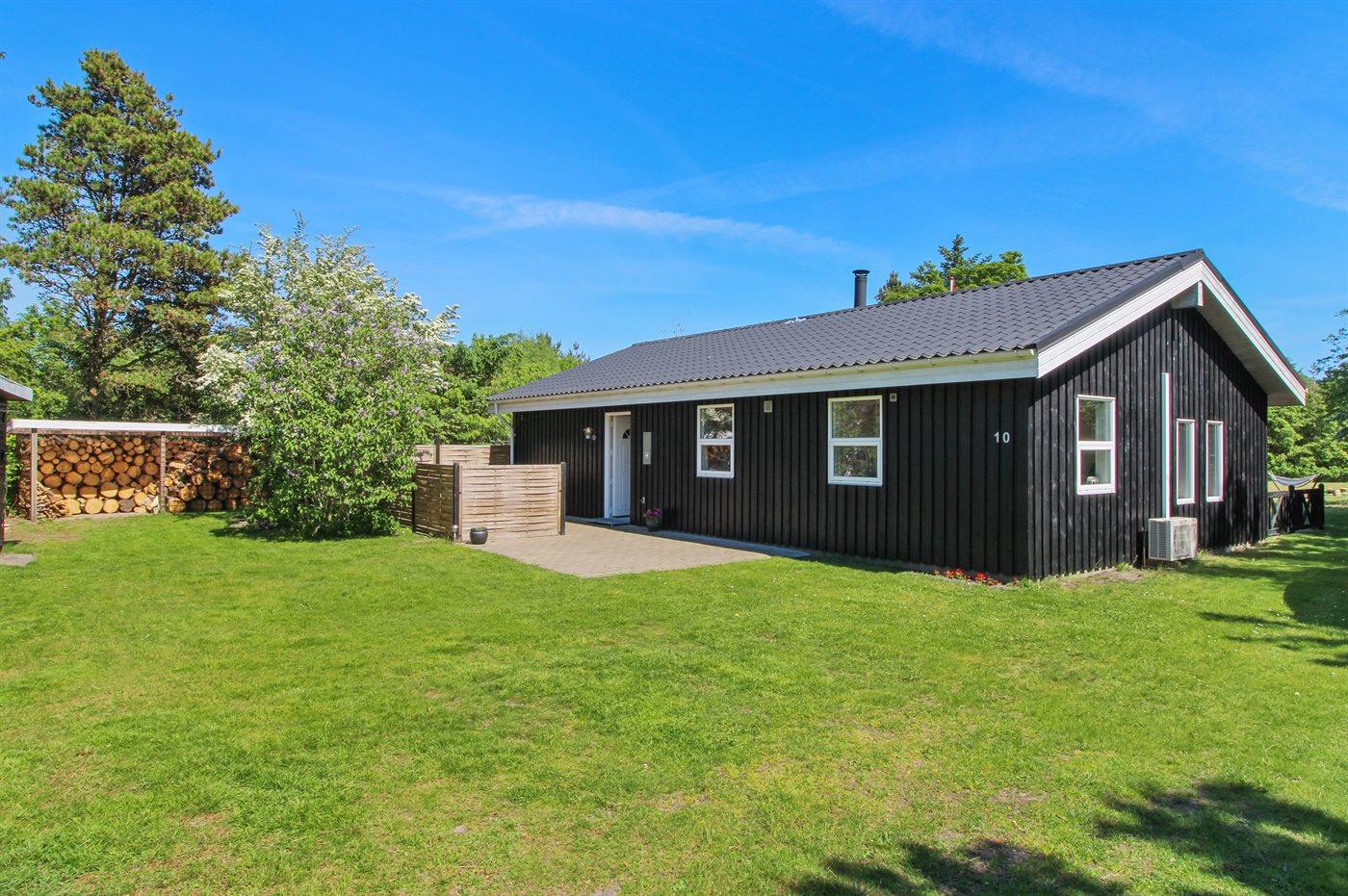 Gemütliches und schönes Ferienhaus in Holz, auf einem Naturgrundstück, ca. 700 m vom Sandbadestrand gelegen. Grosse Terrasse mit Gartenmöbeln, Sonnenliegen und Grill.