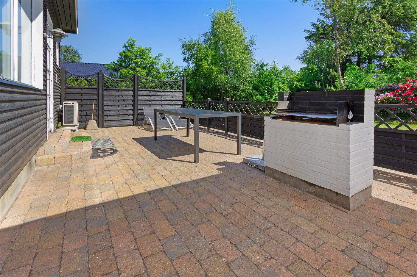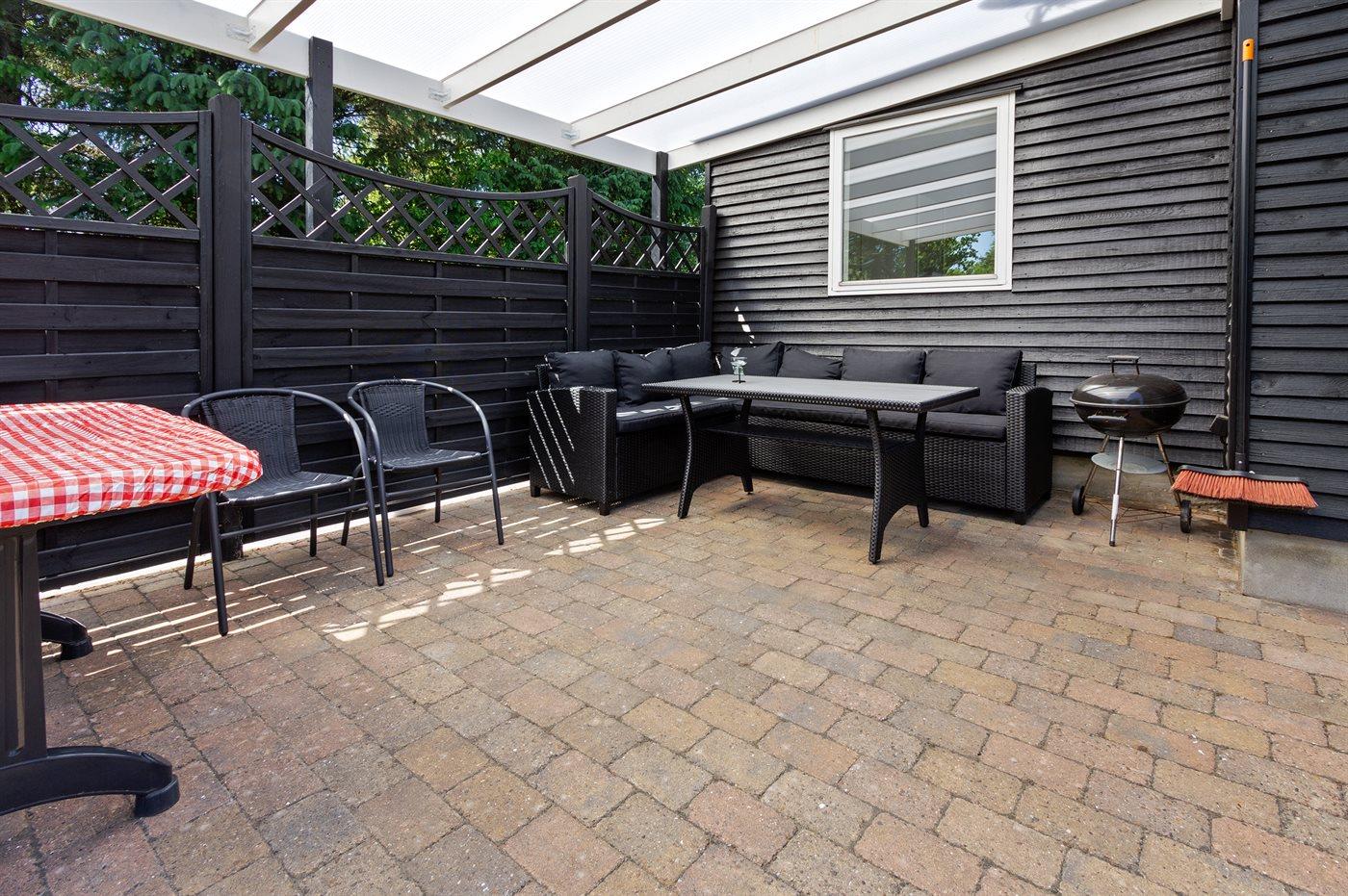 Grosse, abgeschlossene Terrasse mit Gartenmöbeln, Sonnenliegen und Grill.