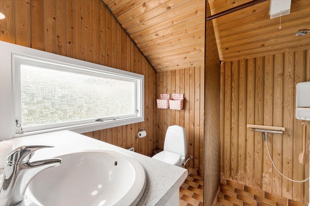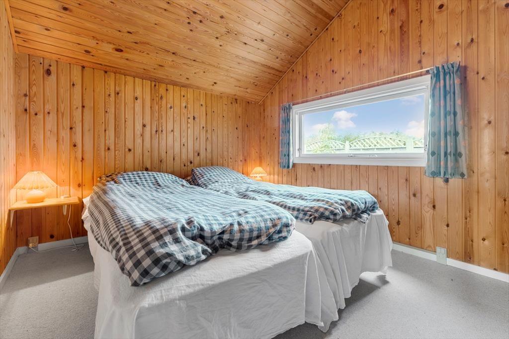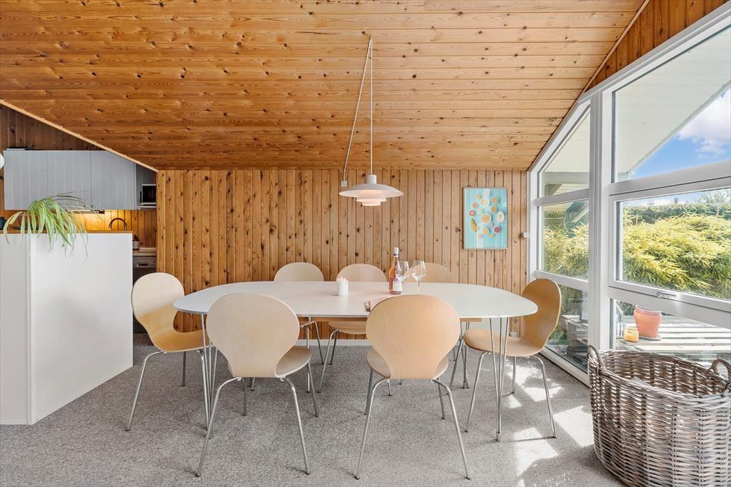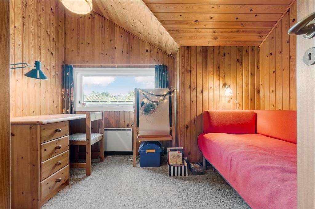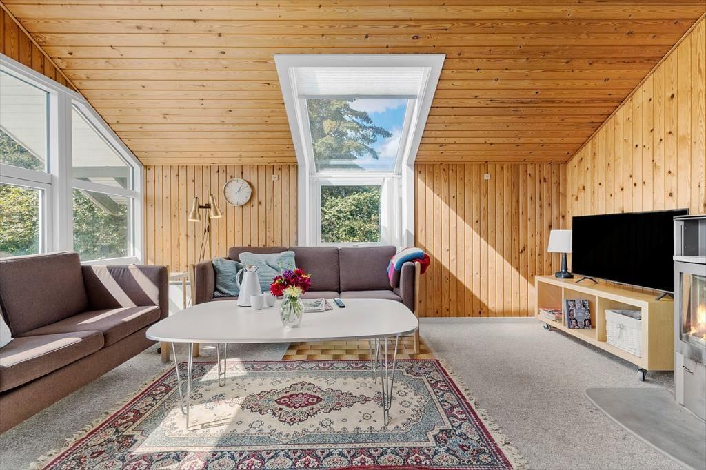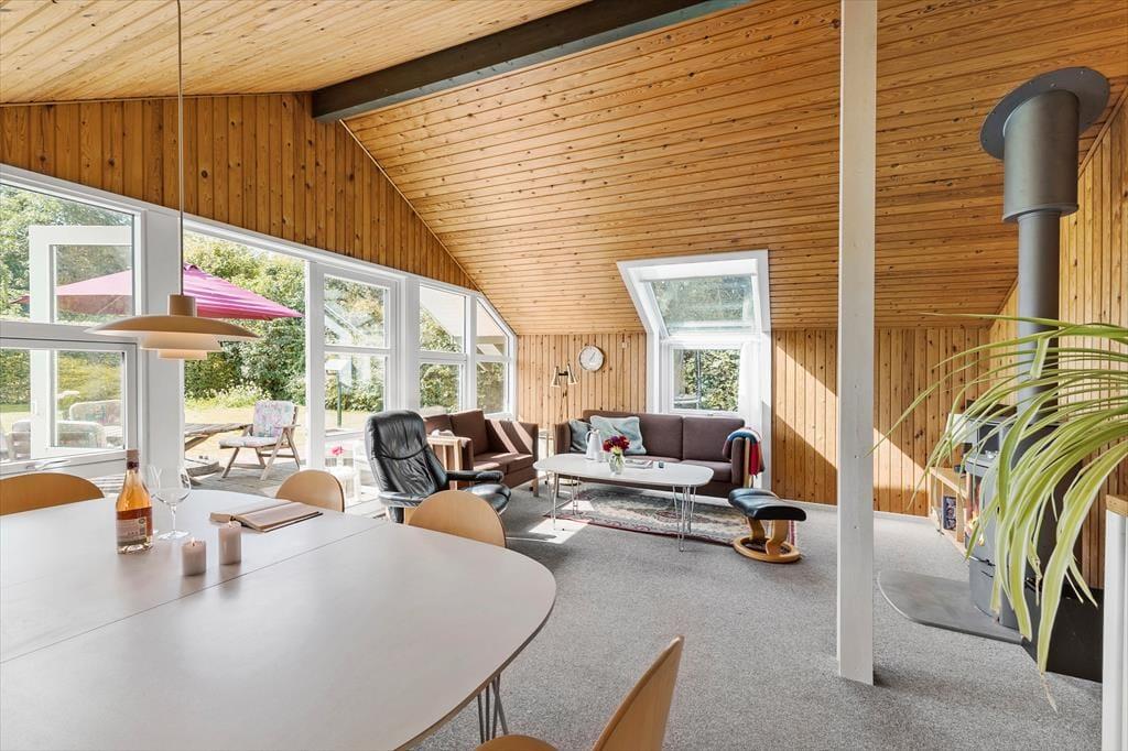 Willkommen in deinem Ferienhaus: Das Ferienhaus ist mit einer kombinierten Küche und einem Wohnzimmer eingerichtet. Die helle Küche verfügt über einen Fliesenboden, einen eingebauten Ofen, Kochplatten, Geschirrspüler, Mikrowelle und Kühlschrank. Das Wohnzimmer hat eine hohe Decke, einen Zugang zur teils überdachten Terrasse und eine große Fensterfront zur Terrasse, die für viel Licht im Haus sorgt. Zudem gibt es eine gemütliche Essecke, Sofas, einen Sessel und einen Smart-TV mit integriertem Chromecast, der Zugang zu Streamingdiensten bietet (eigene Anmeldung erforderlich). Das Badezimmer ist mit Fliesenboden, einer Duschkabine und einer Waschmaschine ausgestattet. Es gibt drei Schlafzimmer: eines mit einem Doppelbett (zwei zusammengestellte Einzelbetten), eines mit einem Einzelbett und das dritte mit einem Etagenbett. Zusätzlich steht ein Abstellraum mit Gefrierschrank zur Verfügung. Beheizt wird das Haus mit einer Wärmepumpe, einem Kaminofen und Elektroheizung.
