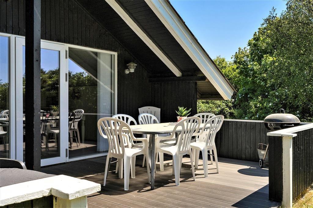 Die bereits erwähnte Ostterrasse lädt zu einem gemütlichen Frühstück in der Morgensonne ein. Später am Tag werden Sie sich gern auf der teilweise überdachten Westterrasse aufhalten, von der Sie auf die Grasfläche und die Schaukel im Garten blicken. Das Grundstück ist zu mehreren Seiten von Heckenrosen und anderer Randbepflanzung umgeben, wodurch Sie angenehm geschützt und schön wohnen und in aller Ruhe einen langen Urlaubstag mit einem gemütlichen Abendessen vom Grill ausklingen lassen können.
