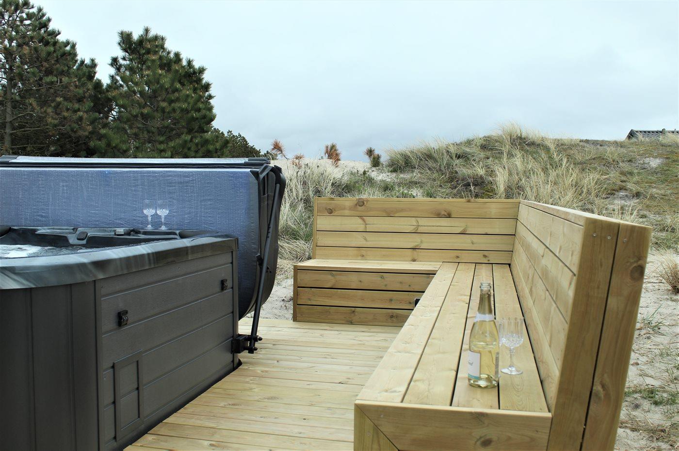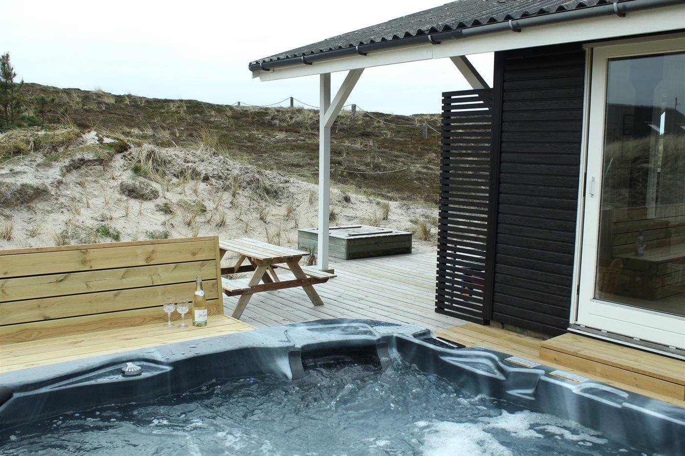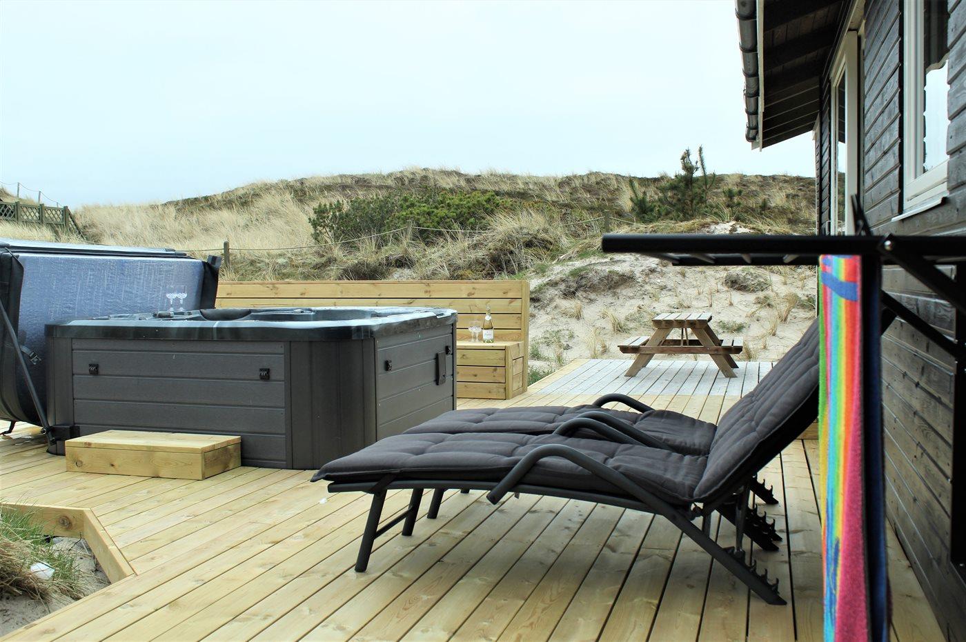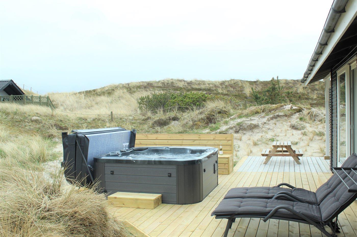 Im schönen Outdoor-Whirlpool kann man sich sowohl im Sommer als auch im Winter entspannen und dabei den Sternenhimmel betrachten. Außerdem gibt es eine Außendusche zum Duschen unter freiem Himmel. Auf der großen Holzterrasse findet sich so gut wie immer ein geschütztes Plätzchen, von dem man die Aussicht auf die hübsche Dünenlandschaft genießen kann.