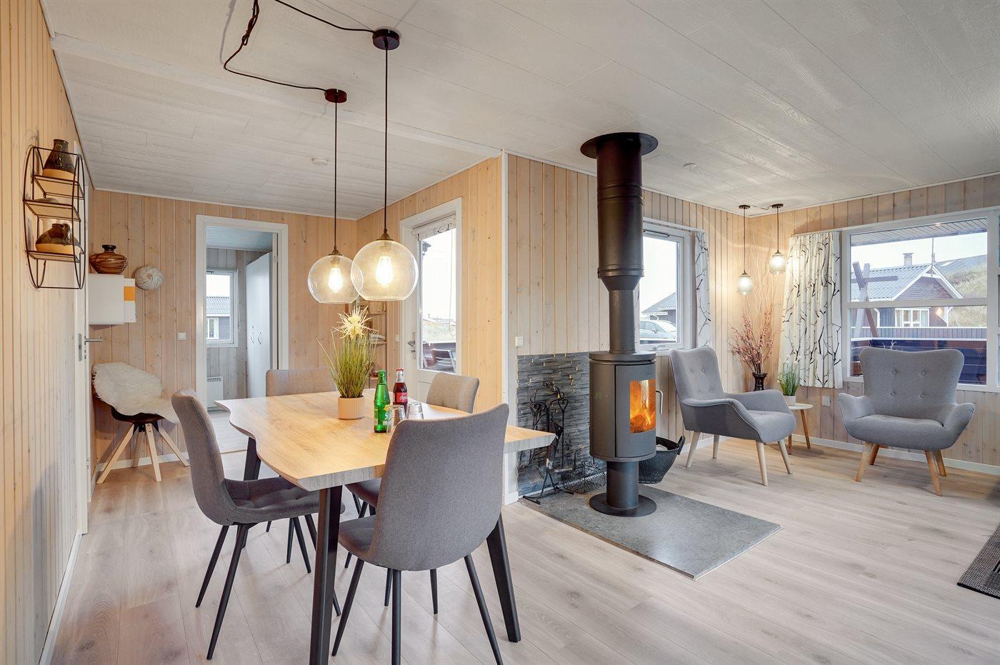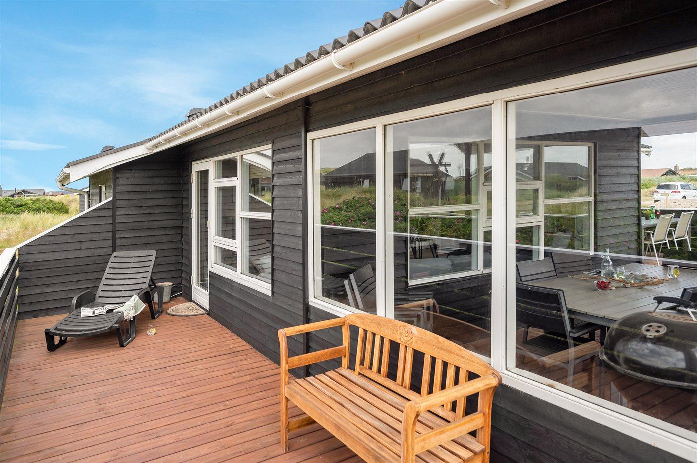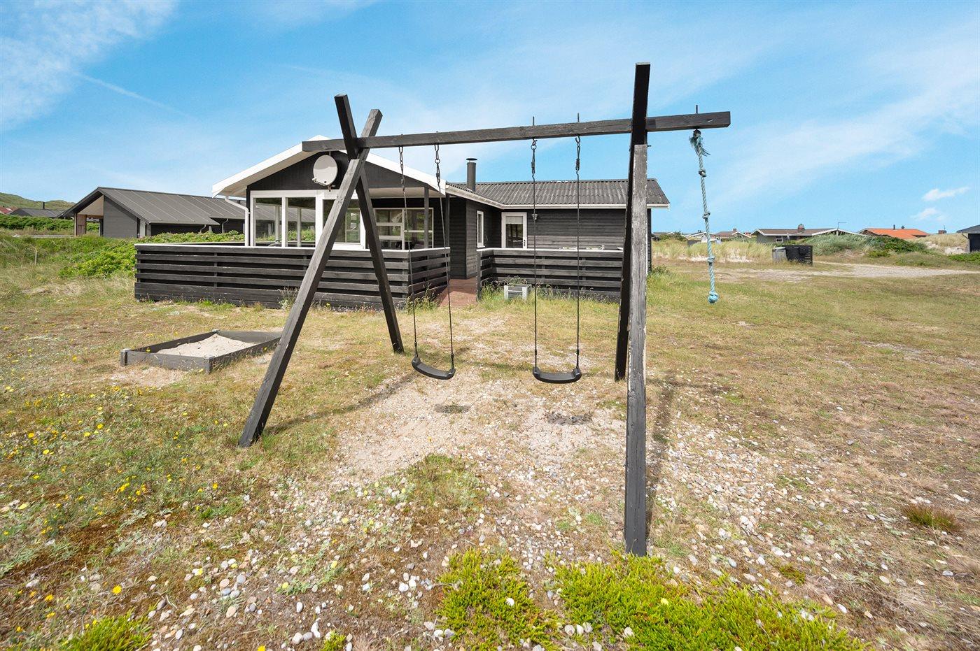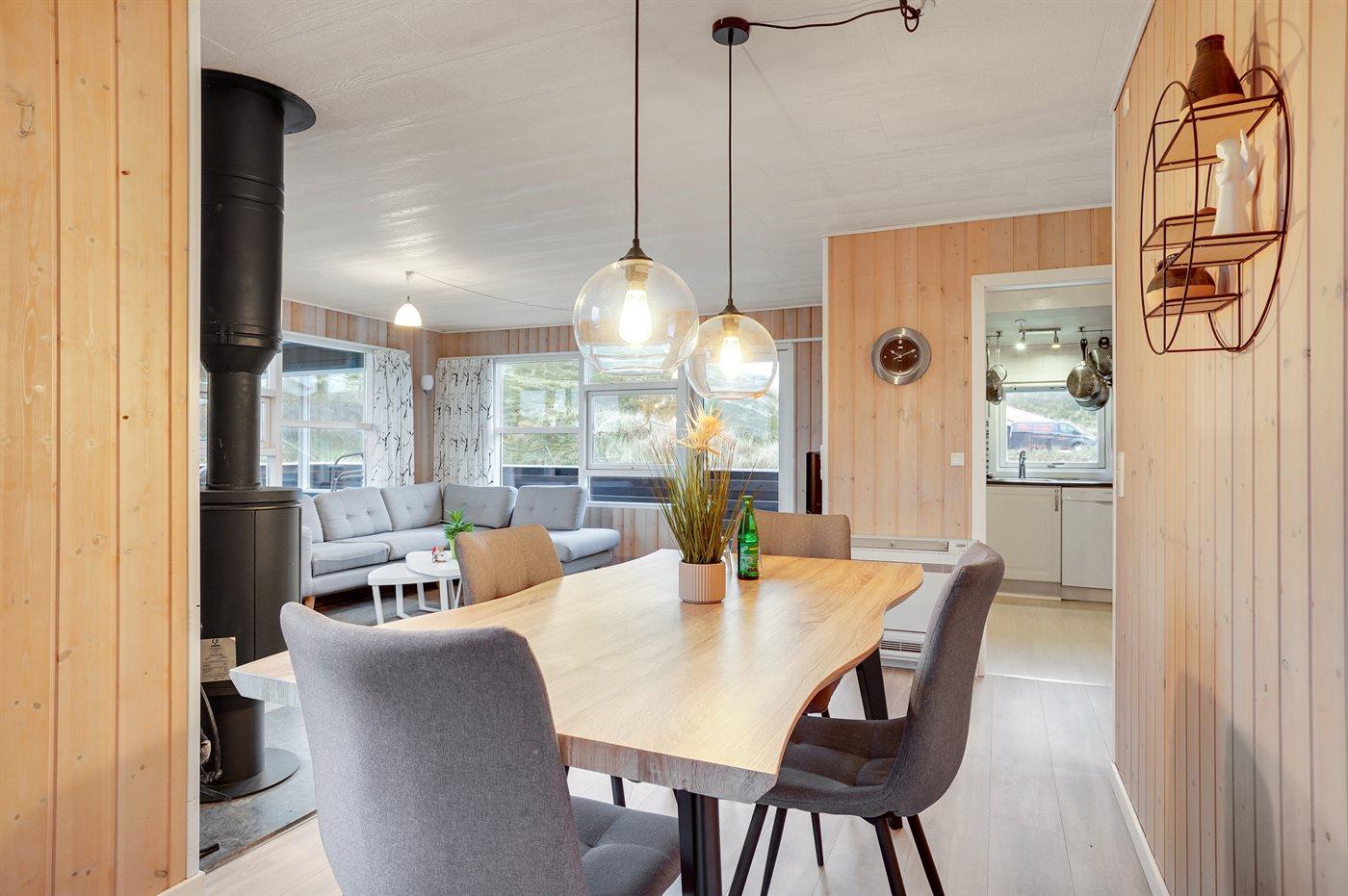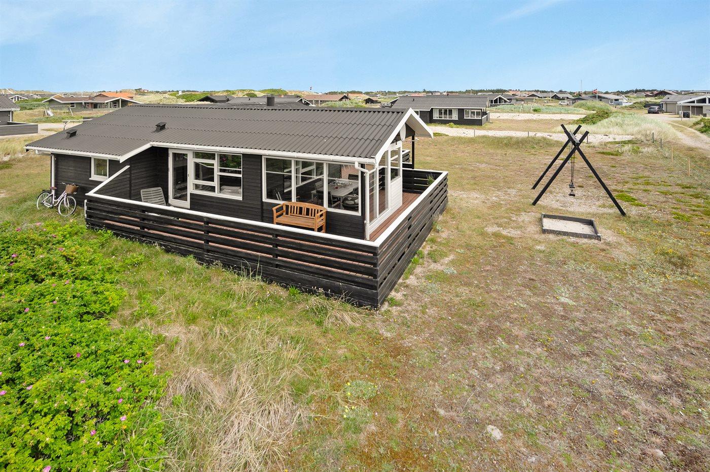 Älteres Ferienhaus aus Holz, 1976 gebaut und laufend modernisiert. Das Haus ist auf einem Dünen-/Naturgrundstück nur 200 m vom Wasser gelegen. Sowohl offenes als auch überdachtes Terrassenareal mit Gartenmöbeln. Holzdecken und -wände. Teppichböden, jedoch PVC-Boden in der Küche und im Flur. Badezimmer mit Duschnische, Fußbodenheizung, Waschmaschine und Wäschetrockner. Gute Küche mit Geschirrspüler, Mikrowelle, Kühlschrank mit kleinem Gefrierfach und Herd mit Ceran-Feld. Das gemütliche Wohnzimmer enthält Kaminofen, Stereoanlage mit CD-Spieler, DVD-Spieler, TV mit digitalem Satellitenanschluss und Nintendo 64. 1 Schlafplatz in einem Einzelbett und 4 Schlafplätze in elektrisch verstellbaren Betten. An weiterer Ausstattung können kostenlose, kabellose Internetverbindung erwähnt werden (Computer ist mitzubringen) und es ist eine energiegerechte Wärmepumpe installiert. Kinderbett, Kinderhochstuhl, Sandkasten und Schaukel für die Kinder. Ein gutes Ferienhaus mit einer schönen Lage.