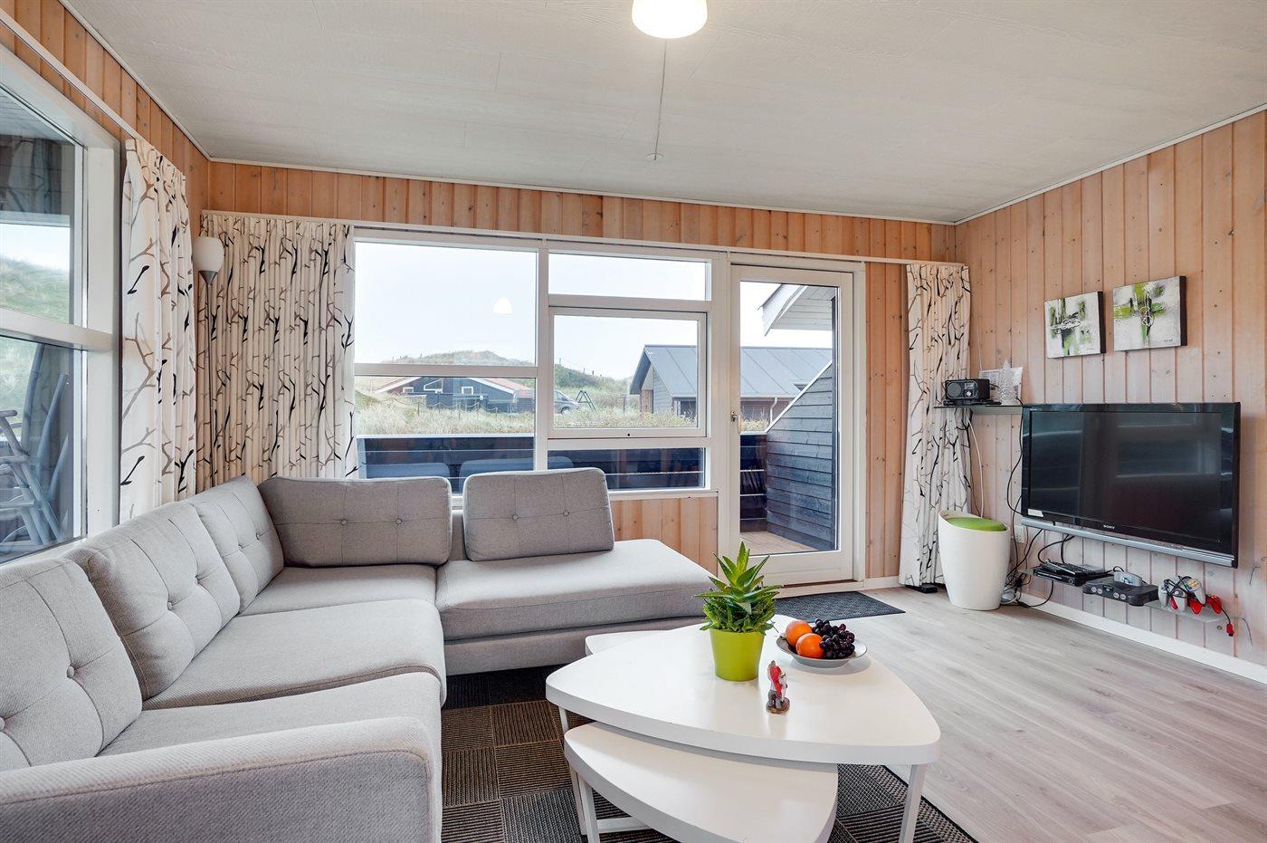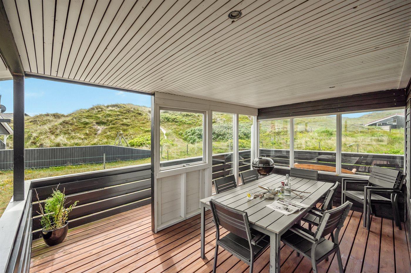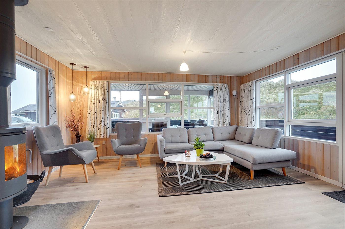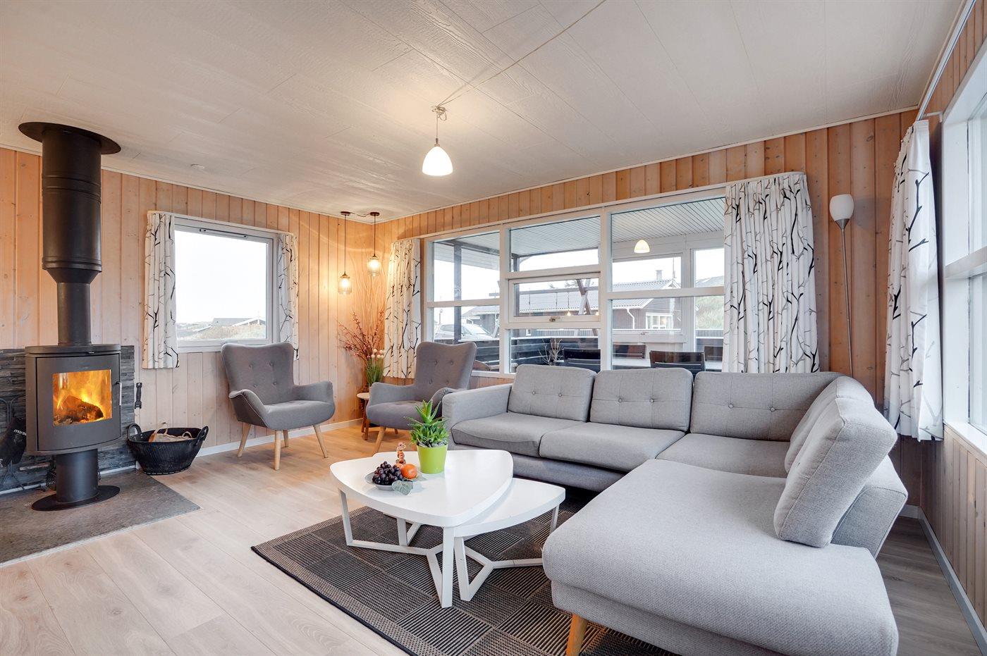 Älteres Ferienhaus aus Holz, 1976 gebaut und laufend modernisiert. Das Haus ist auf einem Dünen-/Naturgrundstück nur 200 m vom Wasser gelegen. Sowohl offenes als auch überdachtes Terrassenareal mit Gartenmöbeln. Holzdecken und -wände. Teppichböden, jedoch PVC-Boden in der Küche und im Flur. Badezimmer mit Duschnische, Fußbodenheizung, Waschmaschine und Wäschetrockner. Gute Küche mit Geschirrspüler, Mikrowelle, Kühlschrank mit kleinem Gefrierfach und Herd mit Ceran-Feld. Das gemütliche Wohnzimmer enthält Kaminofen, Stereoanlage mit CD-Spieler, DVD-Spieler, TV mit digitalem Satellitenanschluss und Nintendo 64. 1 Schlafplatz in einem Einzelbett und 4 Schlafplätze in elektrisch verstellbaren Betten. An weiterer Ausstattung können kostenlose, kabellose Internetverbindung erwähnt werden (Computer ist mitzubringen) und es ist eine energiegerechte Wärmepumpe installiert. Kinderbett, Kinderhochstuhl, Sandkasten und Schaukel für die Kinder. Ein gutes Ferienhaus mit einer schönen Lage.
