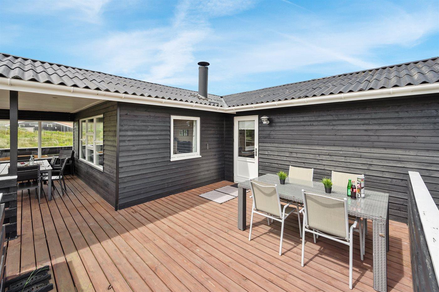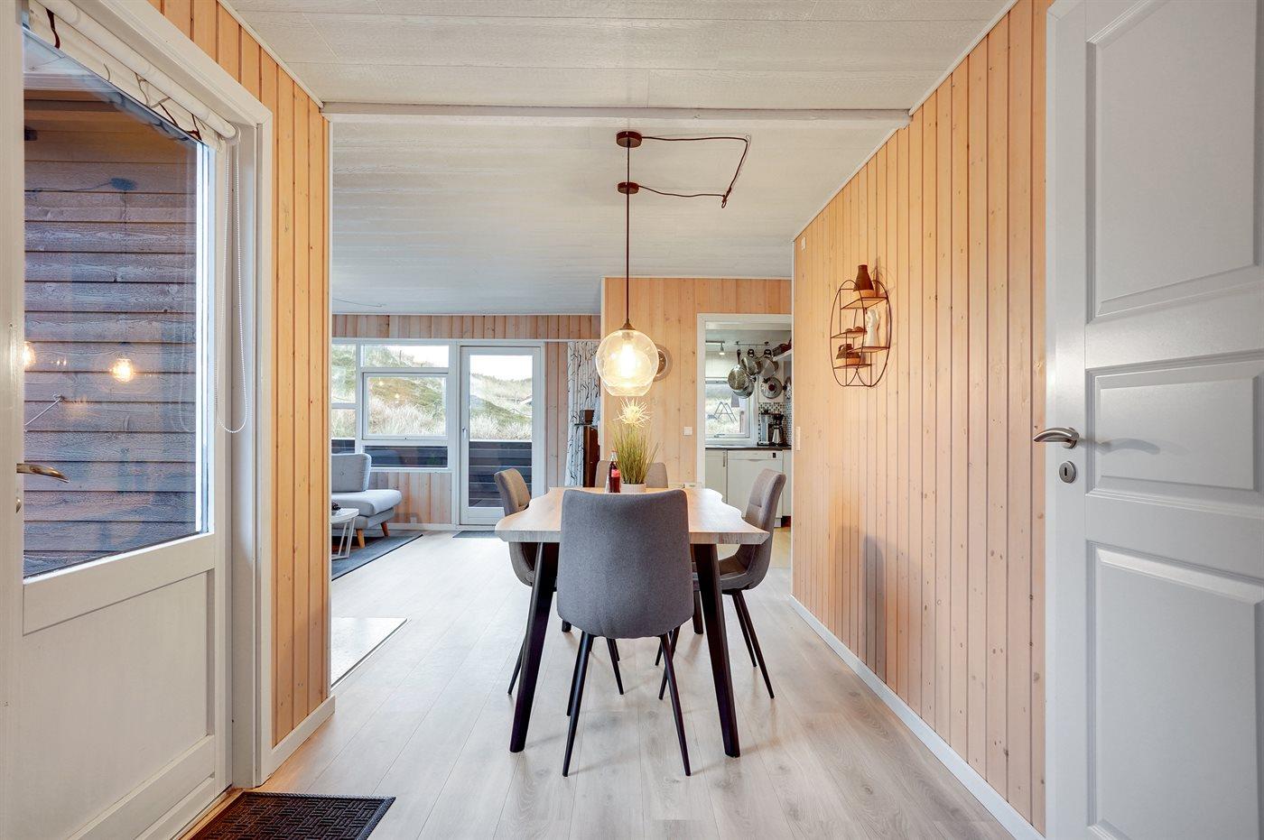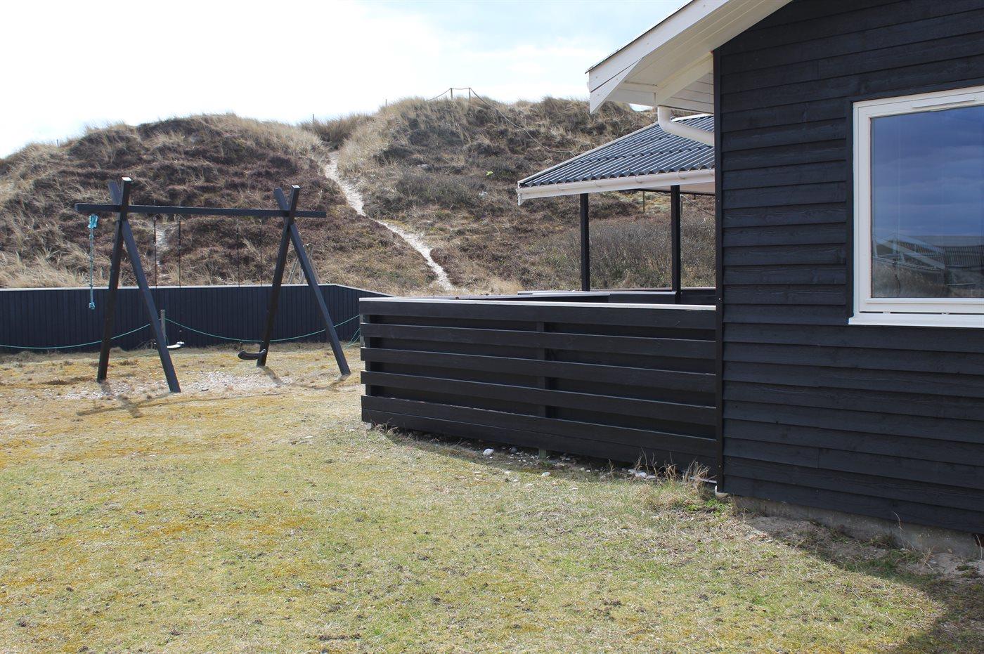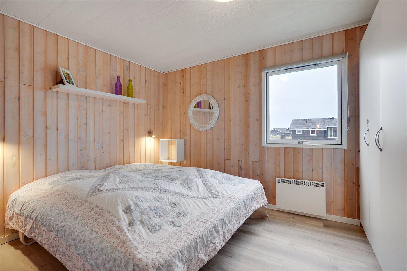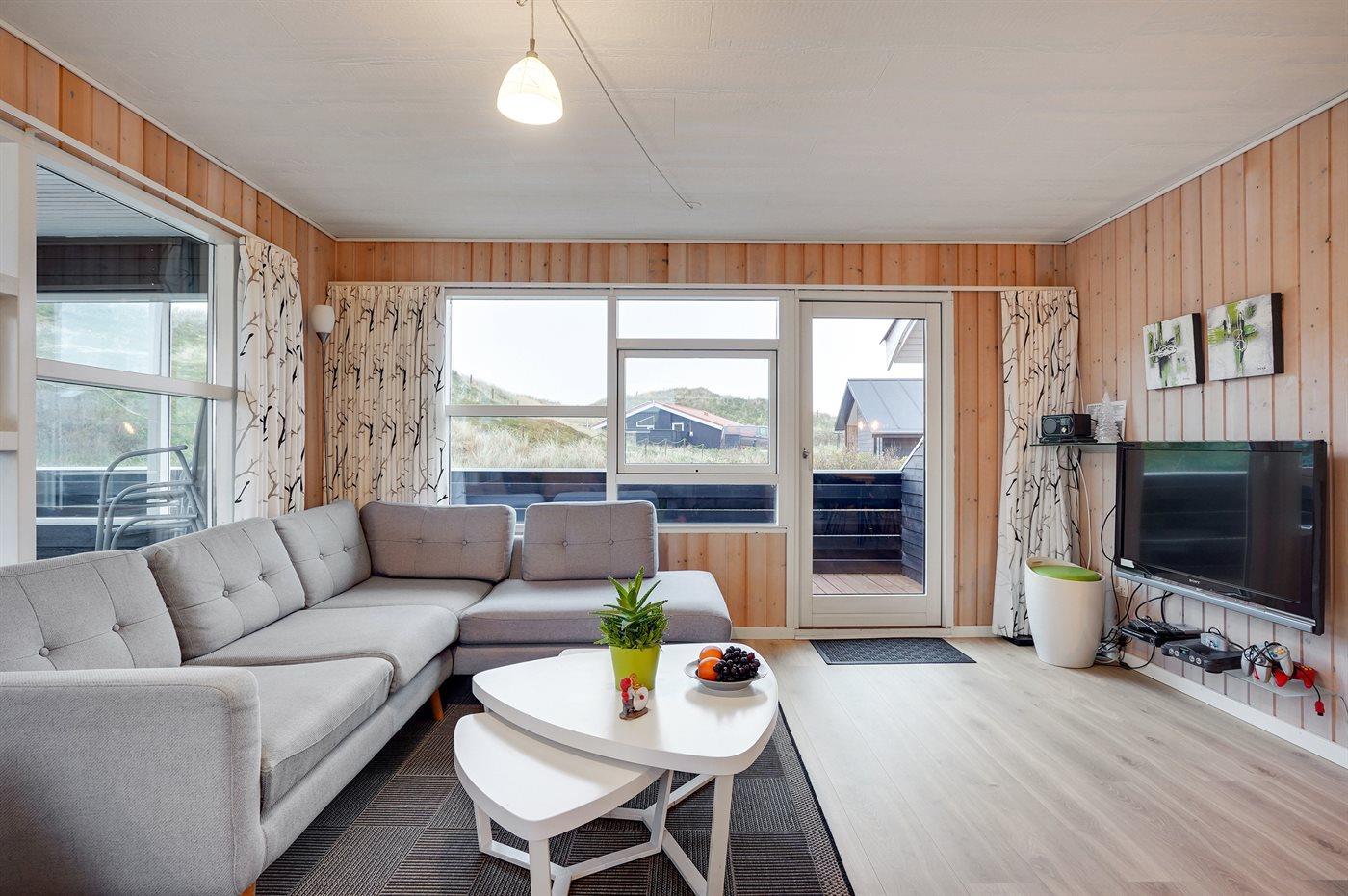 Älteres Ferienhaus aus Holz, 1976 gebaut und laufend modernisiert. Das Haus ist auf einem Dünen-/Naturgrundstück nur 200 m vom Wasser gelegen. Sowohl offenes als auch überdachtes Terrassenareal mit Gartenmöbeln. Holzdecken und -wände. Teppichböden, jedoch PVC-Boden in der Küche und im Flur. Badezimmer mit Duschnische, Fußbodenheizung, Waschmaschine und Wäschetrockner. Gute Küche mit Geschirrspüler, Mikrowelle, Kühlschrank mit kleinem Gefrierfach und Herd mit Ceran-Feld. Das gemütliche Wohnzimmer enthält Kaminofen, Stereoanlage mit CD-Spieler, DVD-Spieler, TV mit digitalem Satellitenanschluss und Nintendo 64. 1 Schlafplatz in einem Einzelbett und 4 Schlafplätze in elektrisch verstellbaren Betten. An weiterer Ausstattung können kostenlose, kabellose Internetverbindung erwähnt werden (Computer ist mitzubringen) und es ist eine energiegerechte Wärmepumpe installiert. Kinderbett, Kinderhochstuhl, Sandkasten und Schaukel für die Kinder. Ein gutes Ferienhaus mit einer schönen Lage.