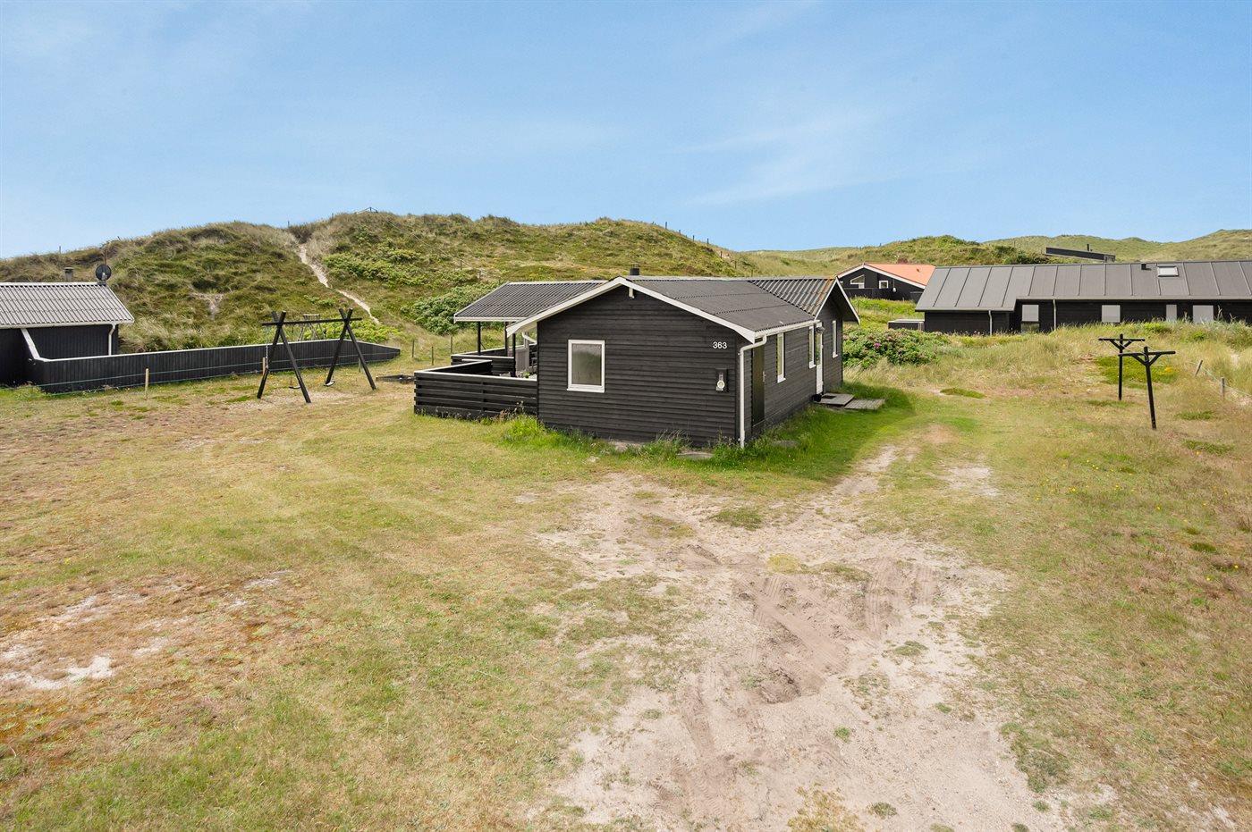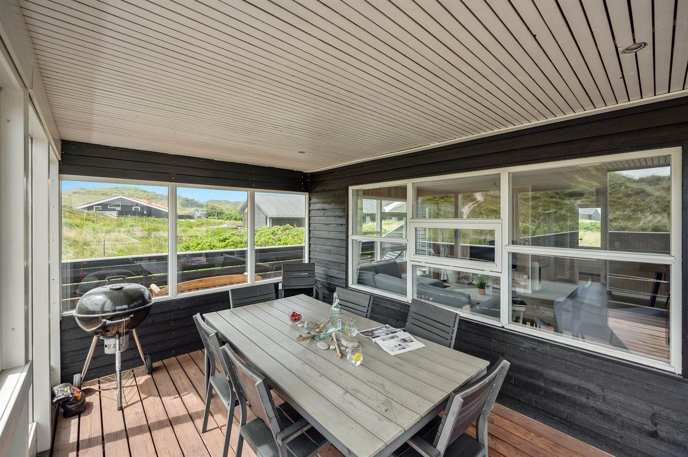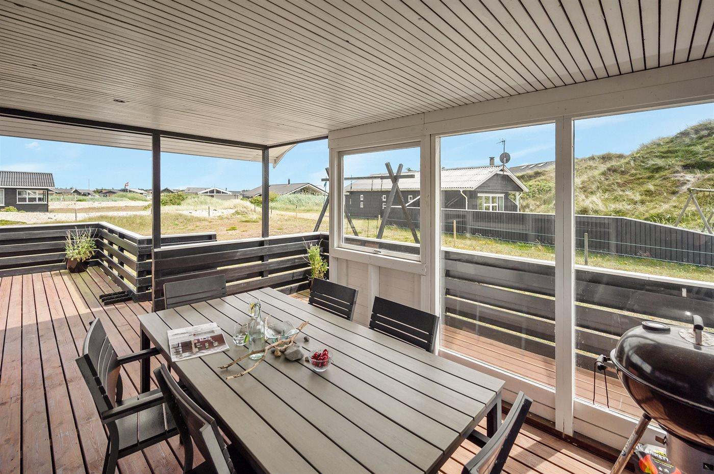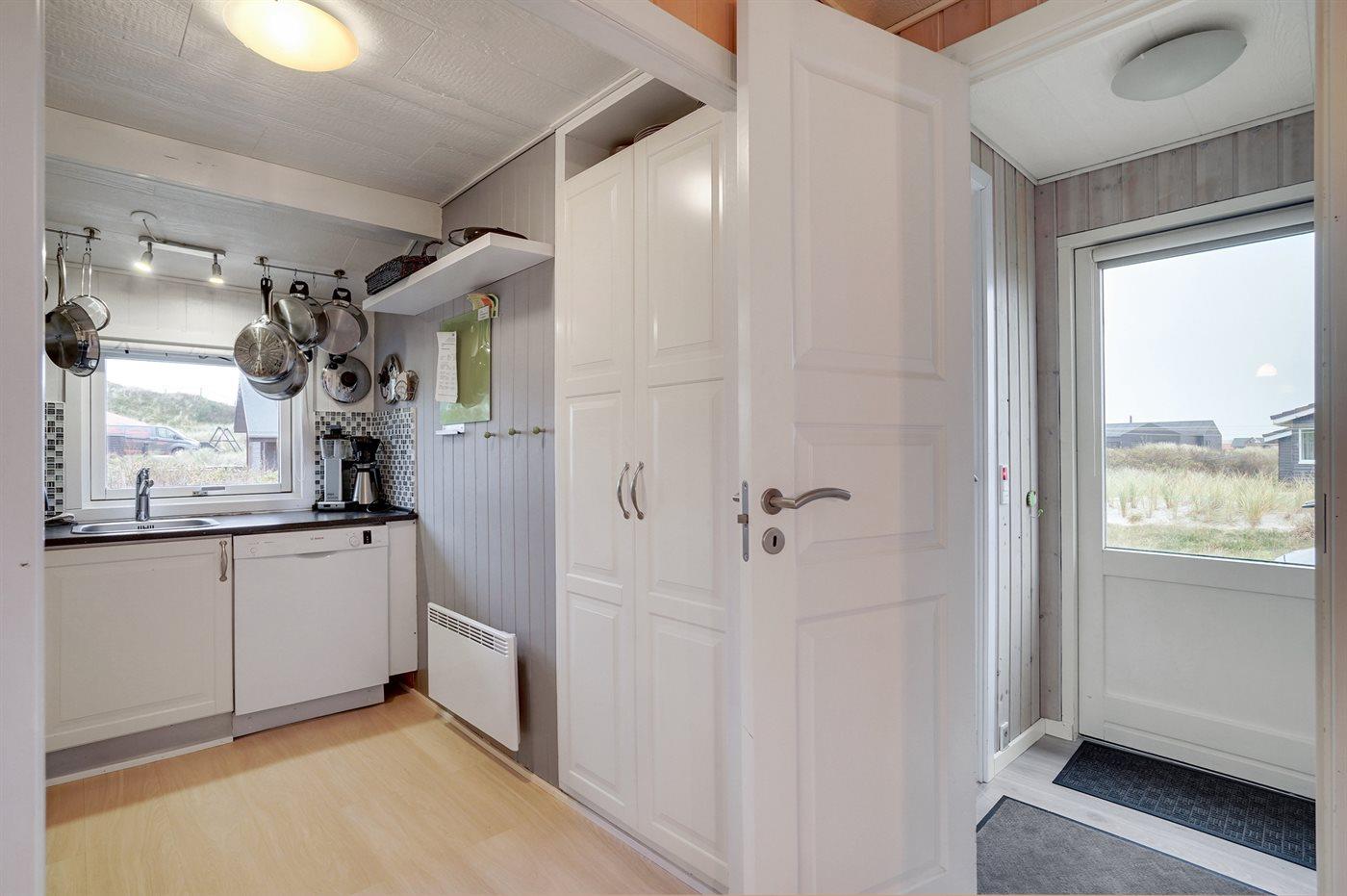 Älteres Ferienhaus aus Holz, 1976 gebaut und laufend modernisiert. Das Haus ist auf einem Dünen-/Naturgrundstück nur 200 m vom Wasser gelegen. Sowohl offenes als auch überdachtes Terrassenareal mit Gartenmöbeln. Holzdecken und -wände. Teppichböden, jedoch PVC-Boden in der Küche und im Flur. Badezimmer mit Duschnische, Fußbodenheizung, Waschmaschine und Wäschetrockner. Gute Küche mit Geschirrspüler, Mikrowelle, Kühlschrank mit kleinem Gefrierfach und Herd mit Ceran-Feld. Das gemütliche Wohnzimmer enthält Kaminofen, Stereoanlage mit CD-Spieler, DVD-Spieler, TV mit digitalem Satellitenanschluss und Nintendo 64. 1 Schlafplatz in einem Einzelbett und 4 Schlafplätze in elektrisch verstellbaren Betten. An weiterer Ausstattung können kostenlose, kabellose Internetverbindung erwähnt werden (Computer ist mitzubringen) und es ist eine energiegerechte Wärmepumpe installiert. Kinderbett, Kinderhochstuhl, Sandkasten und Schaukel für die Kinder. Ein gutes Ferienhaus mit einer schönen Lage.