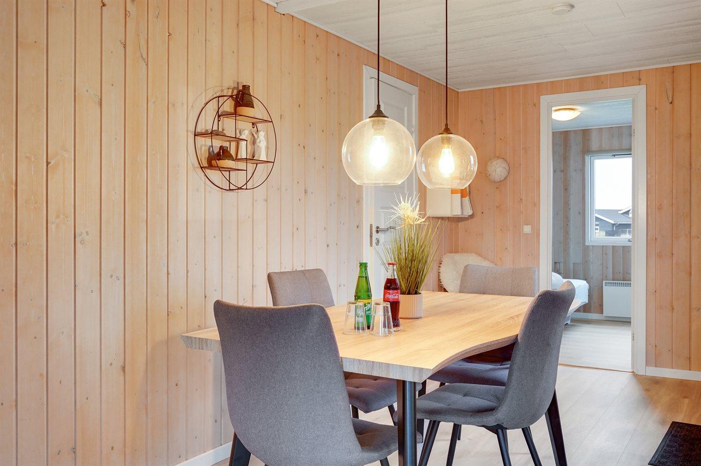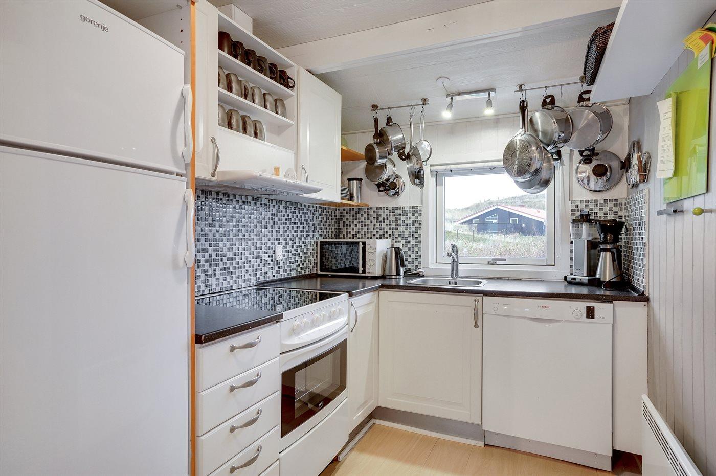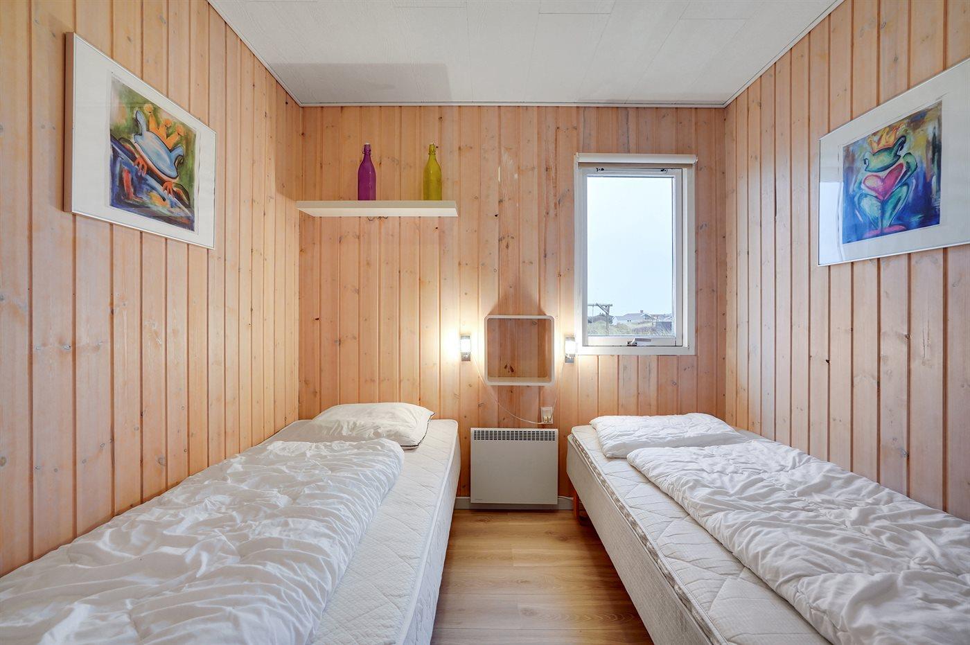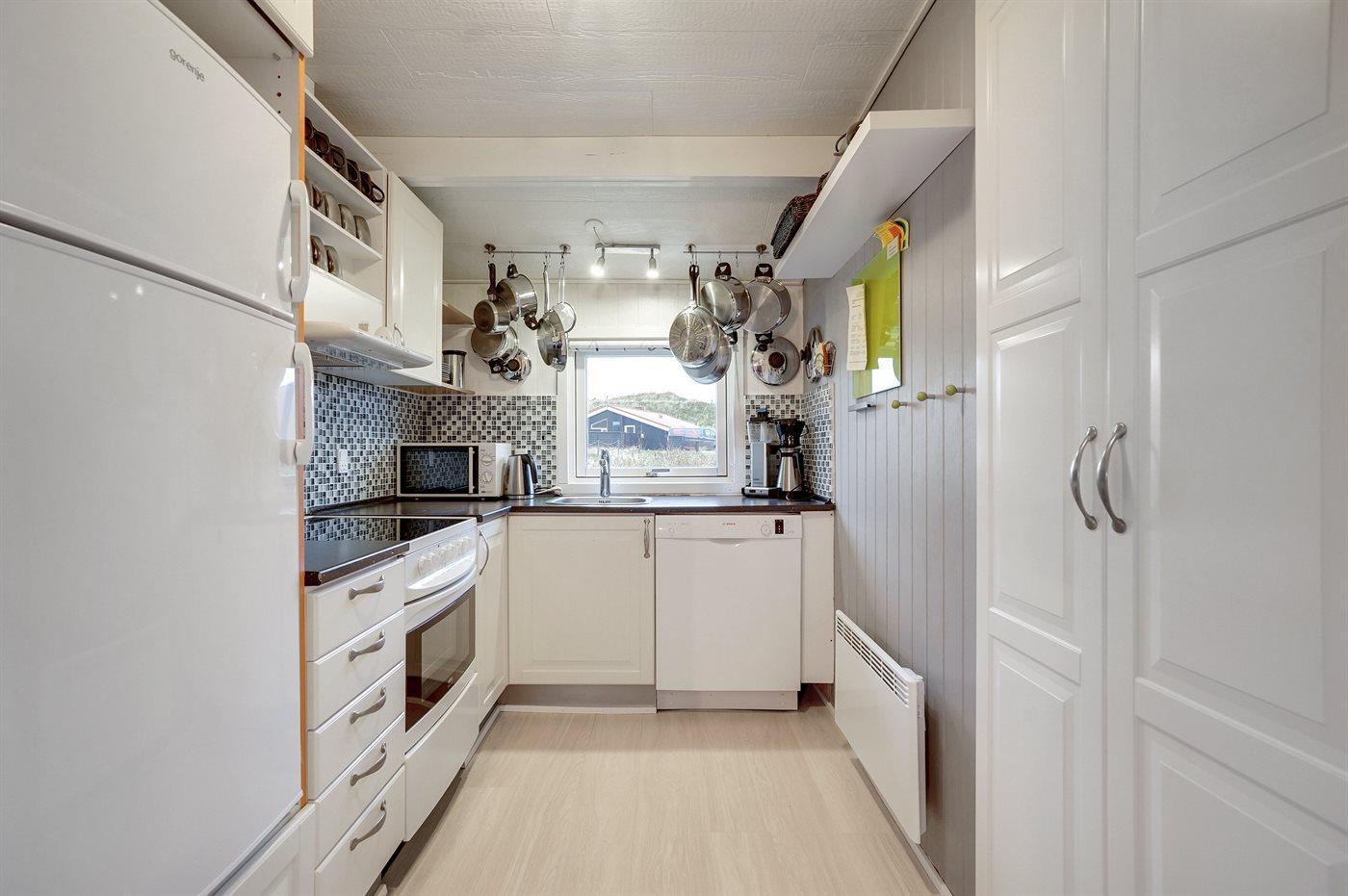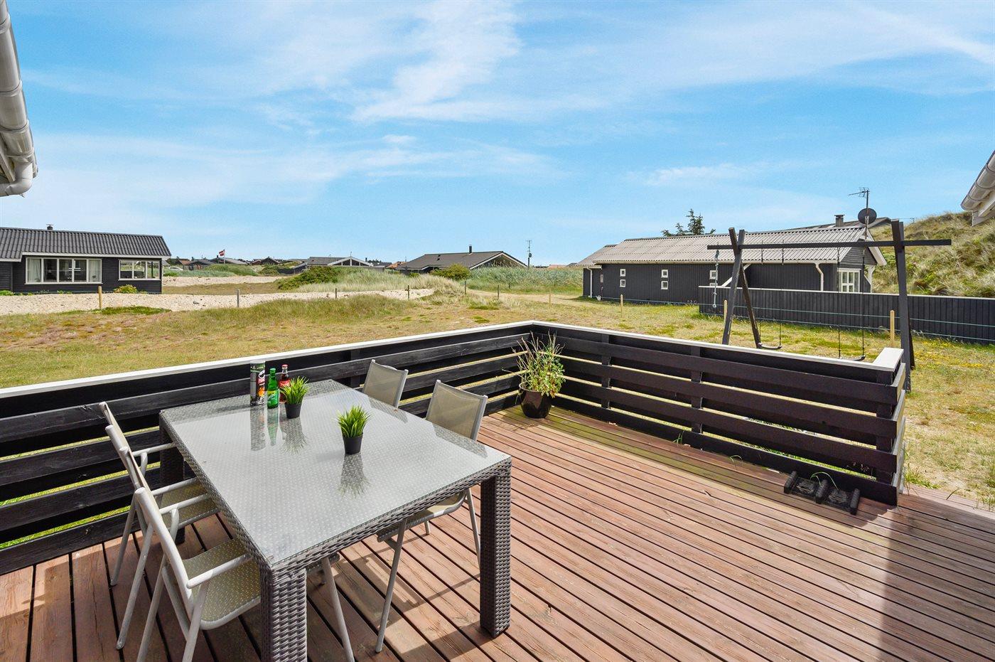 Älteres Ferienhaus aus Holz, 1976 gebaut und laufend modernisiert. Das Haus ist auf einem Dünen-/Naturgrundstück nur 200 m vom Wasser gelegen. Sowohl offenes als auch überdachtes Terrassenareal mit Gartenmöbeln. Holzdecken und -wände. Teppichböden, jedoch PVC-Boden in der Küche und im Flur. Badezimmer mit Duschnische, Fußbodenheizung, Waschmaschine und Wäschetrockner. Gute Küche mit Geschirrspüler, Mikrowelle, Kühlschrank mit kleinem Gefrierfach und Herd mit Ceran-Feld. Das gemütliche Wohnzimmer enthält Kaminofen, Stereoanlage mit CD-Spieler, DVD-Spieler, TV mit digitalem Satellitenanschluss und Nintendo 64. 1 Schlafplatz in einem Einzelbett und 4 Schlafplätze in elektrisch verstellbaren Betten. An weiterer Ausstattung können kostenlose, kabellose Internetverbindung erwähnt werden (Computer ist mitzubringen) und es ist eine energiegerechte Wärmepumpe installiert. Kinderbett, Kinderhochstuhl, Sandkasten und Schaukel für die Kinder. Ein gutes Ferienhaus mit einer schönen Lage.