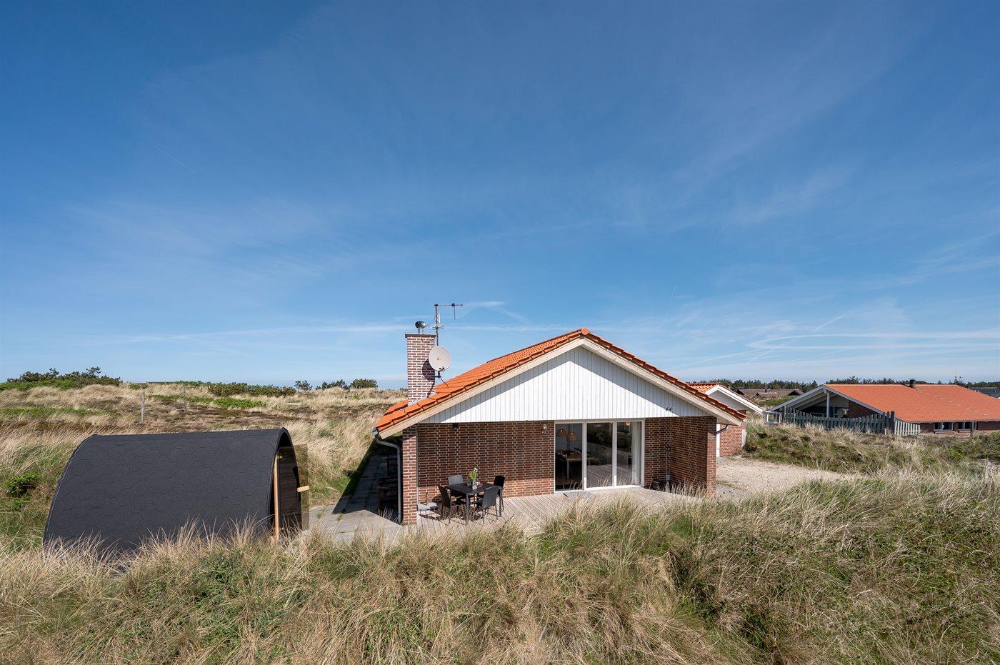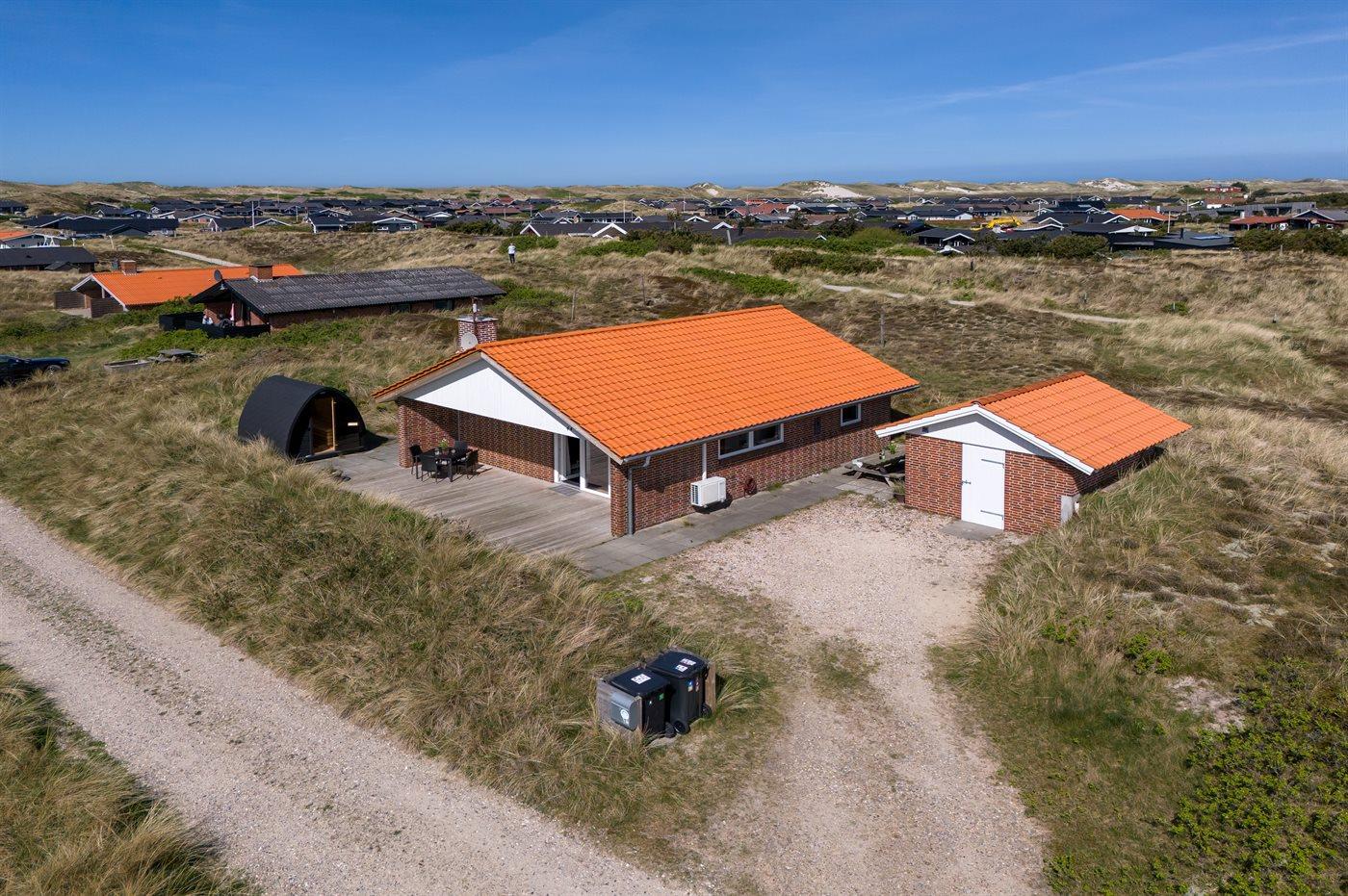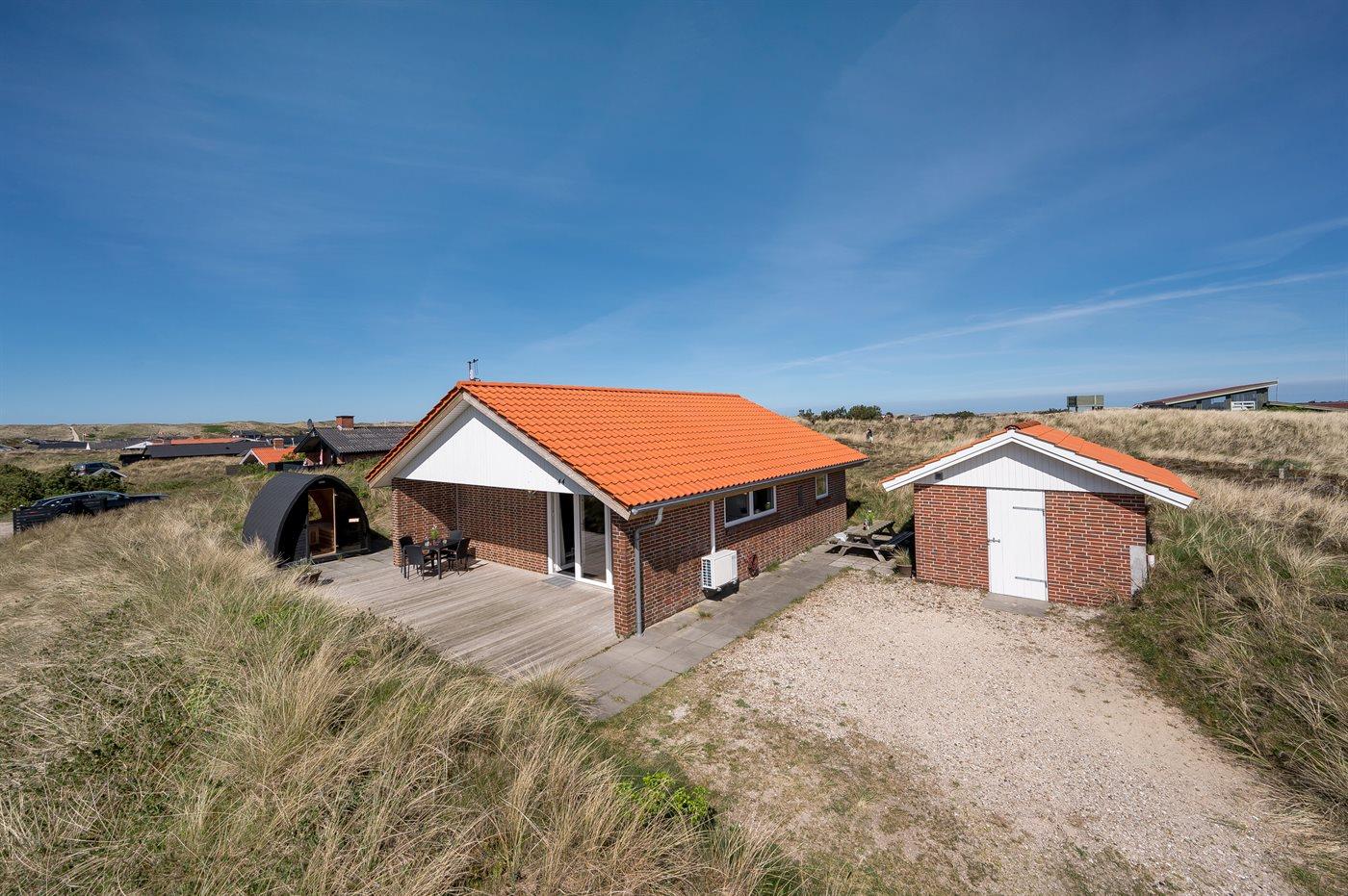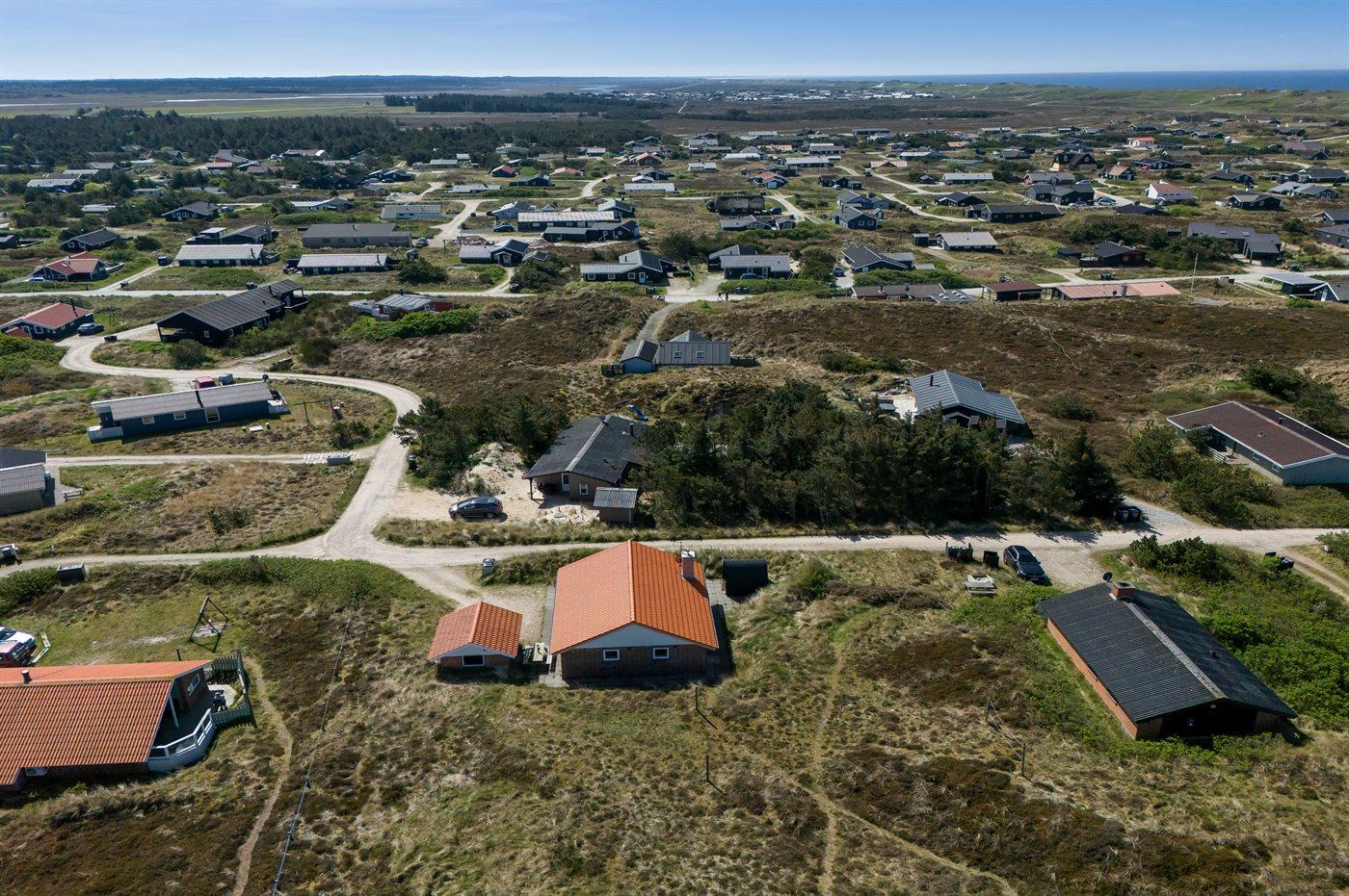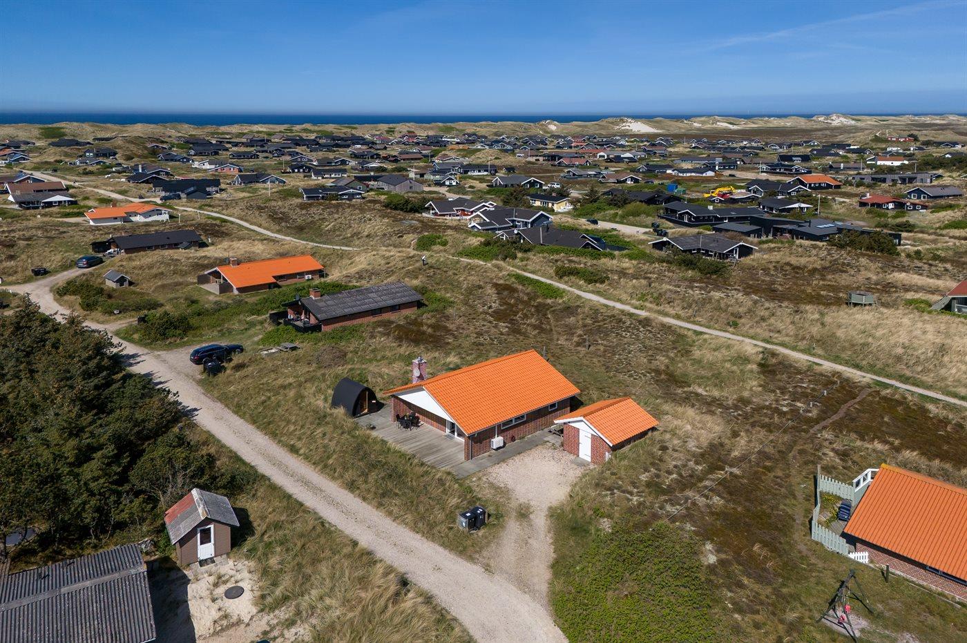 Die Ferienunterkunft liegt auf einem 1380 m² großen Dünengrundstück. Die Entfernung zum Meer beträgt 700 m. Die Entfernung zum Fjord beträgt 1900 m. Die nächste Einkaufsmöglichkeit liegt 850 m entfernt. Außerdem gibt es 12 m² überdachte Terrasse. Geräteraum. Außensauna. Parkplatz auf dem Grundstück.
