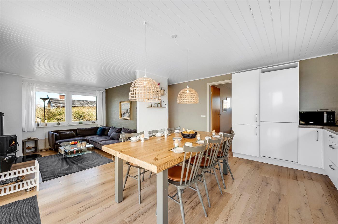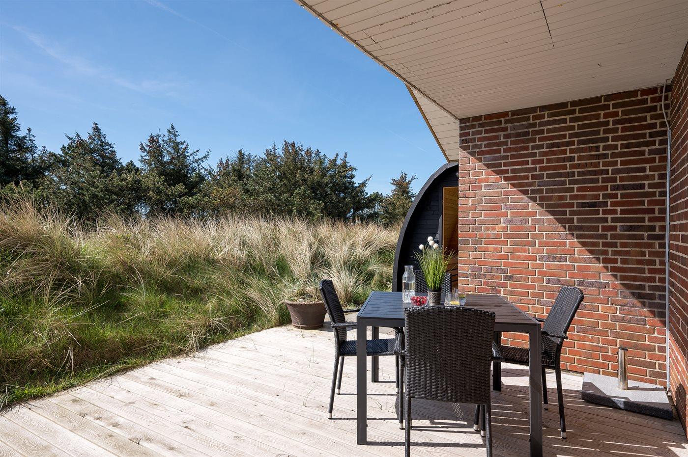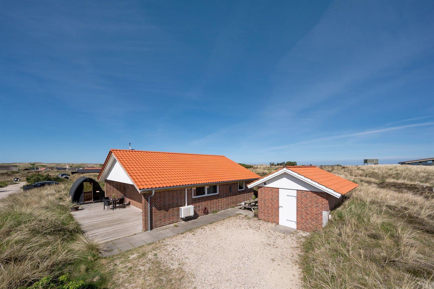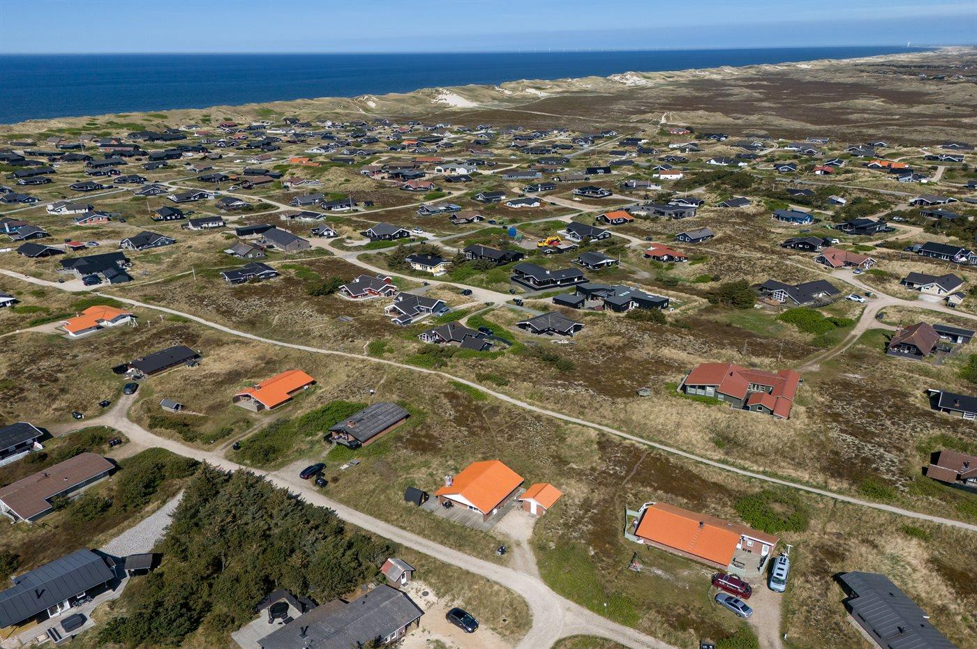 Die Ferienunterkunft liegt auf einem 1380 m² großen Dünengrundstück. Die Entfernung zum Meer beträgt 700 m. Die Entfernung zum Fjord beträgt 1900 m. Die nächste Einkaufsmöglichkeit liegt 850 m entfernt. Außerdem gibt es 12 m² überdachte Terrasse. Geräteraum. Außensauna. Parkplatz auf dem Grundstück.
