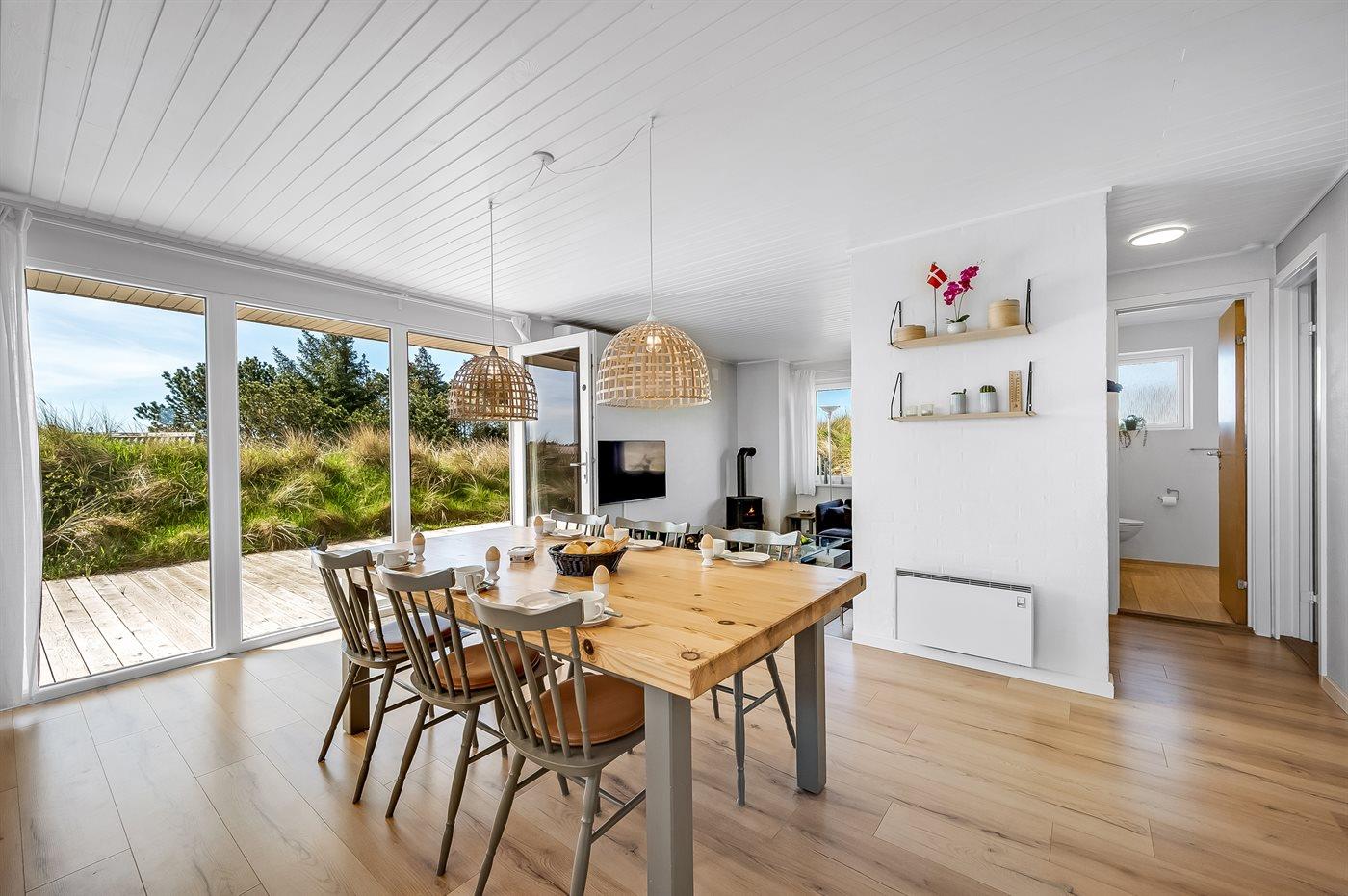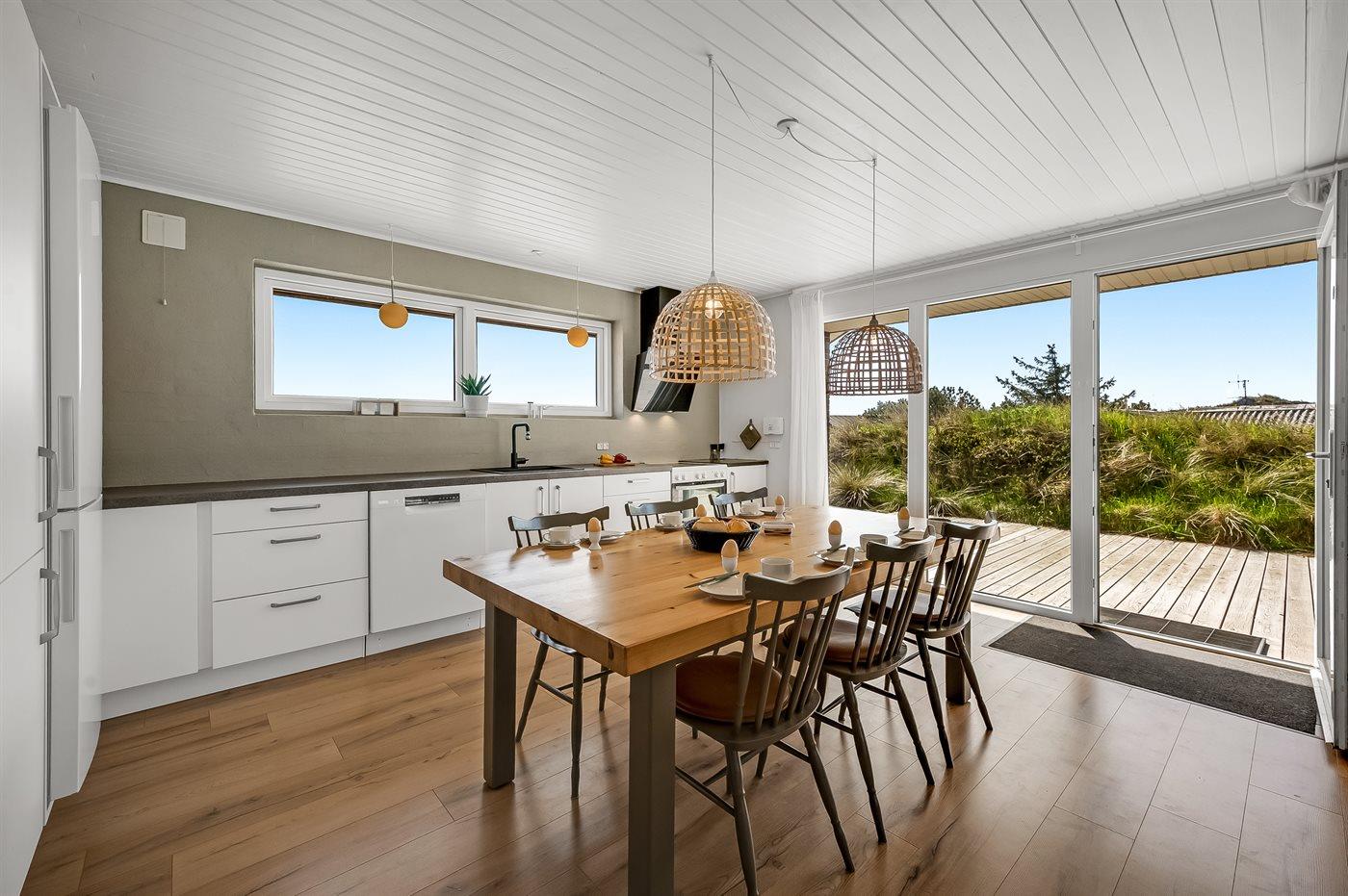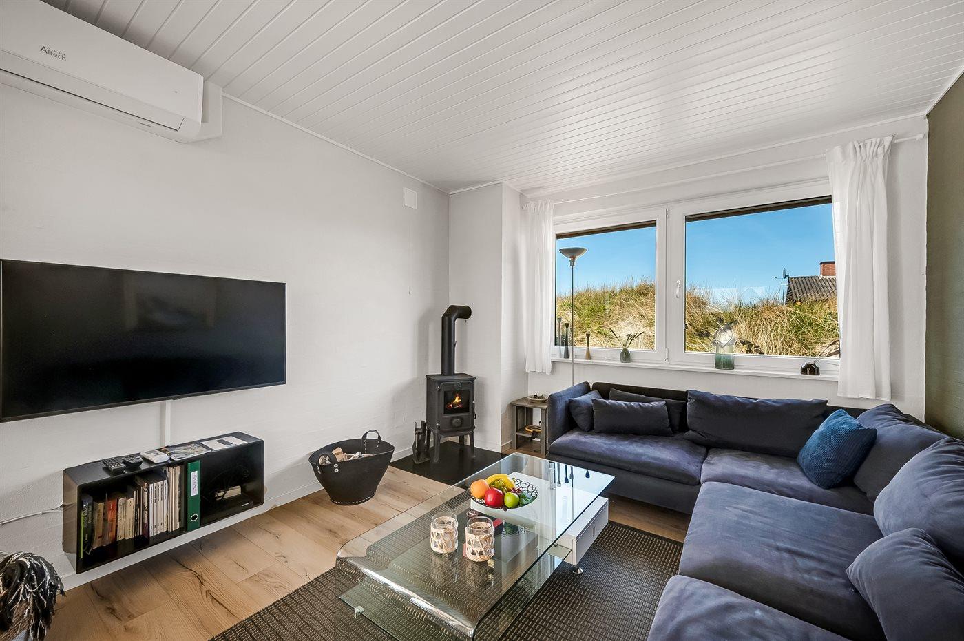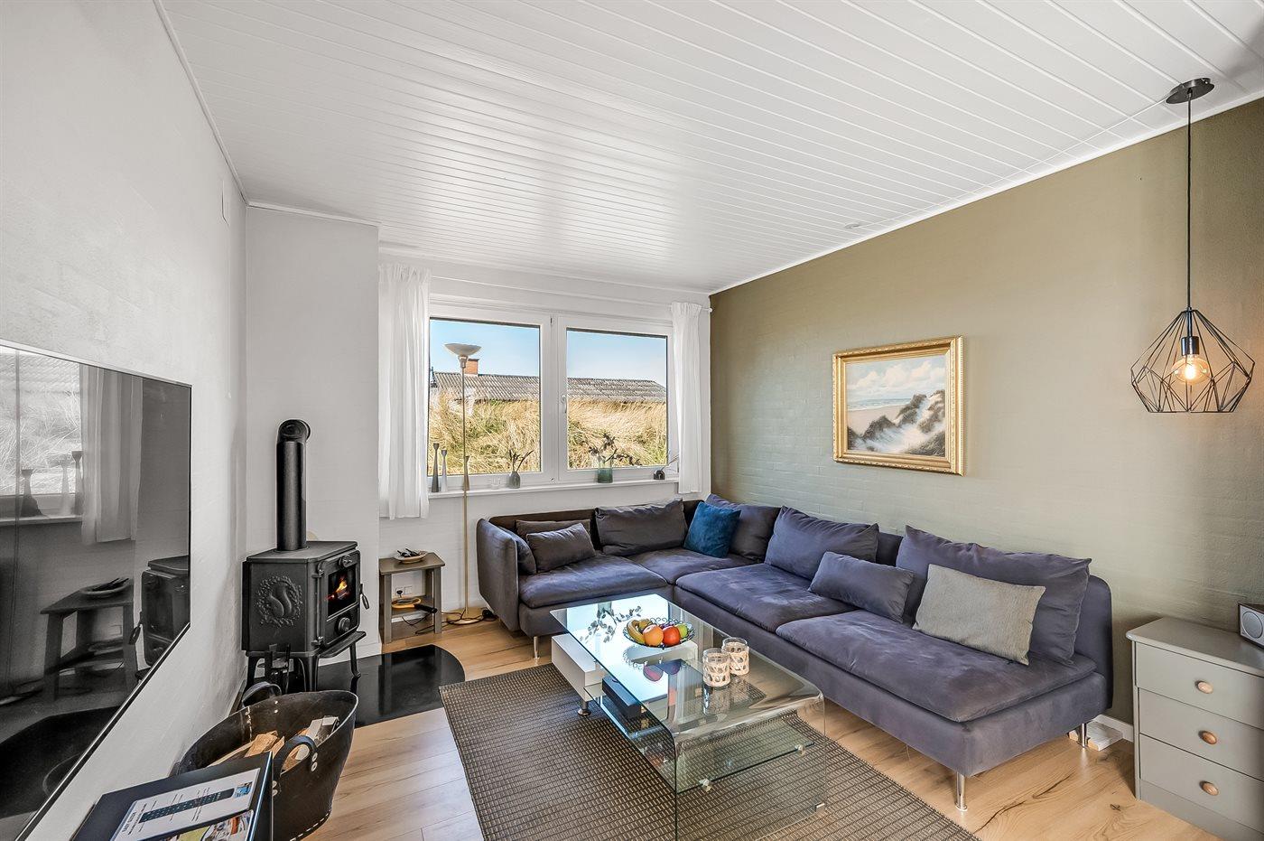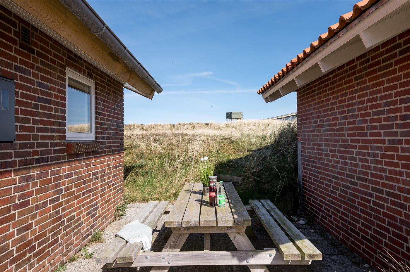 Die Ferienunterkunft liegt auf einem 1380 m² großen Dünengrundstück. Die Entfernung zum Meer beträgt 700 m. Die Entfernung zum Fjord beträgt 1900 m. Die nächste Einkaufsmöglichkeit liegt 850 m entfernt. Außerdem gibt es 12 m² überdachte Terrasse. Geräteraum. Außensauna. Parkplatz auf dem Grundstück.