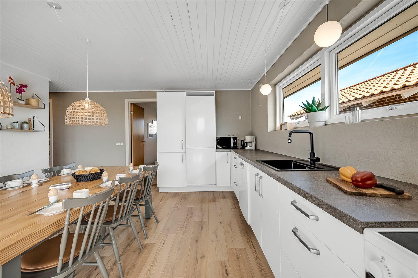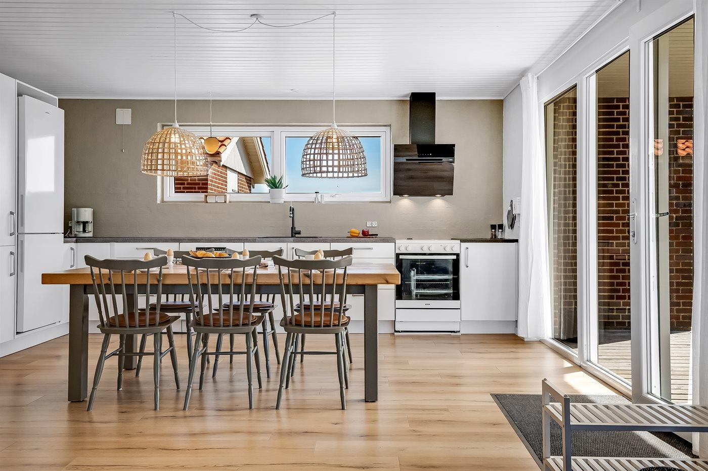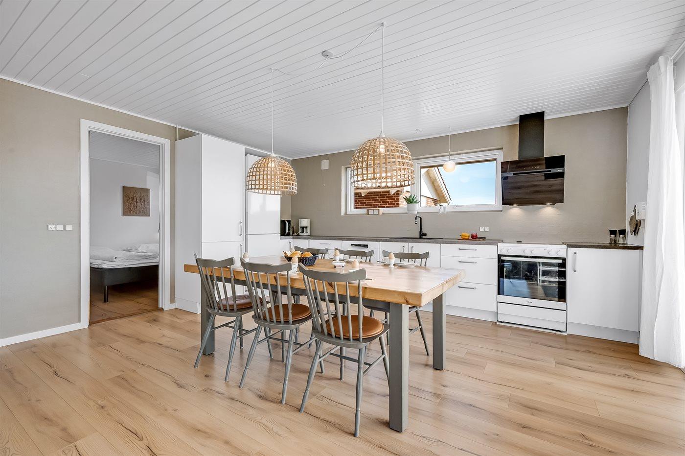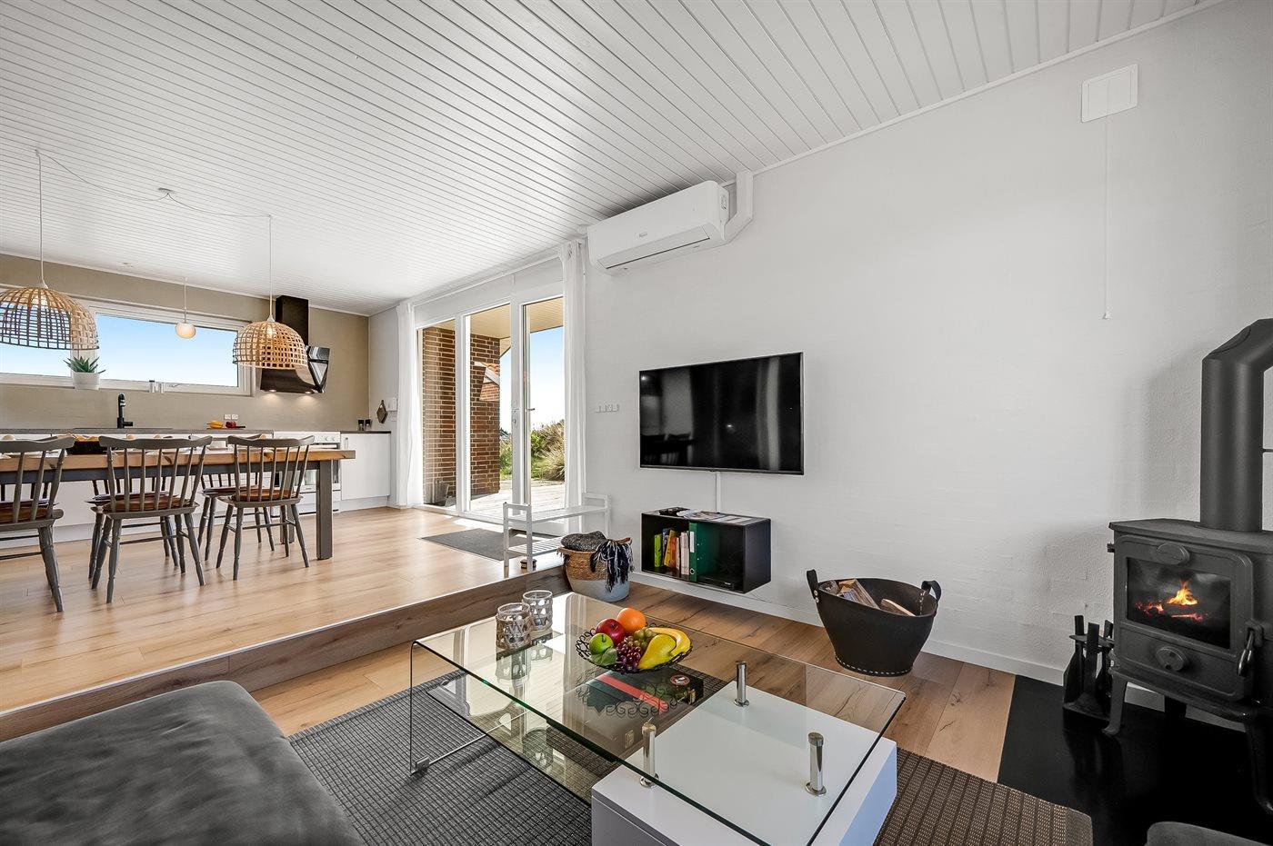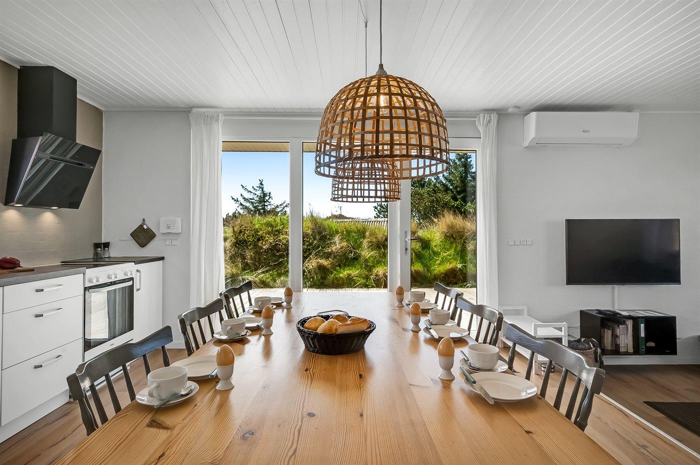 Die Ferienunterkunft liegt auf einem 1380 m² großen Dünengrundstück. Die Entfernung zum Meer beträgt 700 m. Die Entfernung zum Fjord beträgt 1900 m. Die nächste Einkaufsmöglichkeit liegt 850 m entfernt. Außerdem gibt es 12 m² überdachte Terrasse. Geräteraum. Außensauna. Parkplatz auf dem Grundstück.