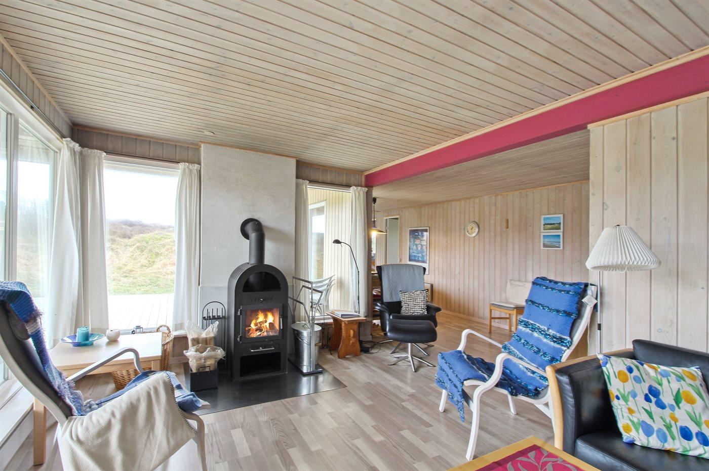 Ein gemütliches und gepflegtes Ferienhaus aus Holz, 1976 gebaut und laufend renoviert - zuletzt 2017 mit neuer Terrasse, das auf einem Natur-/Dünengrundstück liegt. Zum Haus gehören sowohl eine offene als auch ein überdachte Terrassen mit Gartenmöbeln. Die große nach gegen Süden gelegene Terrasse ist teilweise überdacht. Auf der gegen Osten gerichteten Terrasse können Sie ihr Frühstück genießen. Von der Terrasse haben Sie Aussicht auf die schöne Heidelandschaft. Die Wände, Decken und Böden sind im ganzen Haus aus Holz. Das Haus ist mit Badezimmer mit Duschnische sowie Waschmaschine und Wäschetrockner ausgestattet. Die Küche ist mit u. a. Herd mit Ceran-Feld, Geschirrspüler und Mikrowelle ausgestattet. Das freundliche Wohnzimmer verfügt über Kaminofen, Flatscreen-TV mit digitalem Satellitenanschluss sowie einer Stereoanlage mit CD-Spieler und einen DVD-Player. Die Schlafplätze des Hauses verteilen sich auf 2 Zimmer mit Doppelbett und 1 Zimmer mit 2 Einzelbetten. Für die jüngsten Feriengäste gibt es einen Kinderhochstuhl. Ferner steht kostenlose, kabellose Internetverbindung (Computer ist mitzubringen) zur Verfügung. Der Geräteraum ist mit Strom versorgt. Ein schönes Ferienhaus in einem Gebiet mit guten Aktivitätsmöglichkeiten.