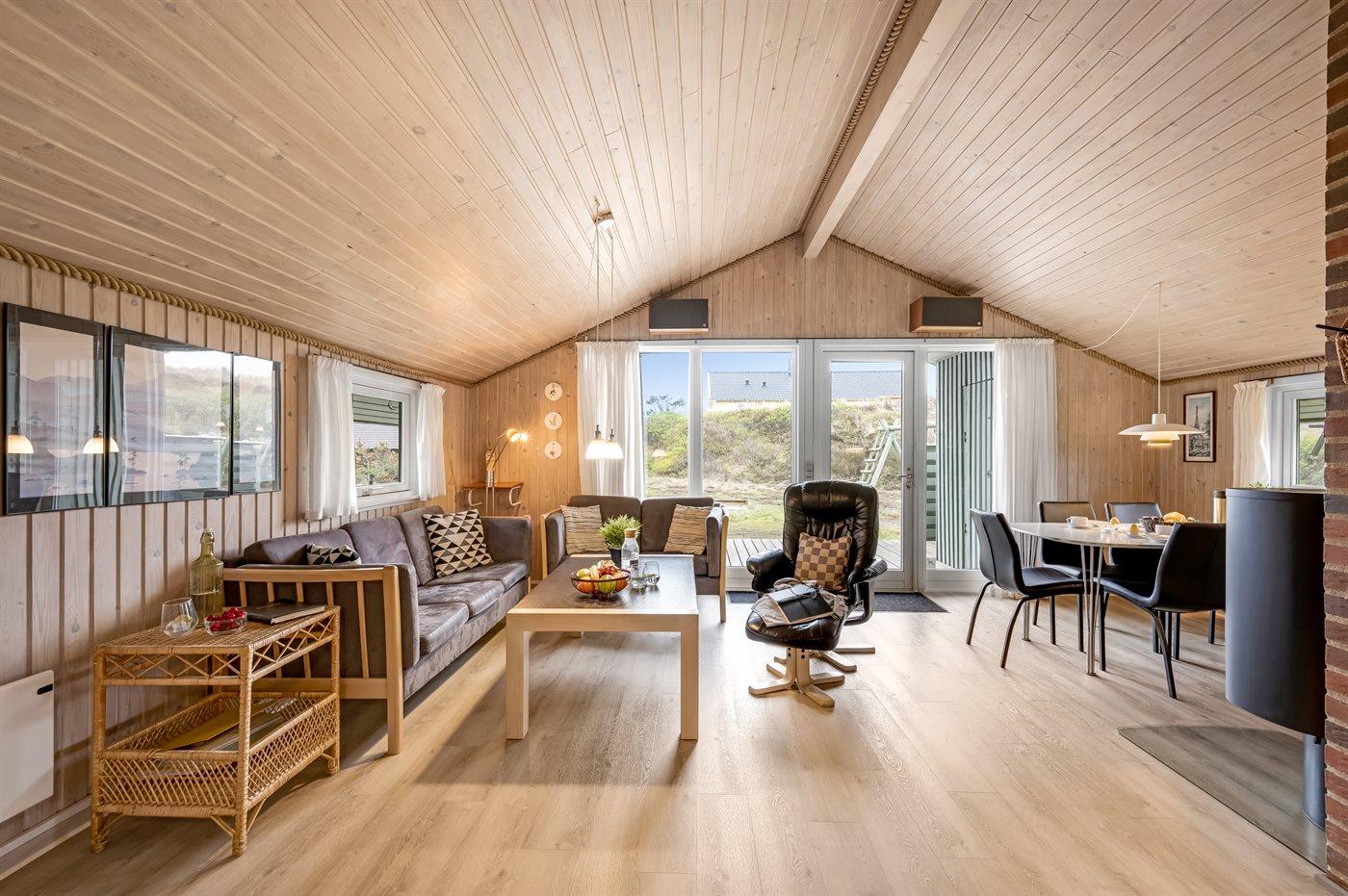 Auf einem schönen, hügeligen Dünengrundstück nur 200 m vom Meer entfernt liegt dieses schöne und gepflegte Ferienhaus aus Holz, 1985 gebaut und 2008 modernisiert. Offenes und überdachtes Terrassenareal mit diversen Gartenmöbeln und gutem Windschutz. Holzdecken und -wände, Teppichböden überall - jedoch PVC-boden in der Küche. Badezimmer mit Duschnische und Fußbodenheizung. Die Küche ist mit u. a. Geschirrspüler, Mikrowelle und Kühlschrank mit Gefrierfach ausgestattet. Gemütliches Wohnzimmer mit Kaminofen und Flatscreen-TV mit digitalem Satellitenanschluss. 3 Zimmer; 1 mit Doppelbett, 1 mit 2 Einzelbetten und 1 mit Etagenbett. Ferner stehen Waschmaschine sowie Wäschetrockner zur Verfügung und es ist eine energiegerechte Wärmepumpe installiert. Für die Kinder gibt es Sandkasten, Schaukel, Kinderbett und Kinderhochstuhl. Ein Ferienhaus mit einer guten Lage.