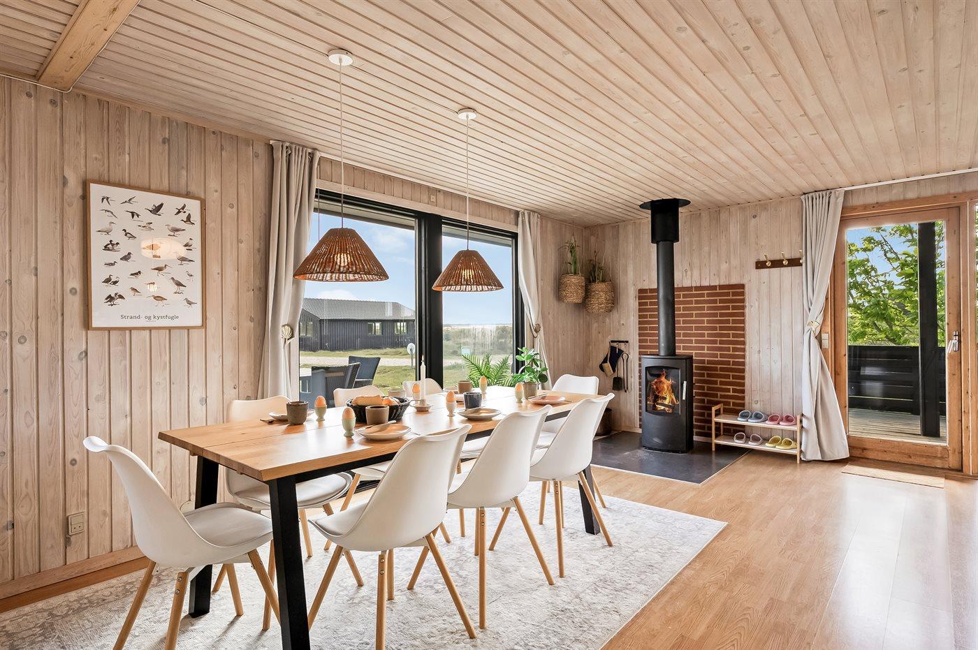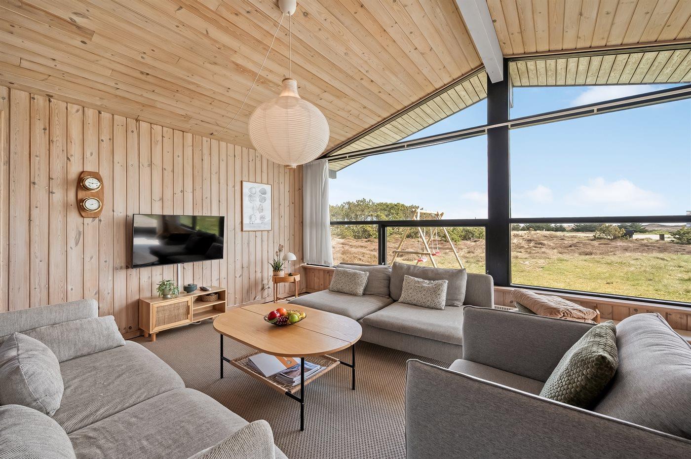 Dieses gepflegte und gut eingerichtete Ferienhaus liegt auf einem großen mit Heidekraut bewachsenen Natur-/Dünengrundstück. Durch die große Fensterfront im Wohnzimmer haben Sie eine herrliche Aussicht auf das Naturschöne Gebiet mit der Förde im Hintergrund.