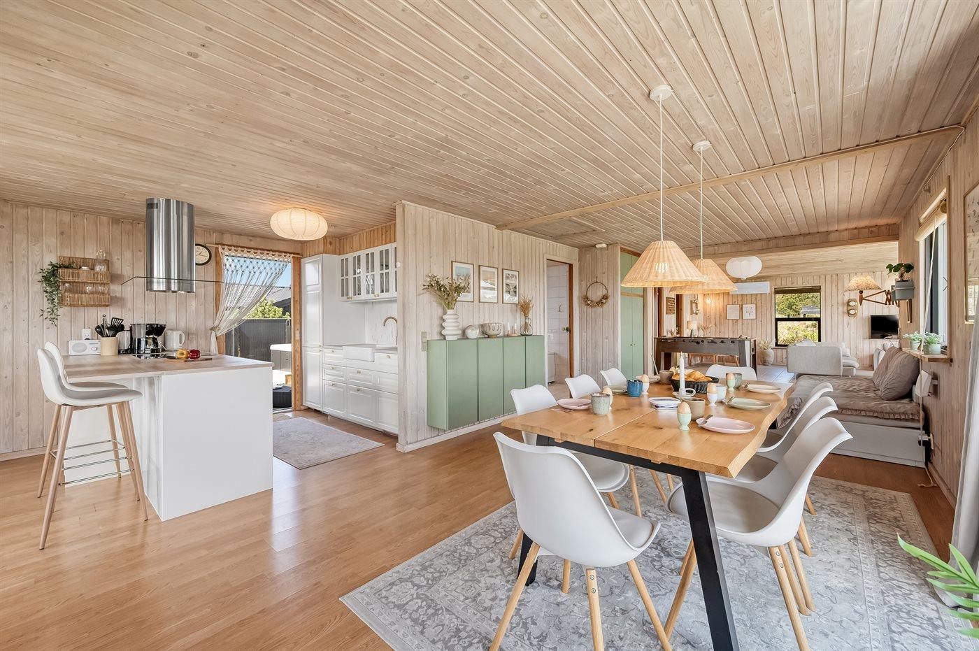 Das Ferienhaus eignet sich für 6 Personen sowie 1 Kleinkind bis zu 3 Jahren. Die Ferienunterkunft hat eine Wohnfläche von 119 m² und wurde 1977 gebaut. 2022 wurde die Ferienunterkunft teilweise renoviert. Es ist erlaubt 2 Haustiere mitzubringen. Die Ferienunterkunft ist mit energiesparender Wärmepumpe ausgestattet. Fußbodenheizung im Wohnzimmer. Die Ferienunterkunft ist mit Waschmaschine ausgestattet. Wäschetrockner. Tiefkühlmöglichkeit mit 134 Liter Nutzinhalt. Es gibt außerdem einen Kaminofen. Für die jüngsten Feriengäste ist 1 Kinderhochstuhl vorhanden.