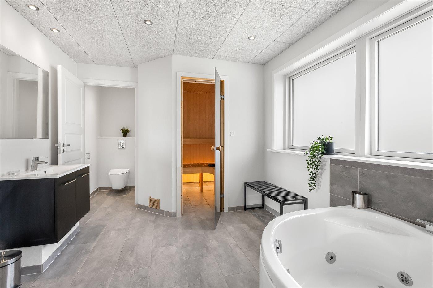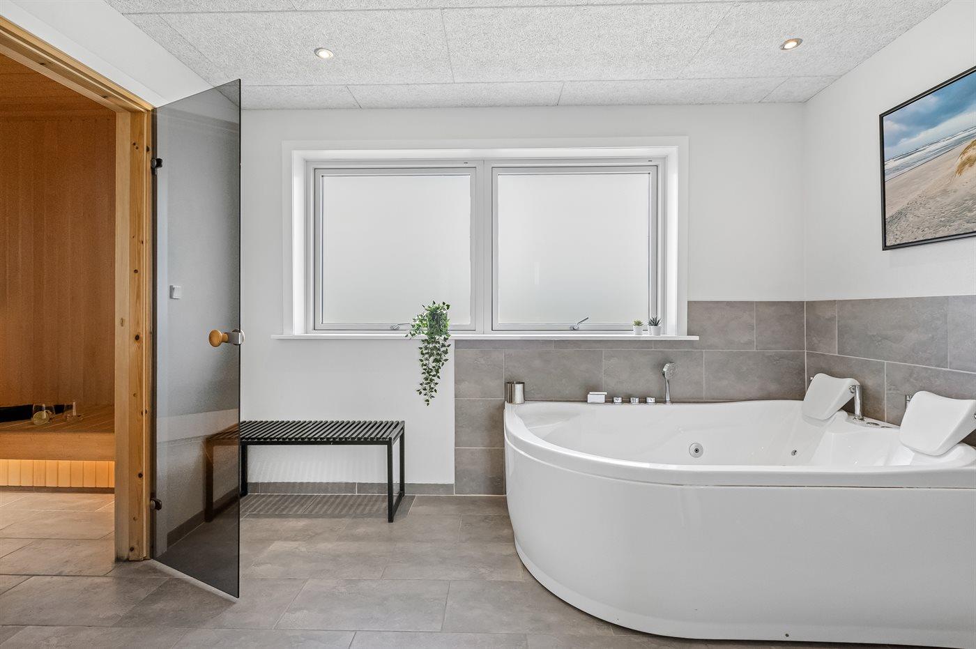 In einem der beiden Badezimmer des Hauses kannst du dich im warmen Wasser des Whirlpools entspannen oder dich nach einem langen Spaziergang am Strand in der Sauna aufwärmen.