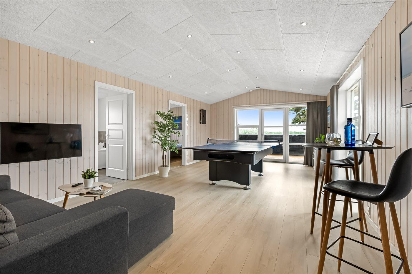 Das Ferienhaus ist hell und gemütlich, und im großen Aktivitätsraum kann man sich bei einer Partie Billard, Dart oder Tischtennis herausfordern und viele lustige Stunden zusammen verbringen. Wenn du lieber mit einem guten Buch entspannen möchtest, kannst du es dir auf der großen Couch gemütlich machen, während du dem leisen Knistern des Kamins lauscht.