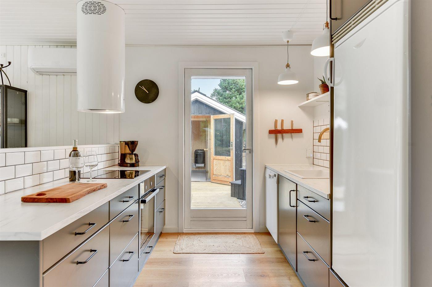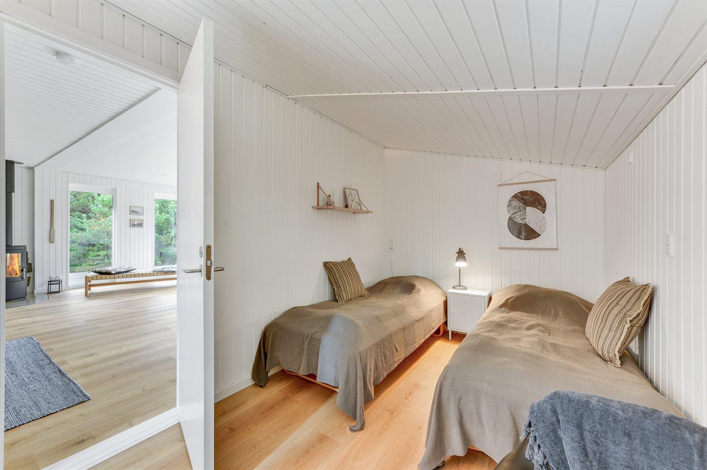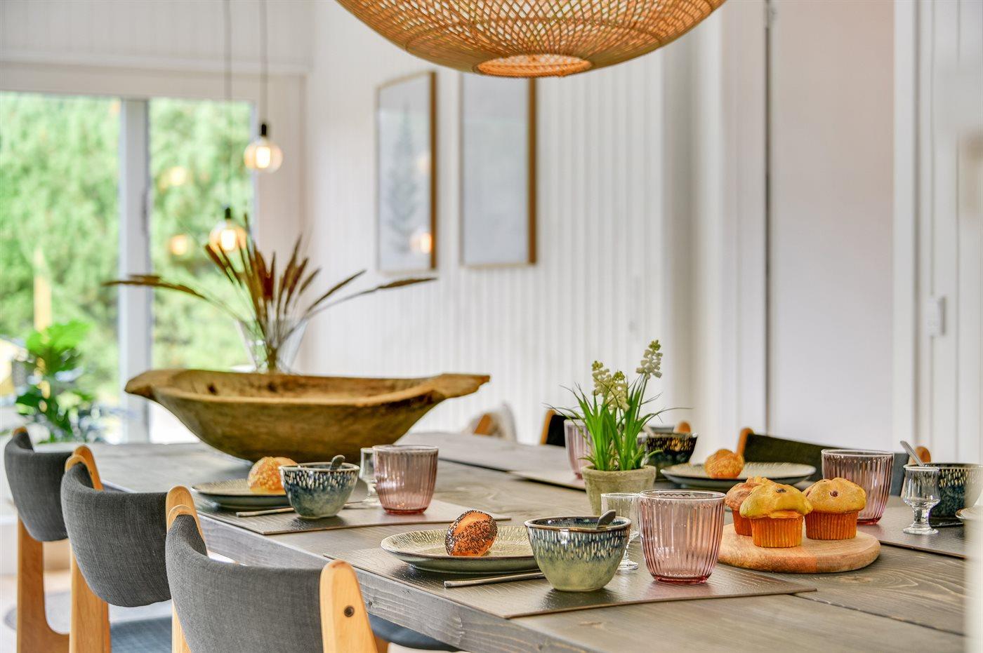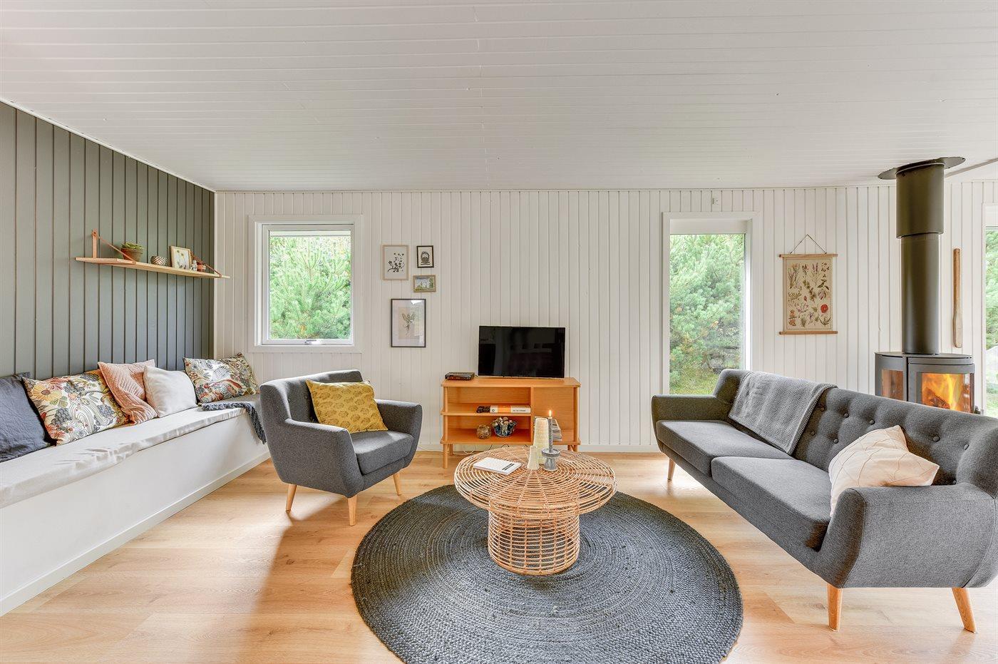 Auf einem 2075 m2 großen Naturgrundstück, von Bäumen umgeben und in einem Gebiet mit einem reichen Vogelleben, finden Sie dieses Ferienhaus. Das Haus liegt 900 m vom Meer und 1400 vom Fjord entfernt. Die nächste Einkaufsmöglichekeit finden Sie in einem Abstand von 600 m. Ein gemütlich und hell eingerichtetes Ferienhaus in einem Gebiet mit guten Aktivitätsmöglichkeiten. Das Ferienhaus eignet sich für 6 Personen. Die Wohnfläche beträgt 97 m2 und es stehen zusätzlich 2 Gästehäuser zur Verfügung mit einer Wohnfläche von 18 m2 beziehungsweise 6 m2. Das Haus wurde 1977 gebaut und 2020 völlig renoviert mit u. a. neuem Badezimmer, neuen Terrassen, eine komplette modernisierung der übrigen Räume sowie eine neue Sauna im kleinen Gästehaus. Zum Ferienhaus gehört eine mehr als 60 m2 große Terrassenfläche die sich auf 3 Terrassen verteilt. Durch die 2 großen Schiebetüren im Wohnzimmer gelangen Sie auf die große, in westlicher Richtung liegende Terrasse mit Esstisch und Lounge-Abteilung. Außerdem steht ein Hot-Tub zur Verfügung. Die Küche ist modernisiert und u. a. mit Kühlschrank, Induktionskochfeld, Umluftofen, Mikrowelle und Geschirrspüler ausgestattet. Von der Küche haben Sie Zutritt zur der in nordwestlicher Richtung liegenden Terrasse. Die Schlafplätze verteilen sich auf 2 gute Schlafzimmer im Ferienhaus; 1 mit Doppelbett und 1 mit 2 Einzelbetten. Außerdem gibt es ein Schlafzimmer mit Doppelbett in dem großen Gästehaus. Der große Aufenhaltsraum (55 m2) mit Alkoven lädt zum gemütlichen Beisammensein ein. Durch die großen Schiebetüren fällt die Sonne großzügig in den Raum. Lassen Sie die Türen offen stehen fließt die herrliche frische Luft in den Raum. Der neue Kaminofen sorgt für wohlige Wärme an kalten Tagen. Es gibt ein großes Badezimmer mit Duschnische, Toilette, Waschmaschine und Fußbodenheizung. Vom Badezimmer aus haben Sie Zugang zur Terrasse mit Hot-Tub, Außendusche und Sauna. Es stehen 2 Flatscreen-Fernseher mit Chromecast zur Verfügung. Der Fernseher im Aufenthaltsraum verfügt außerdem über Satellitenanschluss. Es ist kostenlose kabellose Internetverbindung sowie Soundsystem Sonos Move vorhanden. Es sind 2 energiesparende Wärmepumpen installiert die in den Sommermonaten auch als Aircondition funktionieren. Es ist nicht erlaubt Haustiere mitzubringen. Carport steht zur Verfügung. Es ist ein Ladestecker für Elektroautos installiert.