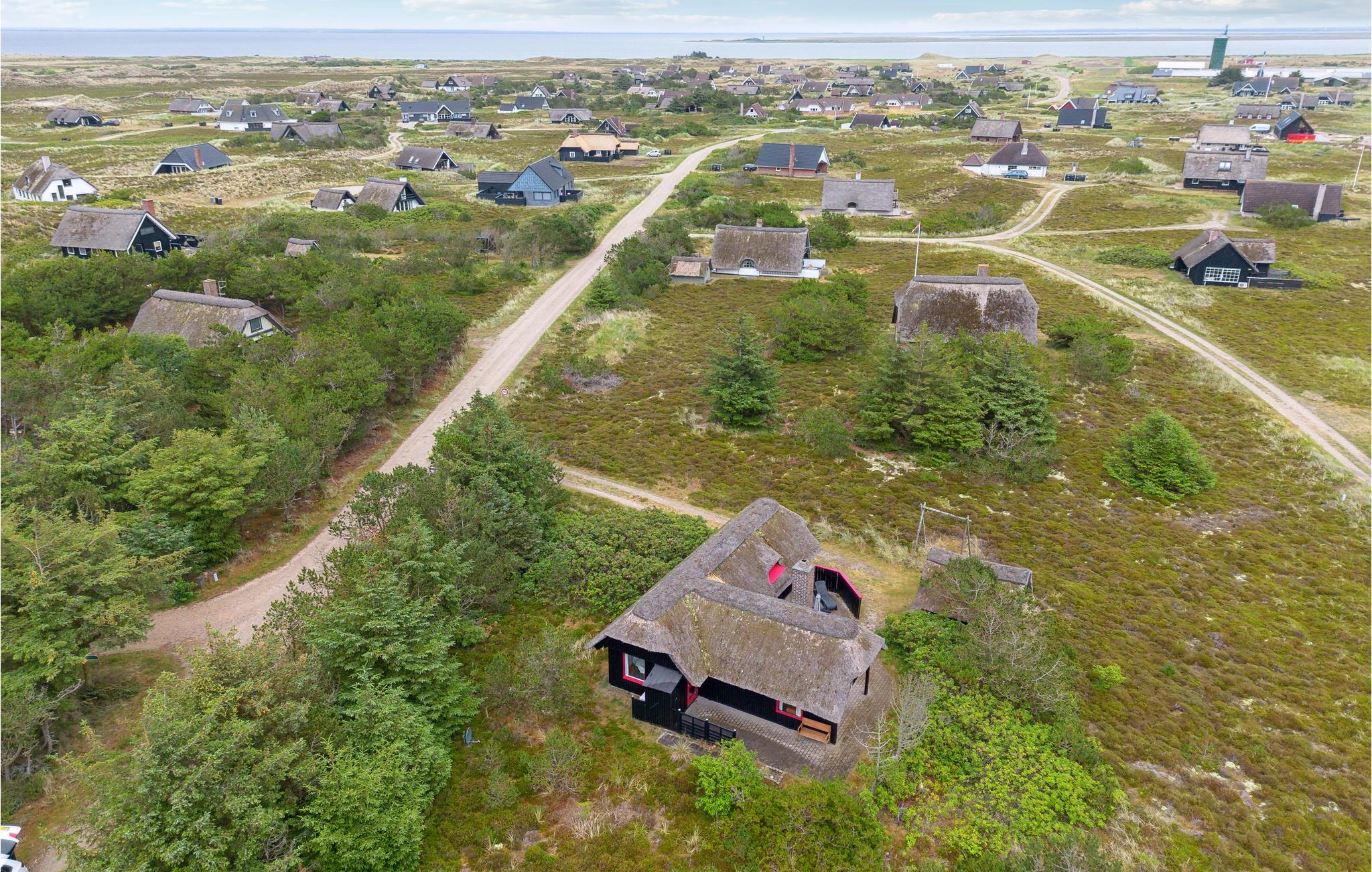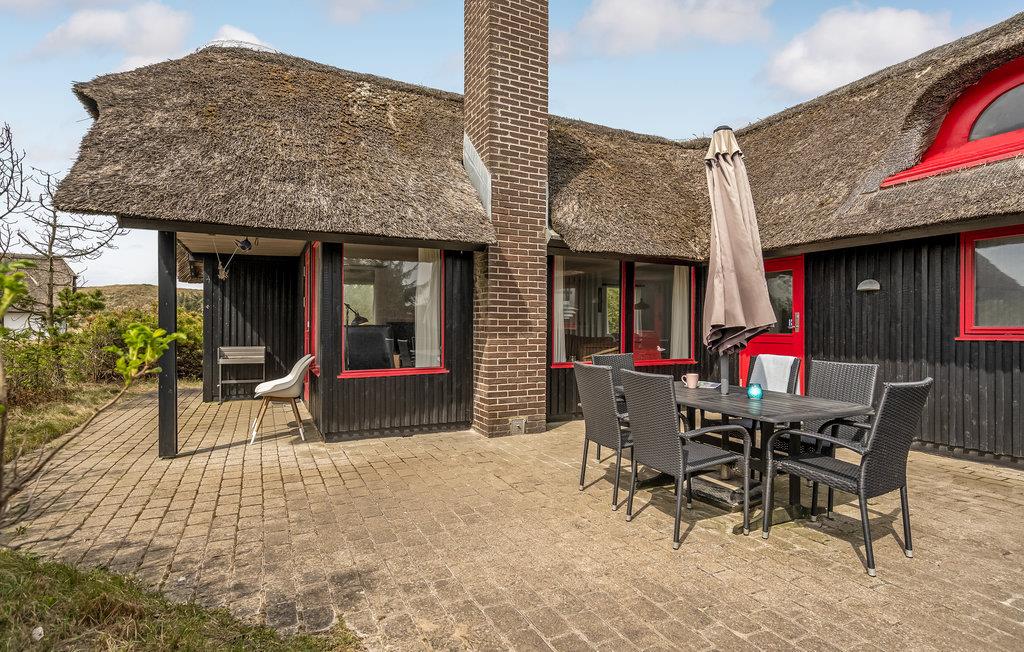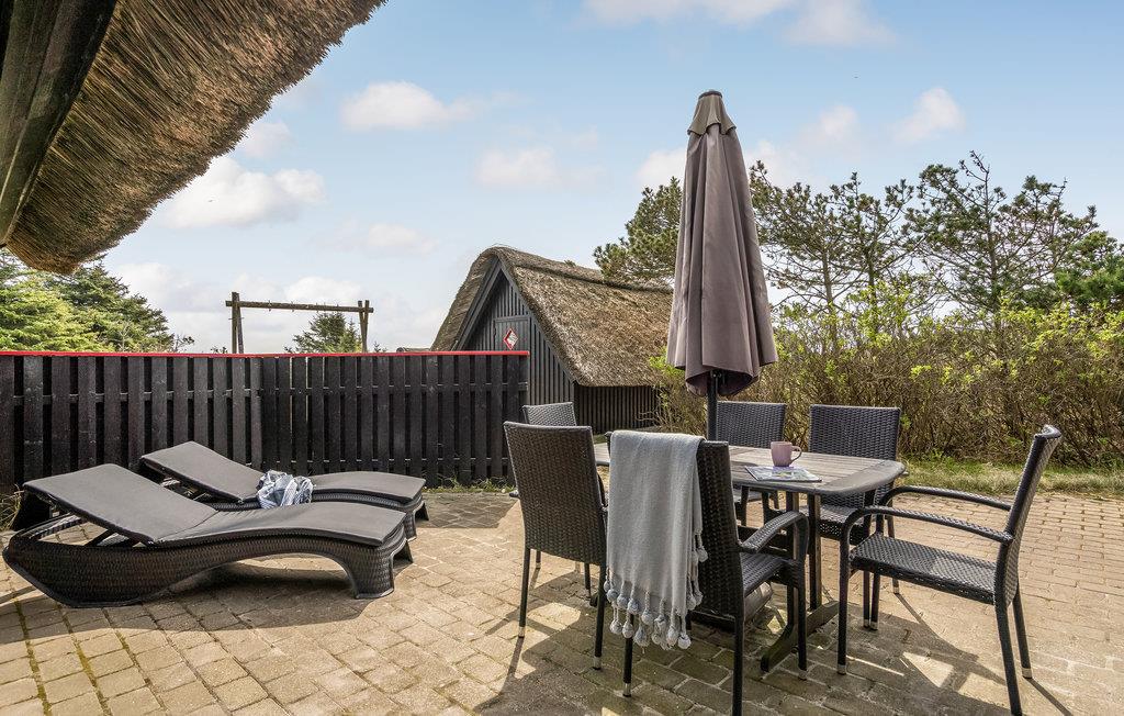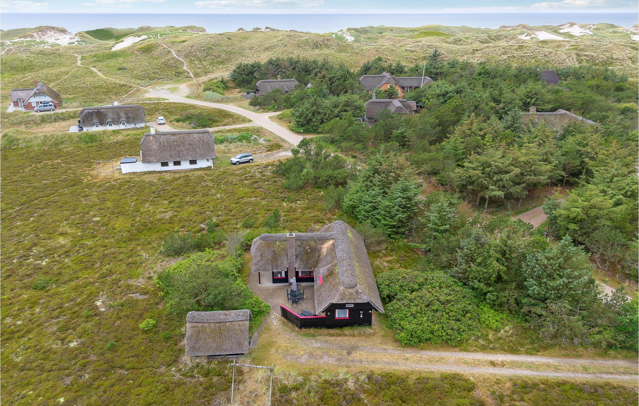 Gemütliches Reetdachhaus in Dünenlandschaft nahe Nordsee und Fjord, ideal für erholsame Familienferien mit Kamin und Terrasse.