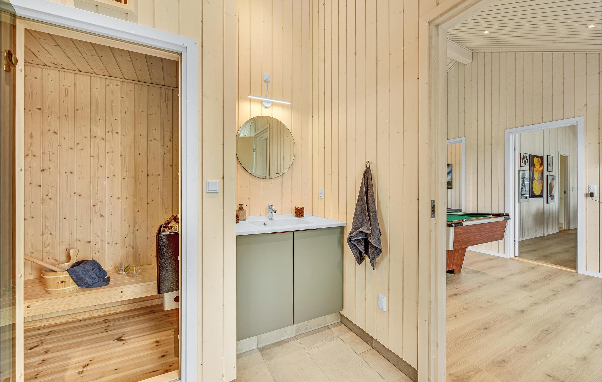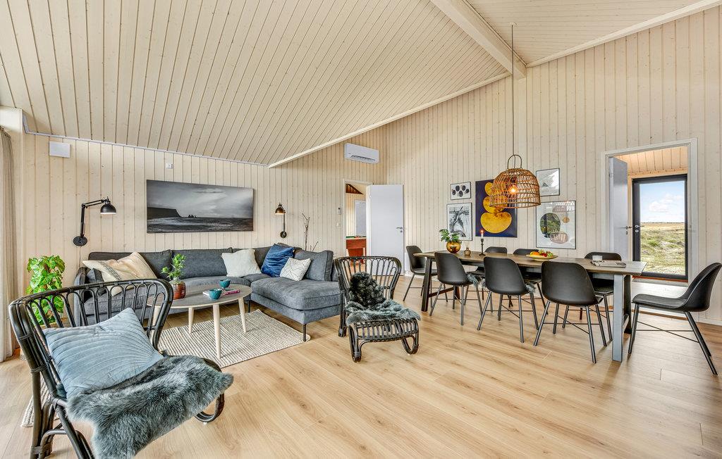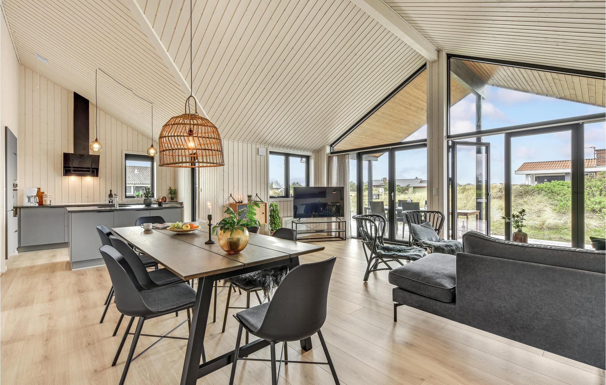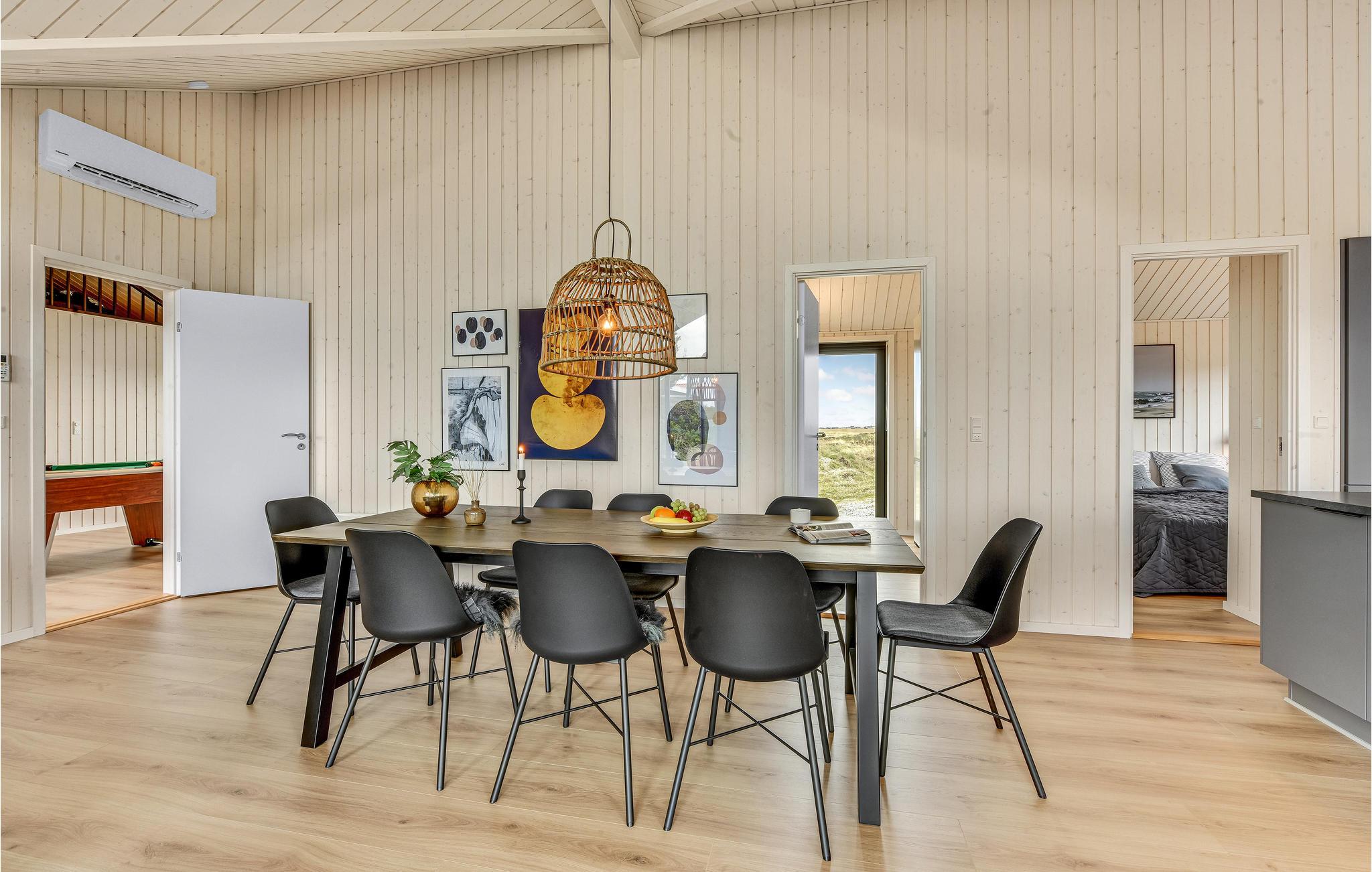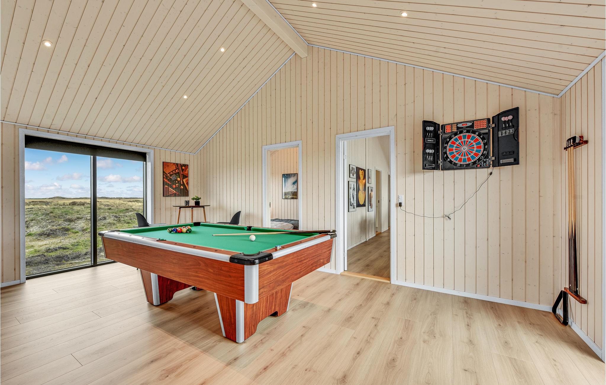 Ihr wunderschönes Ferienhaus bietet Ihnen eine schöne Auszeit an der Nordsee und dem Ringkøbing Fjord. Die Kombination aus stilvoller Einrichtung und naturnaher Lage macht es zum idealen Rückzugsort für Ihren nächsten Urlaub. Der offene und helle Wohnbereich ist das Herz des Hauses. Große Fensterfronten sorgen für viel Tageslicht und eröffnen einen wunderschönen Blick auf die Umgebung. Die moderne Küche ist gut ausgestattet und lädt zu gemeinsamen Kochabenden ein. Ein gemütlicher Essbereich sowie eine komfortable Sofalandschaft bieten Platz für gesellige Stunden. Für Unterhaltung sorgt der Aktivitätsraum mit Billardtisch.