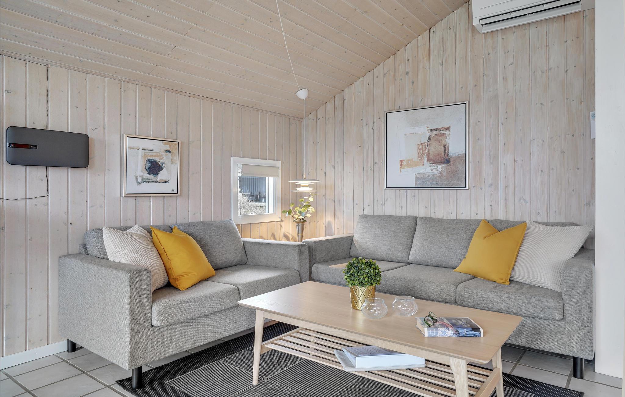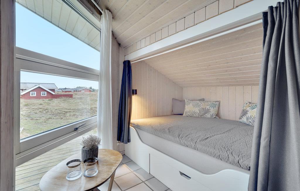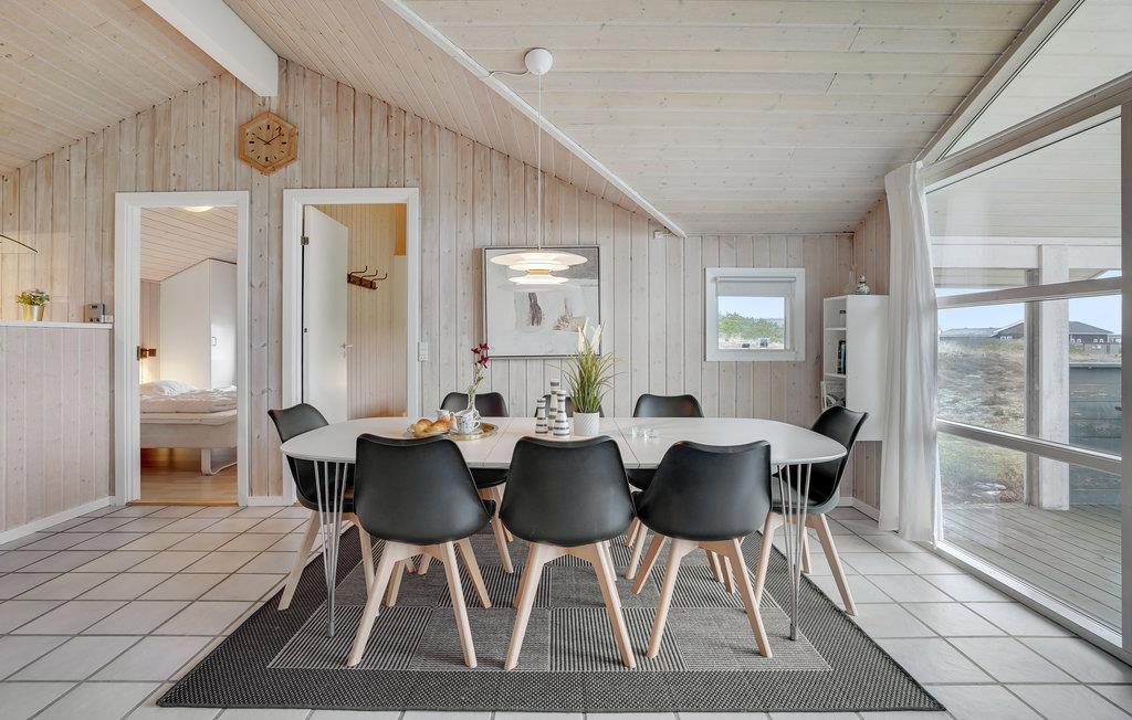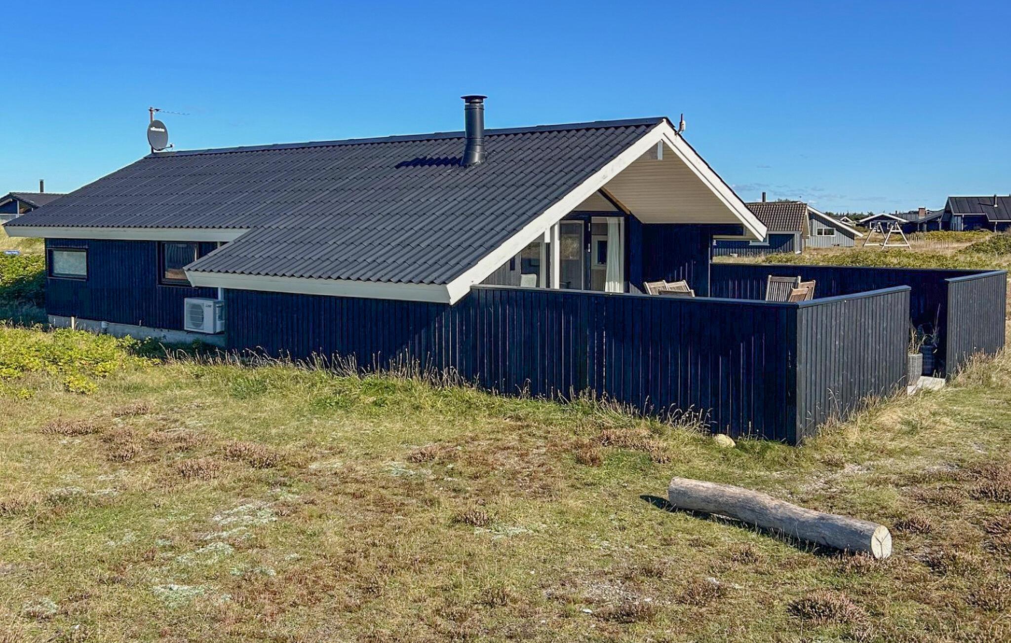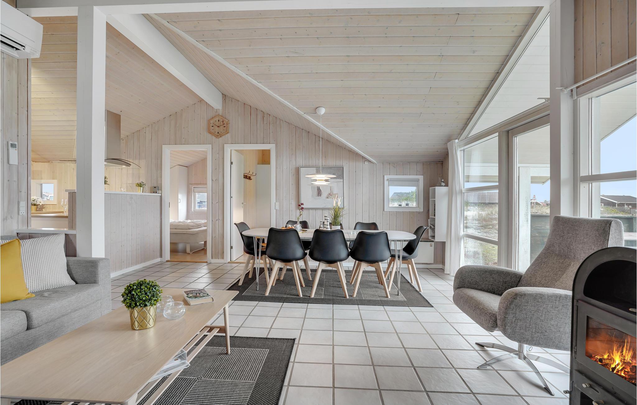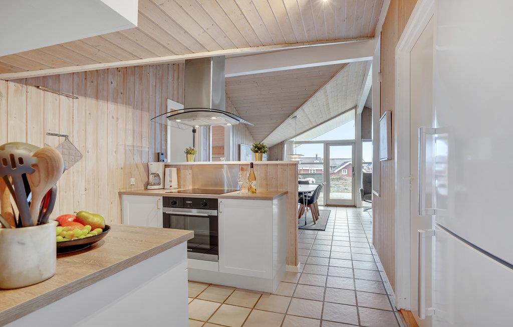 Dieses attraktive Holzferienhaus mit guten Terrassen- und Windschutzverhältnissen liegt auf einem großen Naturgrundstück nur 300 m von der Nordsee entfernt. Durch die schöne Lage nah an Meer, Fjord und Heide ist das Haus ideal für Naturliebhaber. Innen ist es hell und mit skandinavischen Möbeln, schöner Farbzusammensetzung und Kaminofen schön eingerichtet. Die Wohnküche mit offenem Dachfirst bietet einen schönen Lichteinfall.
