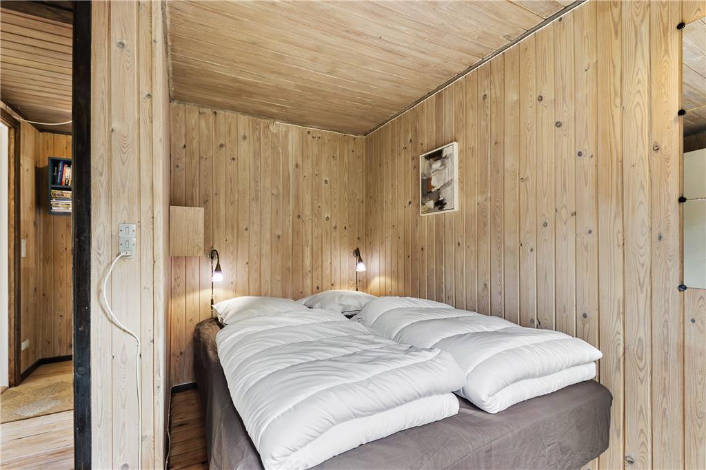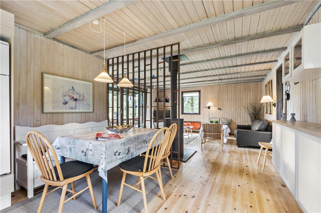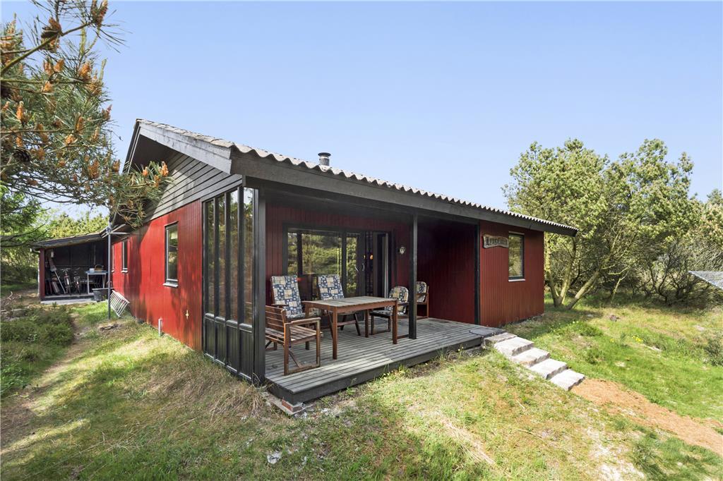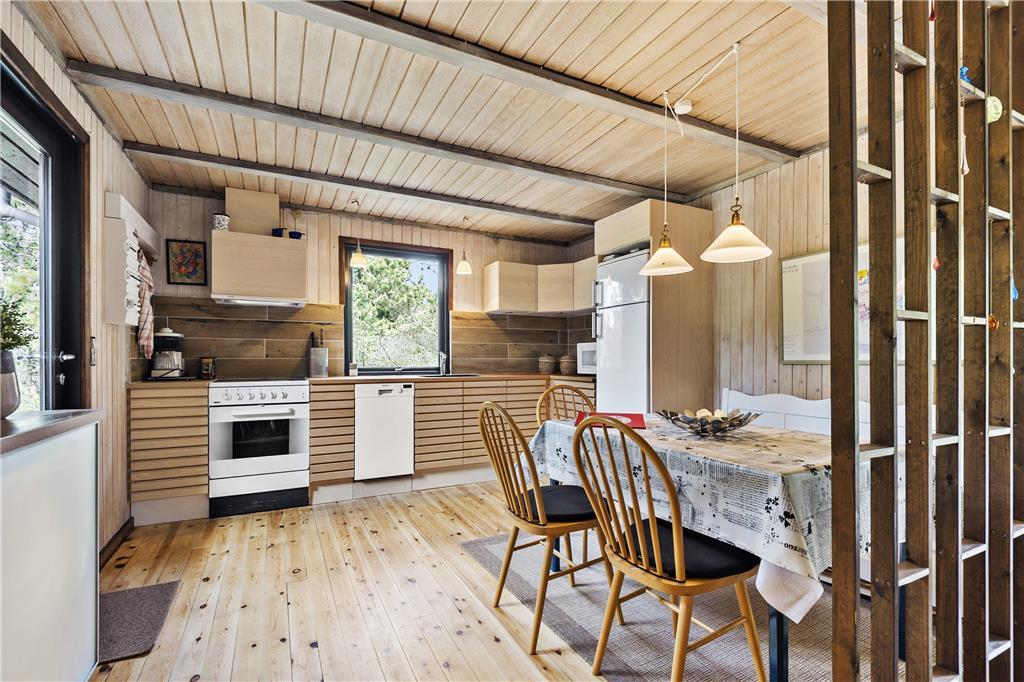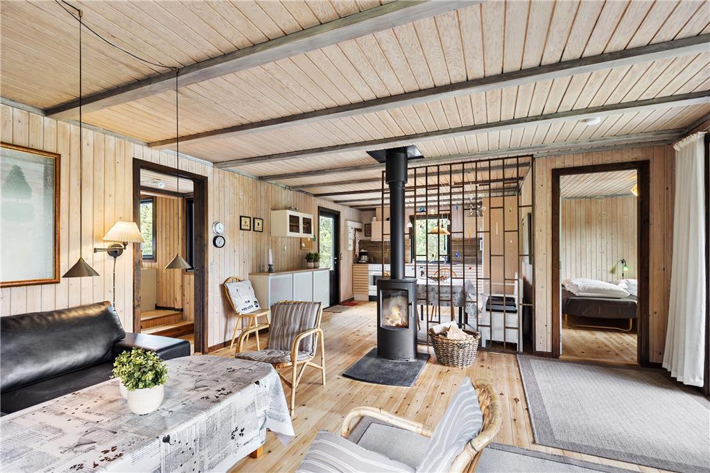 Hier werden Sie an die Urlaube Ihrer Kindheit erinnert, das Haus strahlt nämlich eine authentische Ferienhausidylle aus alten Tagen aus. Zunächst betreten Sie die Küche, eine komplett neue Svane-Küche in hellen Farben, und einen gemütlichen Essbereich mit einer Holzskelett- Trennwand in Richtung Wohnzimmer. Das Wohnzimmer ist eingerichtet mit einem Kamin und einer geschmackvollen Sitzgruppe mit Sofa. Vom Wohnzimmer haben Sie direkten Zugang zur Südterrasse durch die große Schiebetür. Drei hervorragende Schlafzimmer, zwei mit jeweils einem Doppelbett und eins mit einem Etagenbett, alles mit Stauraum. Das Badezimmer wurde ebenfalls wie die Küche erneuert, jetzt ist es hell und modern ausgestattet mit Duschnische und Waschmaschine.