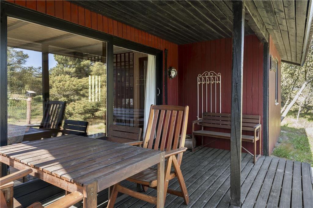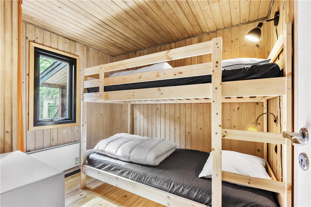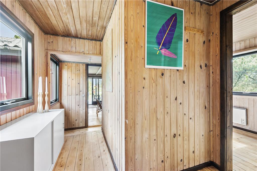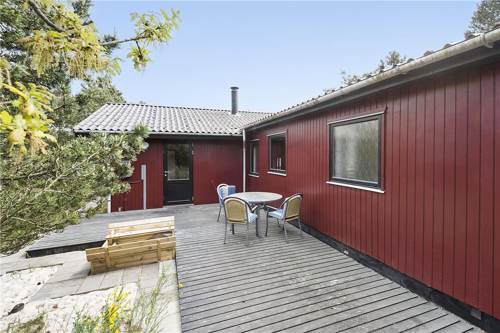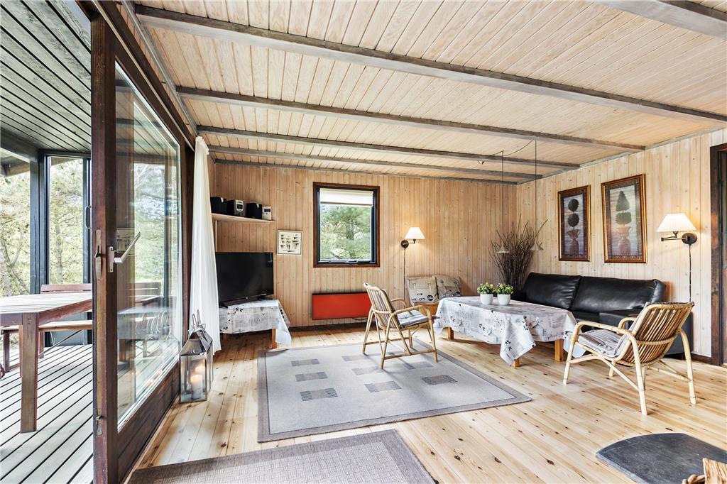 Hier werden Sie an die Urlaube Ihrer Kindheit erinnert, das Haus strahlt nämlich eine authentische Ferienhausidylle aus alten Tagen aus. Zunächst betreten Sie die Küche, eine komplett neue Svane-Küche in hellen Farben, und einen gemütlichen Essbereich mit einer Holzskelett- Trennwand in Richtung Wohnzimmer. Das Wohnzimmer ist eingerichtet mit einem Kamin und einer geschmackvollen Sitzgruppe mit Sofa. Vom Wohnzimmer haben Sie direkten Zugang zur Südterrasse durch die große Schiebetür. Drei hervorragende Schlafzimmer, zwei mit jeweils einem Doppelbett und eins mit einem Etagenbett, alles mit Stauraum. Das Badezimmer wurde ebenfalls wie die Küche erneuert, jetzt ist es hell und modern ausgestattet mit Duschnische und Waschmaschine.