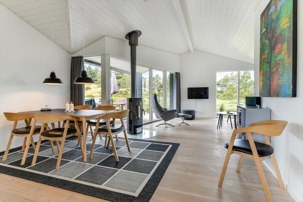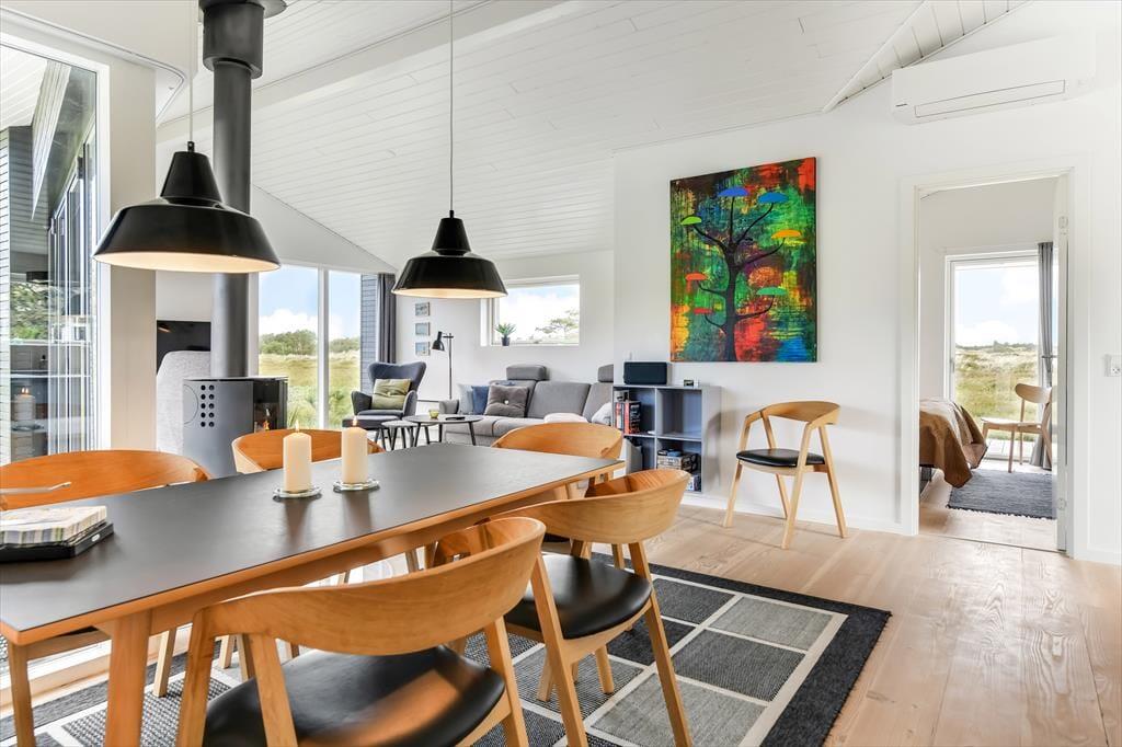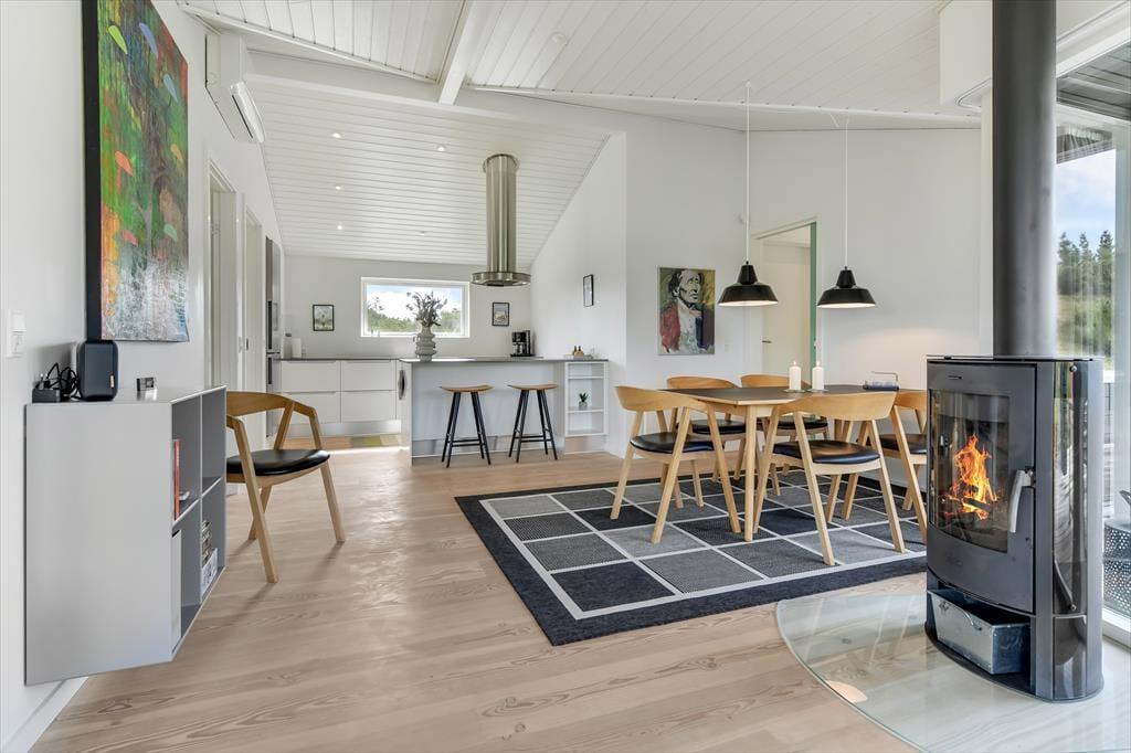Dieses moderne Ferienhaus aus dem Jahr 2017 eignet sich hervorragend für erholsame Urlaubstage in beschaulichem Tempo. In den hellen und einladenden Räumlichkeiten kannst du dich nach Herzenslust ausschlafen, entspannende Duschbäder genießen und deiner Kreativität beim Kochen freien Lauf lassen. Deine Urlaubstage verbringst du auf Wunsch mit geselligen Spielrunden, mit deinem Strickzeug und dicken Büchern. An kühlen Tagen und Abenden heizt du den Kaminofen an und machst es dir auf dem Sofa im Wohnraum oder auf einem der komfortablen Lehnstühle gemütlich. Nicht nur im Wohnraum, sondern auch in den Schlafräumen, kommst du in den Genuss einer atemberaubend schönen Aussicht, die das angenehme Gefühl von Ruhe und Frieden unterstreicht - perfekt, um neue Energien für den oft hektischen Alltag zu schöpfen.