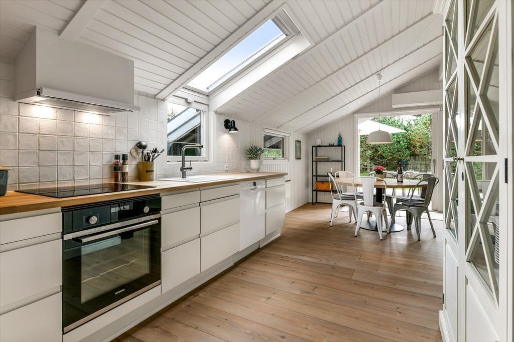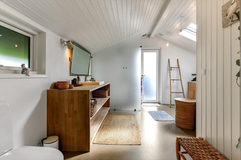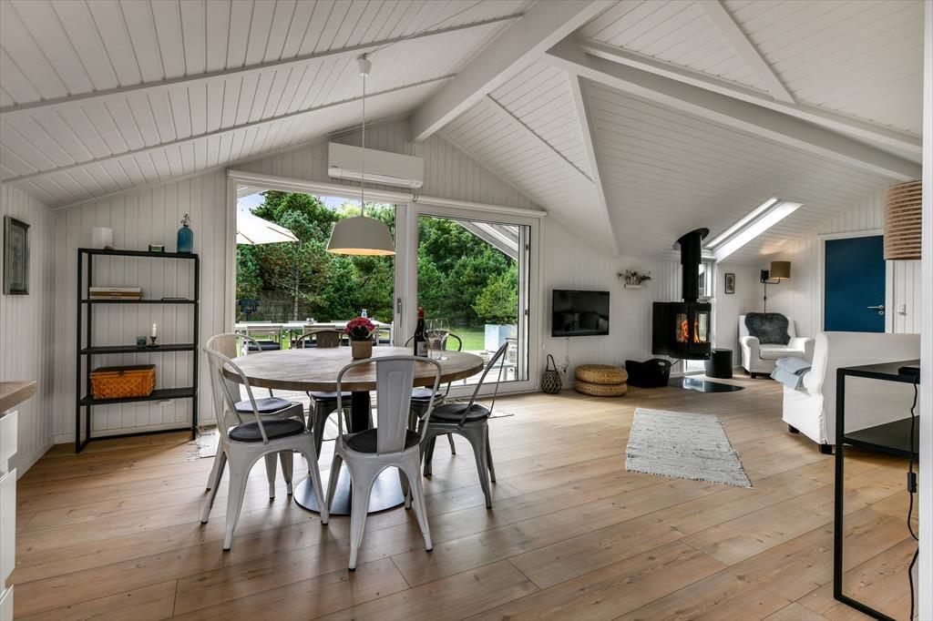 Die hellen Farbtöne und das moderne Interieur sorgen nicht nur für eine schöne Optik, sondern bieten zugleich viel Funktionalität und Komfort. Die offene Küche überzeugt mit guten Arbeitsbedingungen. Das fertige Essen genießt ihr in gemütlicher Runde am runden Esstisch. Außerhalb der Essenzeiten nutzt ihr den Esstisch unter anderem für unterhaltsame Brettspielrunden. Das Sofa des Wohnraums befindet sich nah am Kaminofen. Für Unterhaltung und Abwechslung sorgt ein an der Wand hängender Flachbild-TV. Einer der vier Schlafräume ist im Nebengebäude untergebracht. Das geräumige Badezimmer verwöhnt mit einem direkten Ausgang ins Freie, wo dich bereits der Outdoor-Wellnessbereich erwartet.