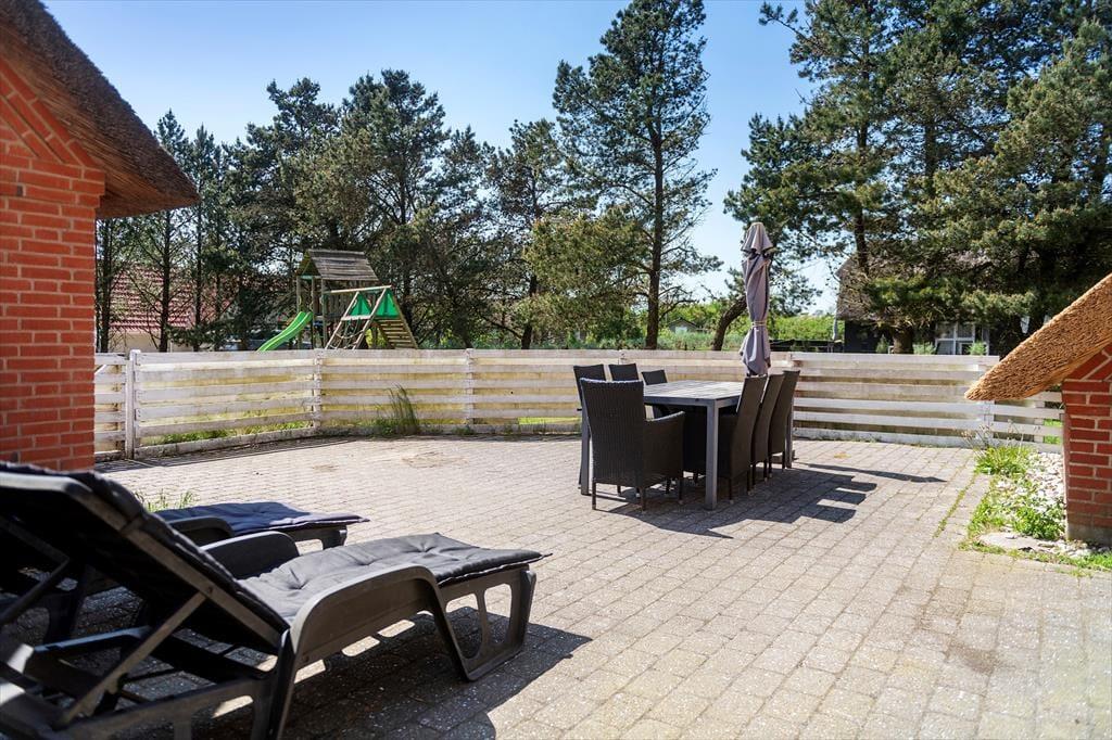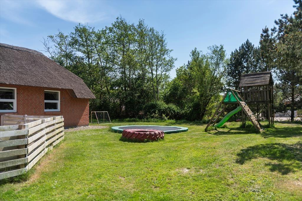 Dein großes Naturgrundstück liegt angenehm zurückgezogen in der Sackgasse Savmøllen. Es ist schön von Bäumen und anderem Bewuchs umgeben. Unter freiem Himmel erwartet dich und deine Lieben daher ein friedvoller, ungestörter Rahmen für erholsame Urlaubstage. Die nach Südwesten ausgerichtete Terrasse lädt zu ausgedehnten Sonnenbädern und stimmungsvollen Grillabenden ein. Sie ist von einer geschlossenen Holzumrandung umgeben und eignet sich somit perfekt als Auslauf für euren Vierbeiner. Während du auf der Terrasse in aller Ruhe die Seele baumeln lässt, werden deine Kinder ausgelassen auf dem Grundstück spielen. Für viel Spaß und Abwechslung sorgen dabei das Gartentrampolin, die Schaukel und das Klettergerüst.