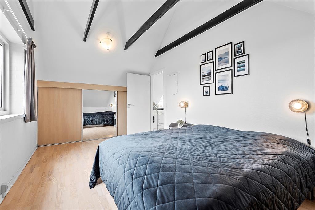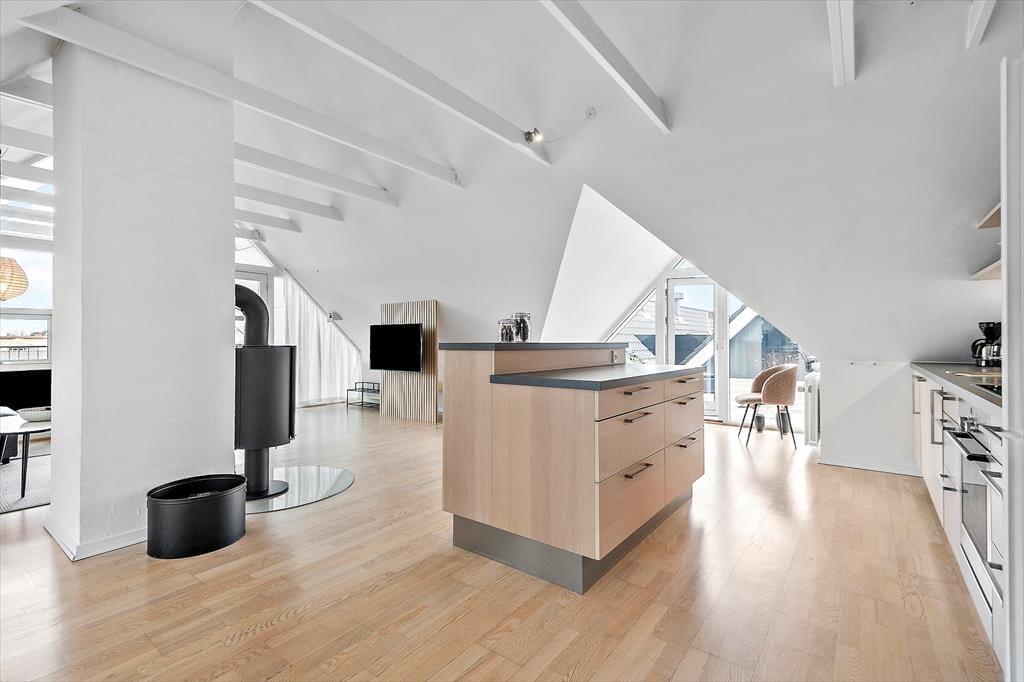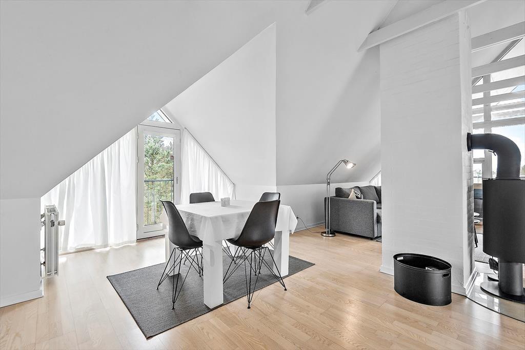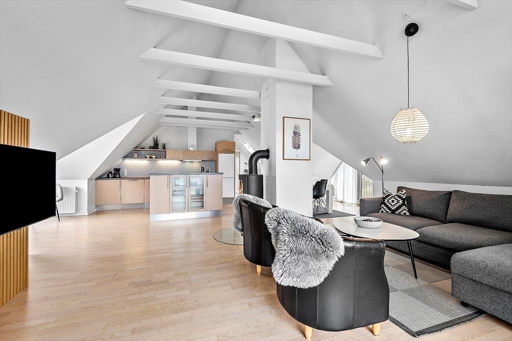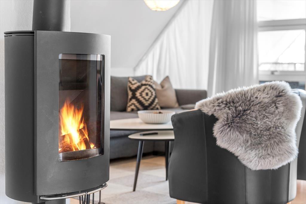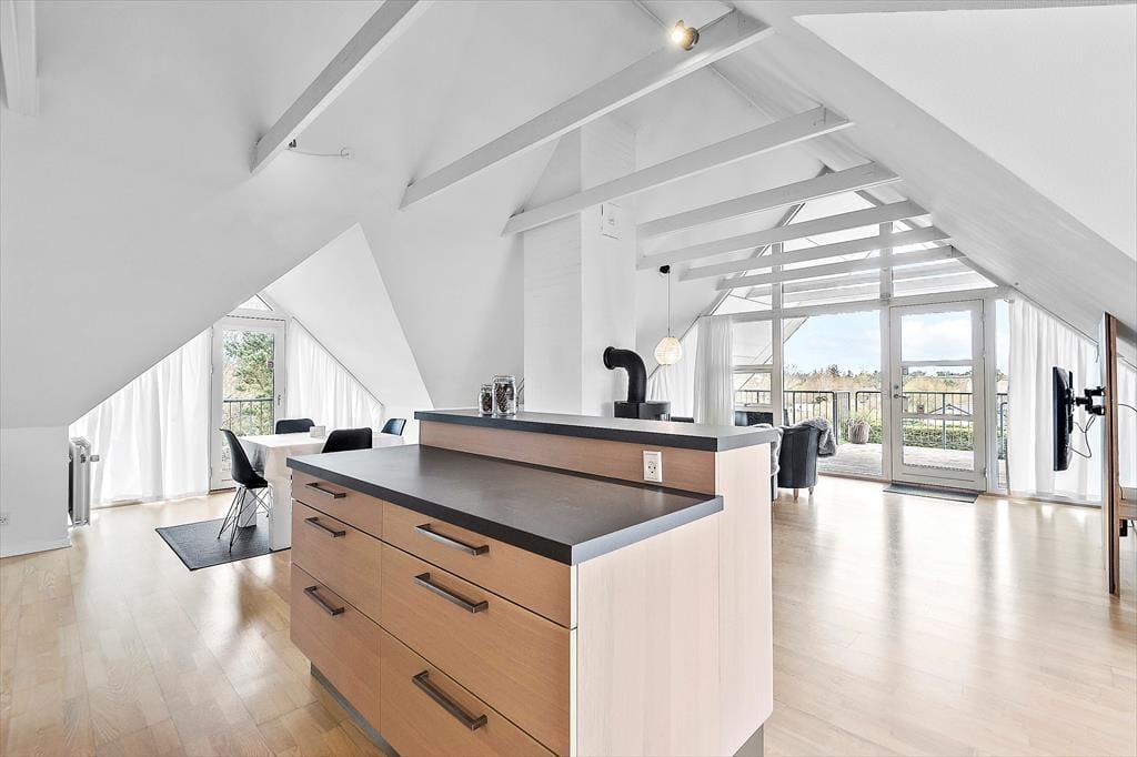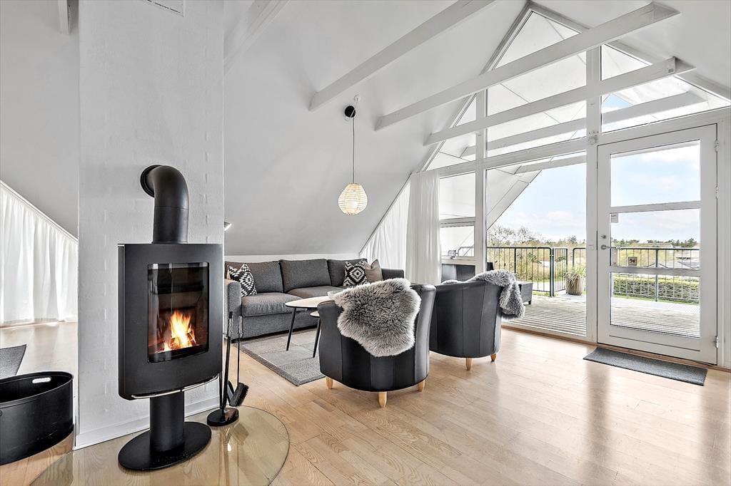 Die moderne Ferienwohnung ist perfekt für einen romantischen Urlaub zu zweit. Die Einrichtung ist elegant und zeitgemäß mit einem hellen und offenen Interieur, das eine einladende Atmosphäre schafft. Das gemütliche Wohnzimmer mit Kaminofen lädt zur Entspannung vor den knisternden Flammen ein, während du ein gutes Buch oder einen Film im Fernsehen genießt. Die Küche ist voll ausgestattet und offen mit dem Wohnzimmer verbunden, sodass ihr auch beim Kochen die Gesellschaft des anderen genießen könnt. Vom Schlafzimmer aus gibt es direkten Zugang zur privaten Dachterrasse, wo ihr den Morgenkaffee mit Blick auf Blåvand genießen und die Ruhe auf euch wirken lassen könnt.