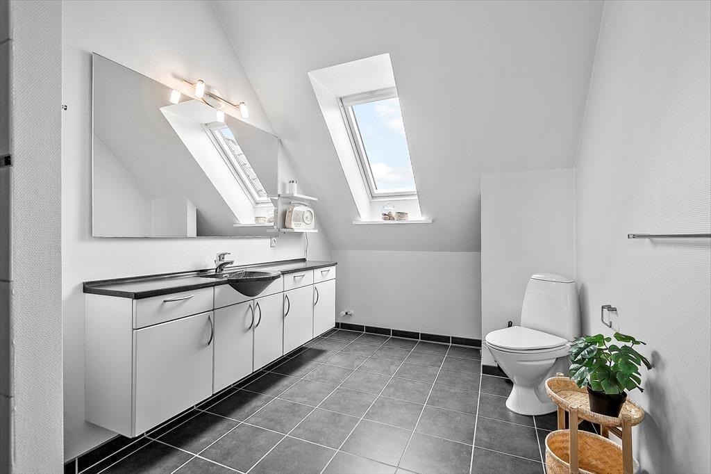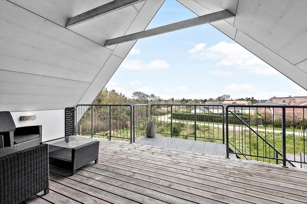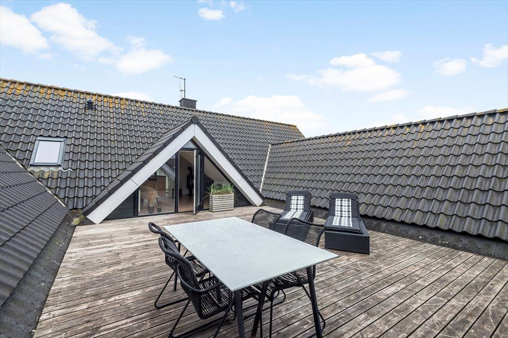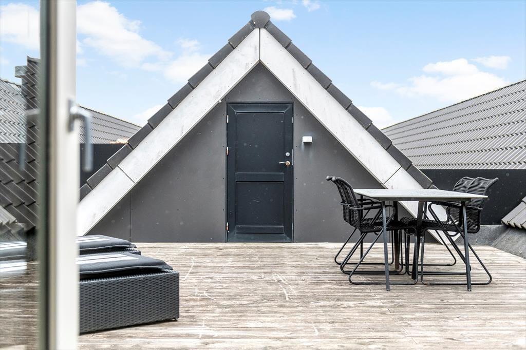 Die private Dachterrasse ist das Schmuckstück der Ferienwohnung. Hier könnt ihr ungestört sonnenbaden, Mahlzeiten unter freiem Himmel genießen und abends die Sterne betrachten. Die Dachterrasse ist mit komfortablen Gartenmöbeln ausgestattet, sodass ihr in vollen Zügen entspannen könnt. Egal ob ihr ein Buch lesen, ein Glas Wein genießen oder einfach nur die Stille genießen möchtet, diese Terrasse ist der perfekte Ort dafür. Die Wohnung verfügt auch über eine kleine Terrasse im Erdgeschoss, wo ihr an warmen Tagen im Schatten sitzen könnt. Beide Terrassen sind darauf ausgelegt, euch ein Gefühl von Luxus und Entspannung mitten in der schönen westjütländischen Natur zu vermitteln.