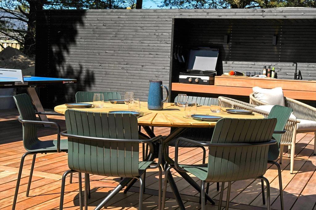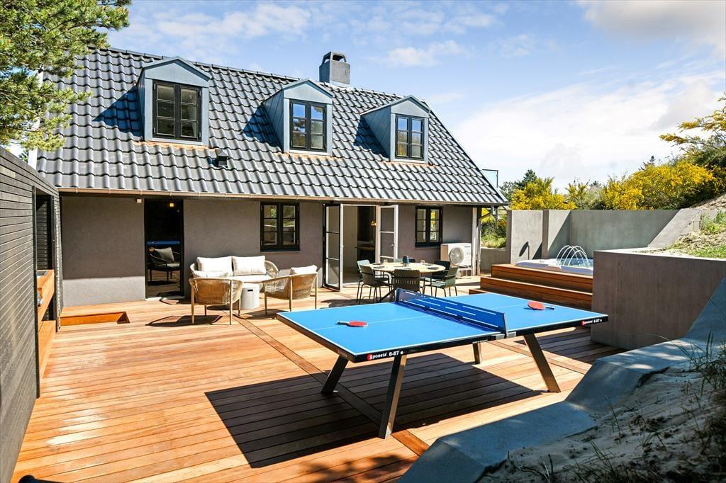 Das Ferienhaus ist von einer landschaftlich schönen Dünenmulde umgeben, die ein ganz besonderes Gefühl von Ruhe und Privatsphäre vermittelt. Auf der großen Terrasse kannst du den ganzen Tag die Sonne genießen und hast dabei einen Blick auf die grünen Umgebungen. Bereite in der schönen Außenküche ein köstliches Essen für diee Familie zu. Der Außen-Whirlpool ist ein perfekter Ort, um zu entspannen und die frische Luft zu genießen, während du den Blick auf die schöne Natur schweifen lässt. Du kannst auch die Außensauna nutzen, die direkt an das Terrassenumfeld angrenzt. Für diejenigen, die etwas Aktivität lieben, gibt es auch einen Tischtennistisch auf der Terrasse, sodass du deine Mitreisenden zu einem lustigen und energiegeladenen Turnier herausfordern kannst. Egal, ob du dich entspannen oder aktiv sein möchtest, die Möglichkeiten liegen direkt vor der Tür.