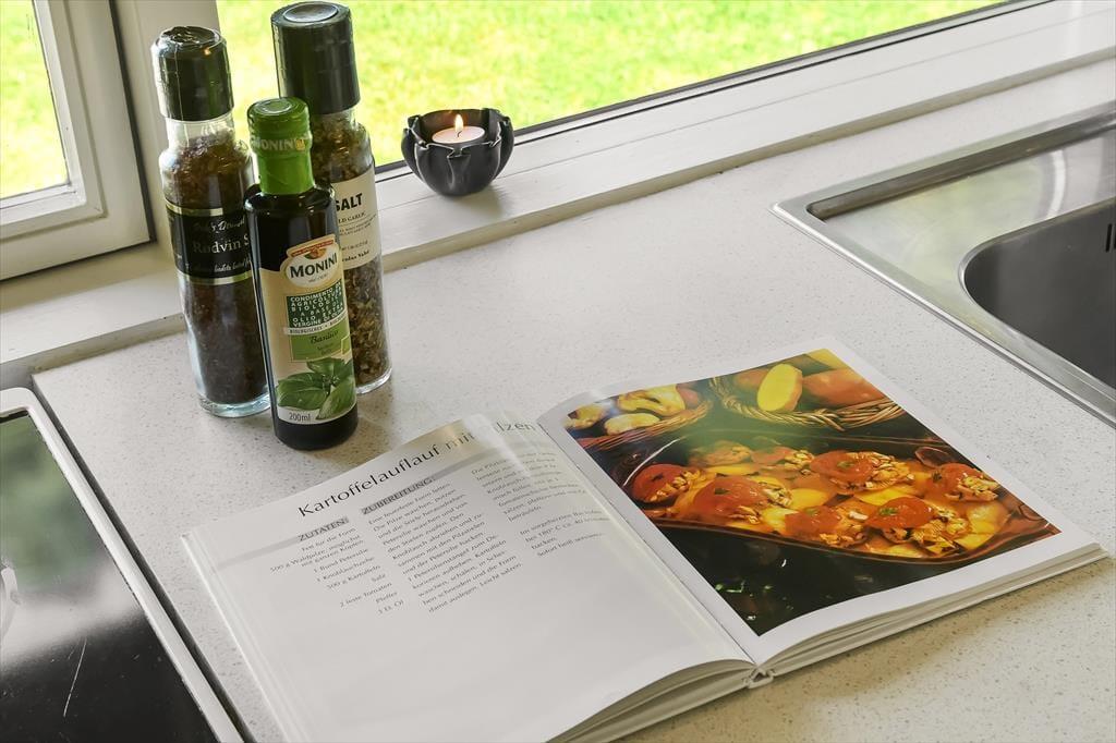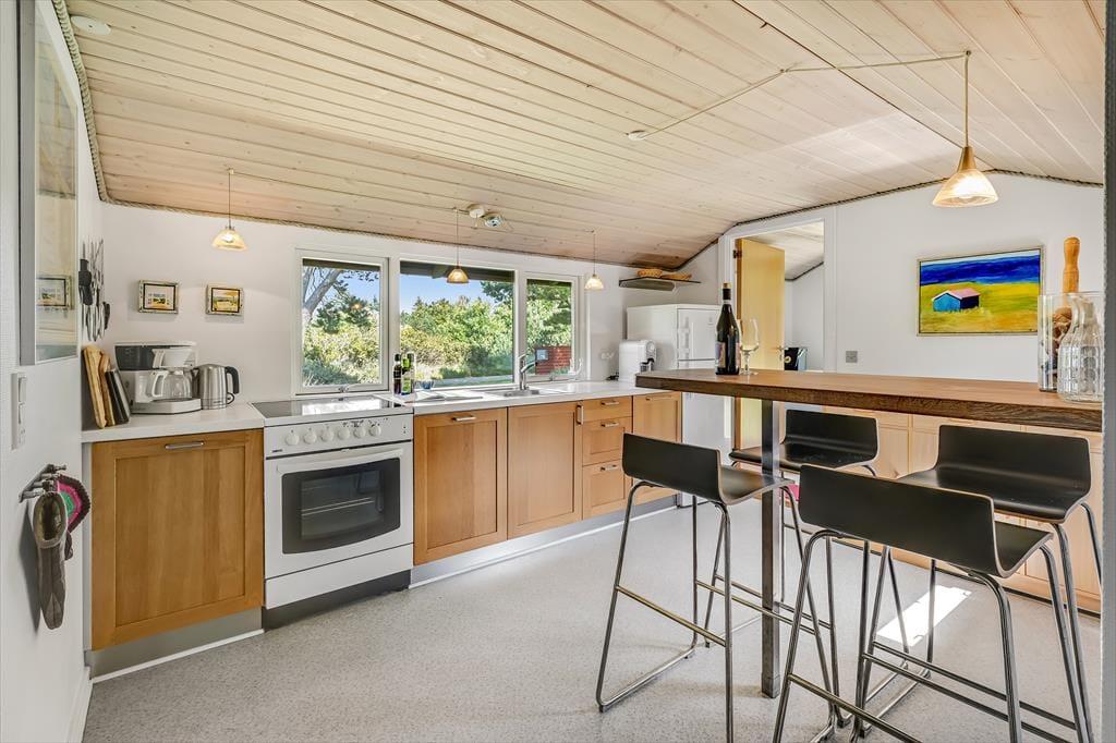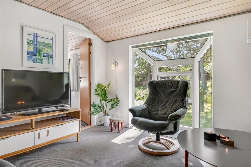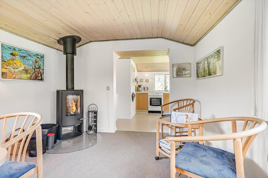 Drinnen erwartet dich eine gemütliche und einladende Atmosphäre, in der das Urlaubsleben schnell in einem ruhigen Tempo ankommt. Das helle Wohnzimmer mit großen Fensterfronten lässt das Tageslicht hereinströmen und bietet einen schönen Blick auf die grüne Umgebung. Der Kaminofen sorgt für Wärme und Behaglichkeit, wenn die Abende kühler werden, und die Küche ist offen mit dem Wohnzimmer verbunden, sodass alle Teil des Gesprächs sein können – auch während des Kochens. Nach einem erlebnisreichen Tag kannst du es dir auf dem Sofa mit einem guten Buch oder einem Brettspiel gemütlich machen, während du dem Knistern der Flammen lauschst.