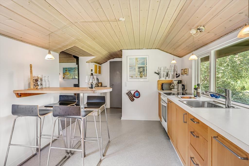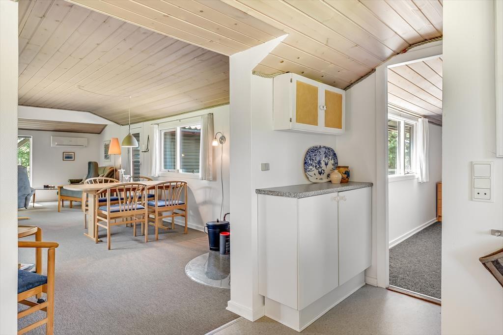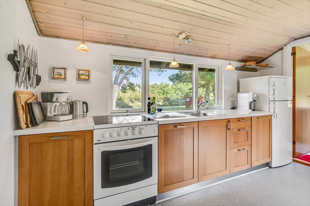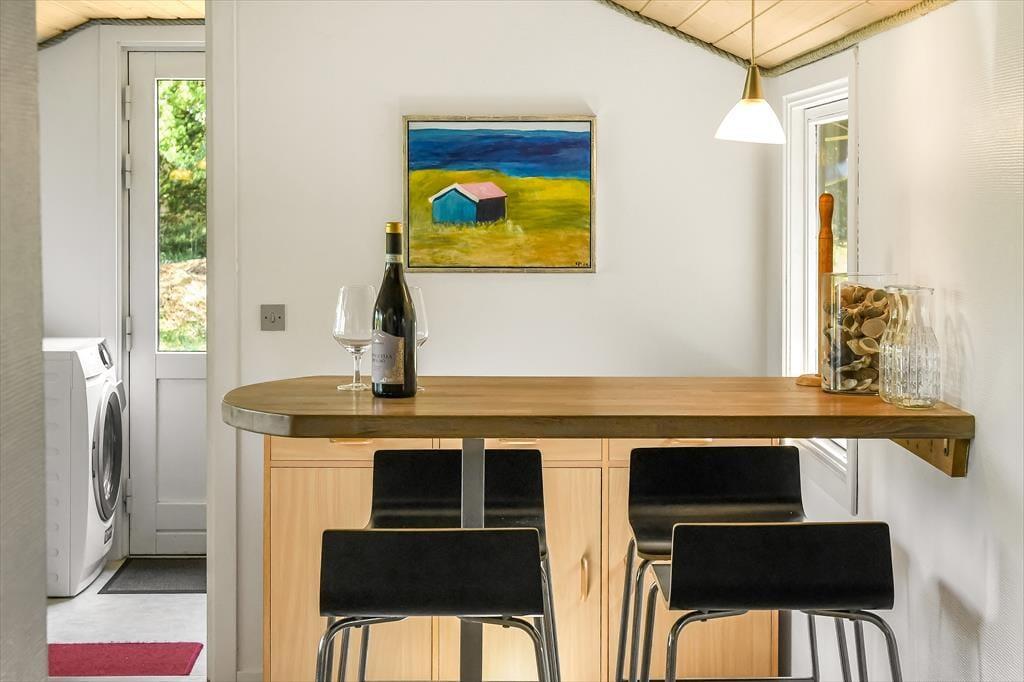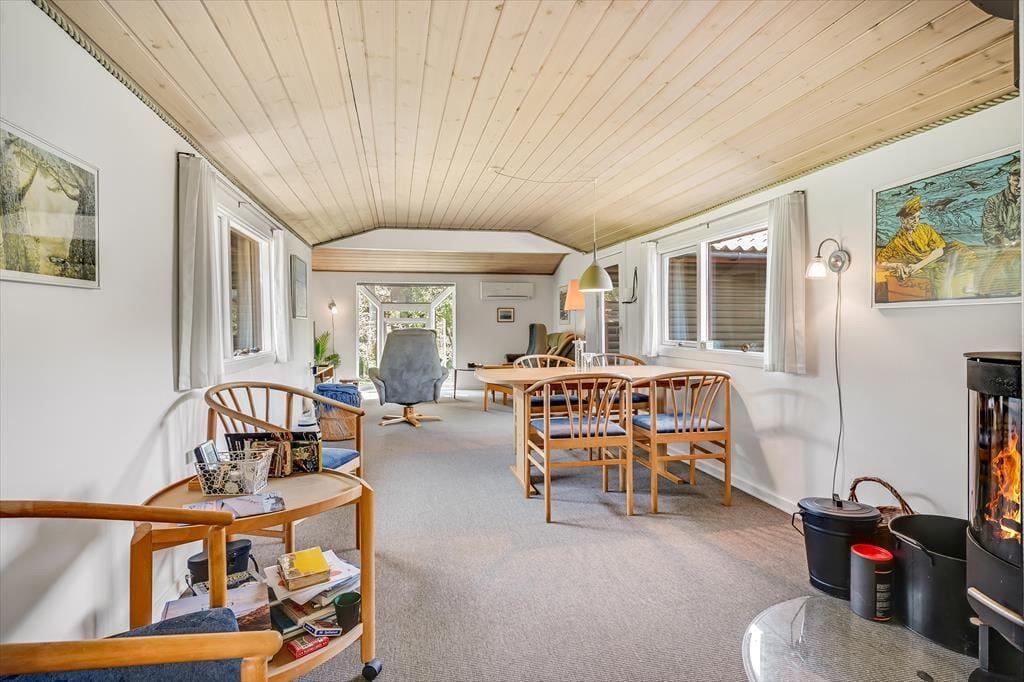 Drinnen erwartet dich eine gemütliche und einladende Atmosphäre, in der das Urlaubsleben schnell in einem ruhigen Tempo ankommt. Das helle Wohnzimmer mit großen Fensterfronten lässt das Tageslicht hereinströmen und bietet einen schönen Blick auf die grüne Umgebung. Der Kaminofen sorgt für Wärme und Behaglichkeit, wenn die Abende kühler werden, und die Küche ist offen mit dem Wohnzimmer verbunden, sodass alle Teil des Gesprächs sein können – auch während des Kochens. Nach einem erlebnisreichen Tag kannst du es dir auf dem Sofa mit einem guten Buch oder einem Brettspiel gemütlich machen, während du dem Knistern der Flammen lauschst.