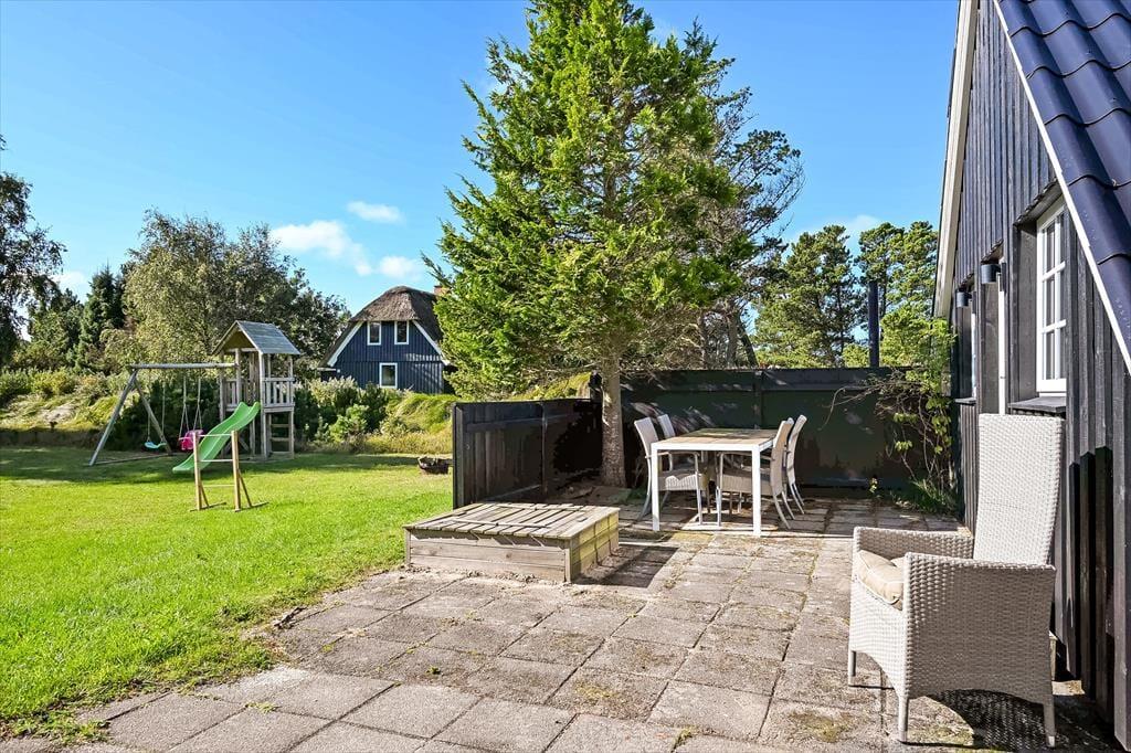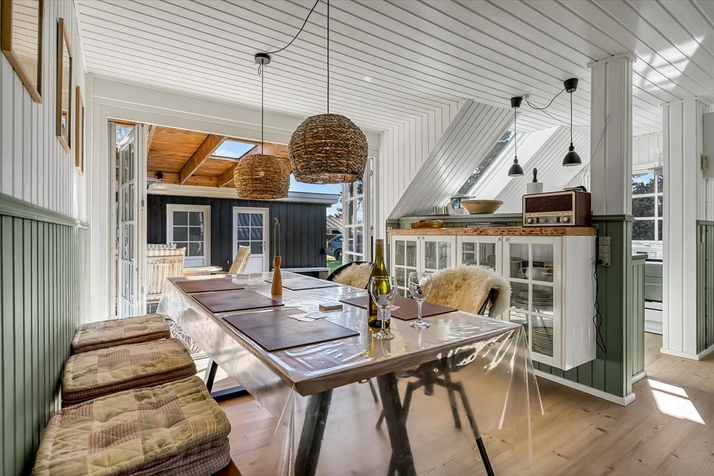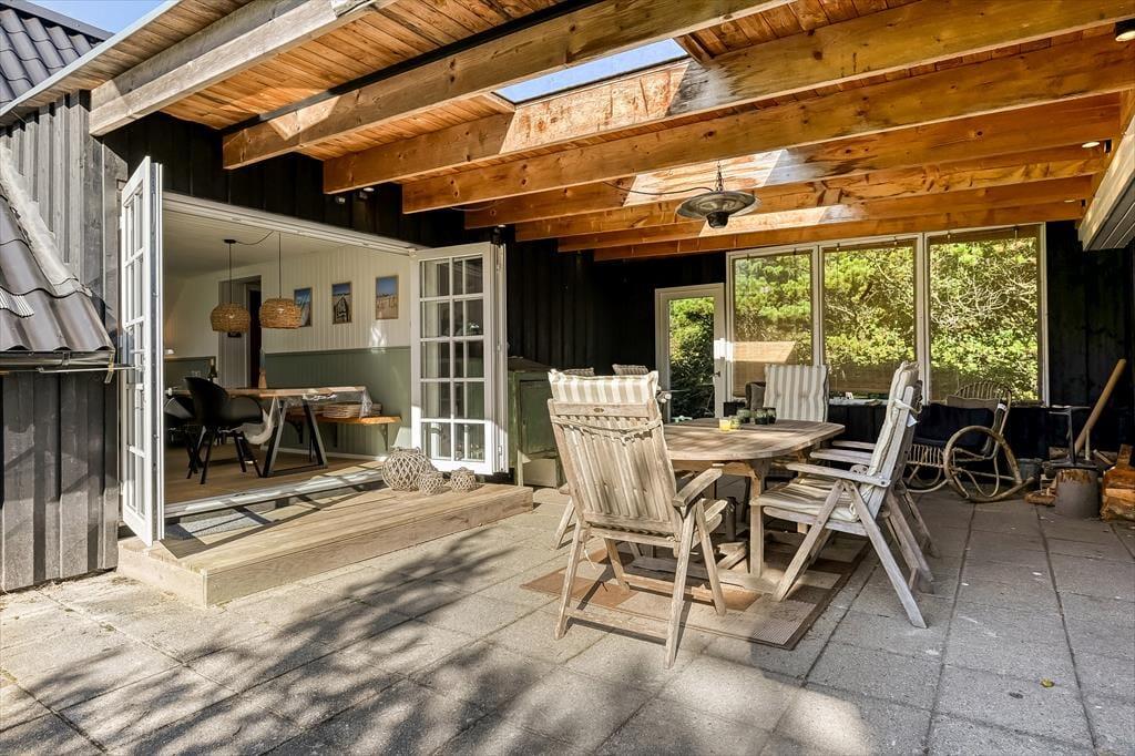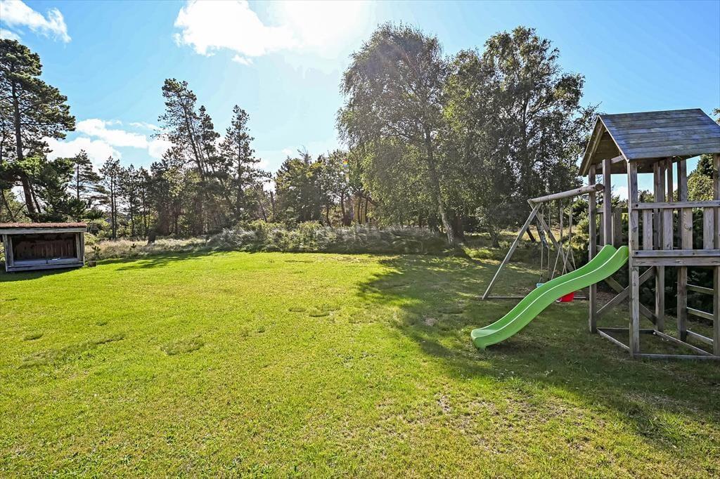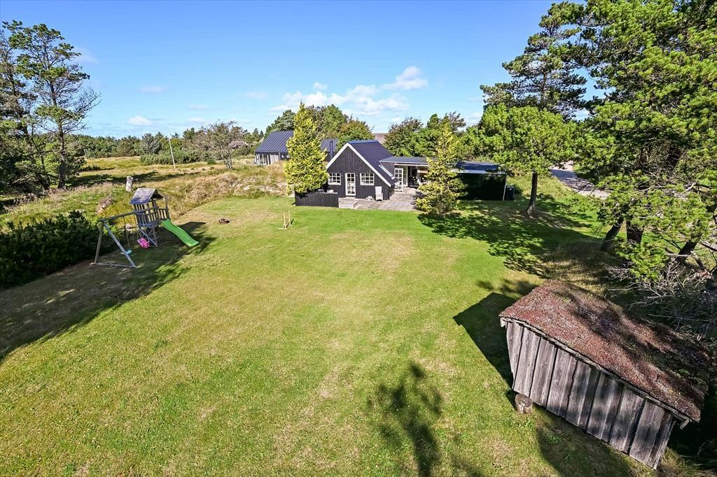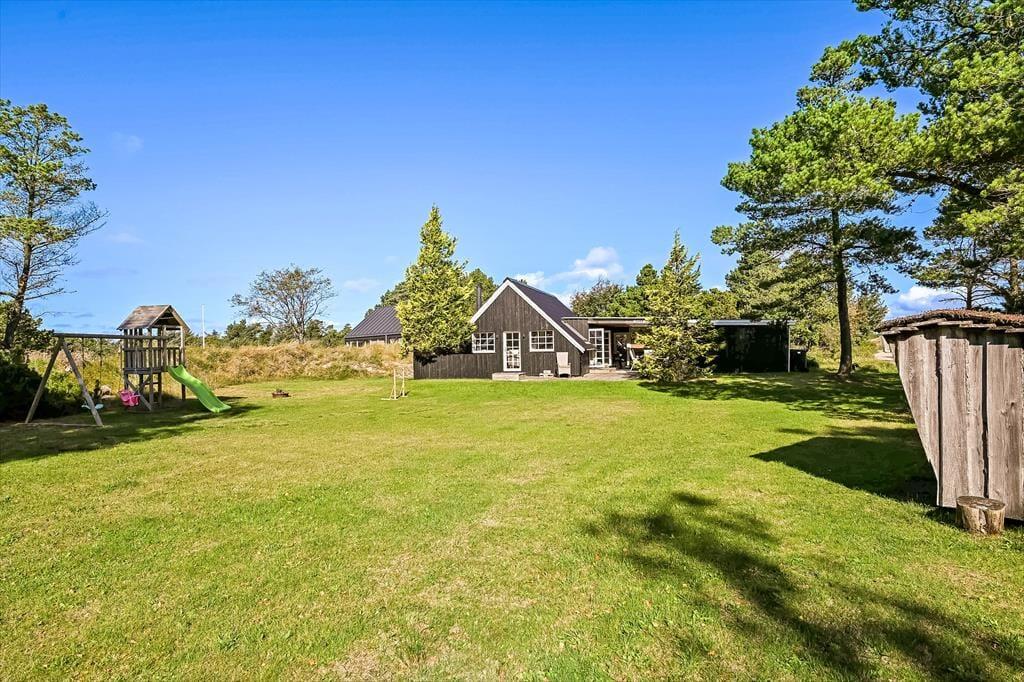 Draußen erwartet euch ein großes, herrliches Naturgrundstück, das euch das Gefühl gibt, euer eigenes kleines Refugium mitten in Blåvands wunderschöner Natur zu haben. Die Kinder werden es lieben, auf der Wiese zu spielen, im Spielturm zu klettern oder das Gebiet rund um den Shelter zu erkunden, wo sie stundenlang kleine Abenteuer erleben können. Für die Erwachsenen gibt es viele gemütliche Plätze zum Verweilen – besonders die überdachte Terrasse mit Oberlichtern. Hier könnt ihr die Türen weit öffnen und Innen- und Außenbereich ineinander übergehen lassen. So lassen sich die Sommerabende mühelos verlängern, selbst wenn der Tau fällt, während der Duft von Gegrilltem und das Zwitschern der Vögel die Atmosphäre perfekt abrunden.