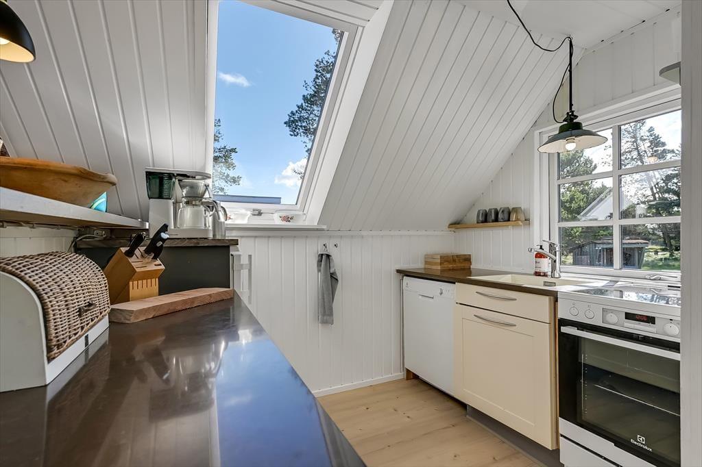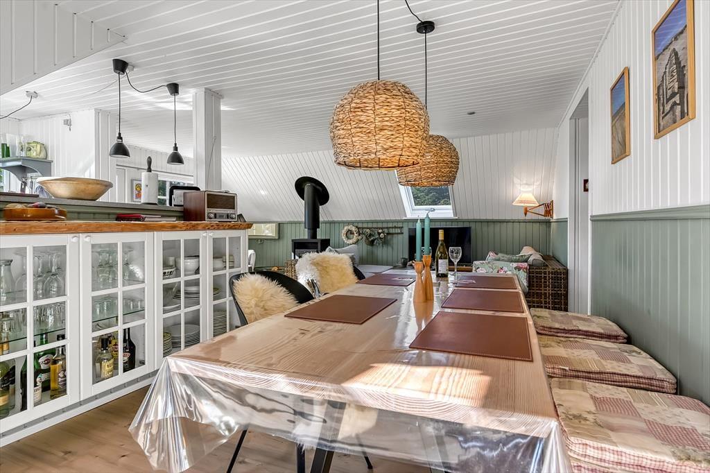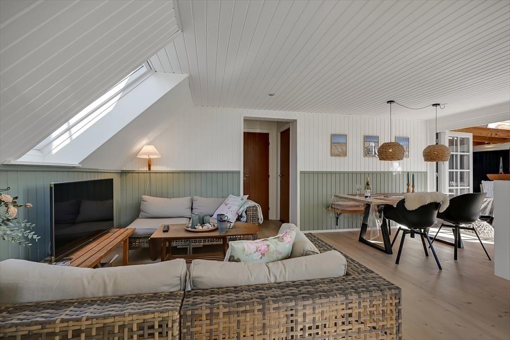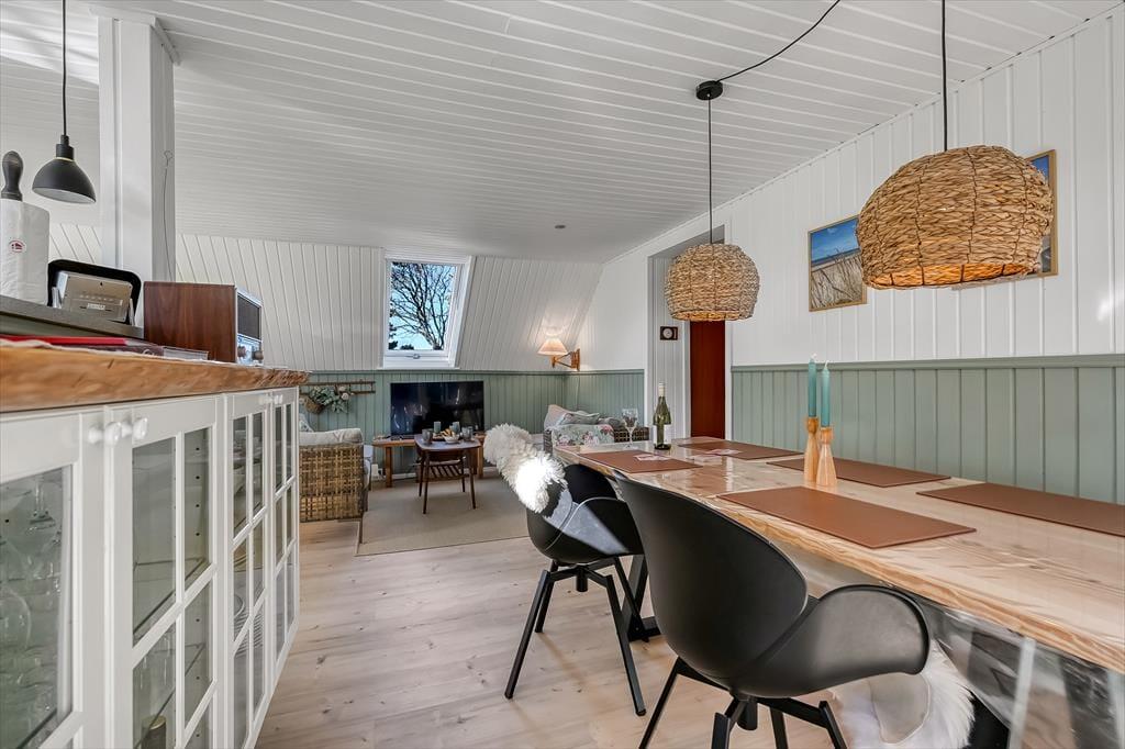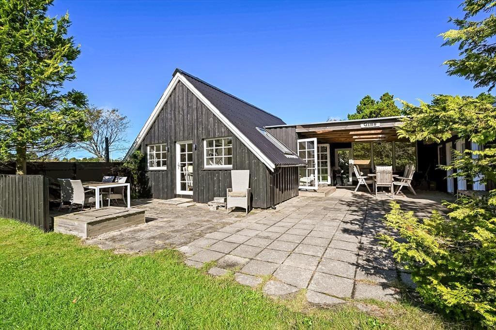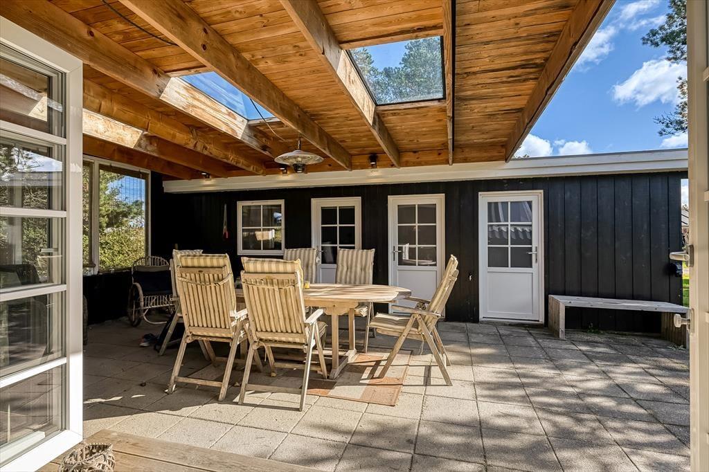 Draußen erwartet euch ein großes, herrliches Naturgrundstück, das euch das Gefühl gibt, euer eigenes kleines Refugium mitten in Blåvands wunderschöner Natur zu haben. Die Kinder werden es lieben, auf der Wiese zu spielen, im Spielturm zu klettern oder das Gebiet rund um den Shelter zu erkunden, wo sie stundenlang kleine Abenteuer erleben können. Für die Erwachsenen gibt es viele gemütliche Plätze zum Verweilen – besonders die überdachte Terrasse mit Oberlichtern. Hier könnt ihr die Türen weit öffnen und Innen- und Außenbereich ineinander übergehen lassen. So lassen sich die Sommerabende mühelos verlängern, selbst wenn der Tau fällt, während der Duft von Gegrilltem und das Zwitschern der Vögel die Atmosphäre perfekt abrunden.