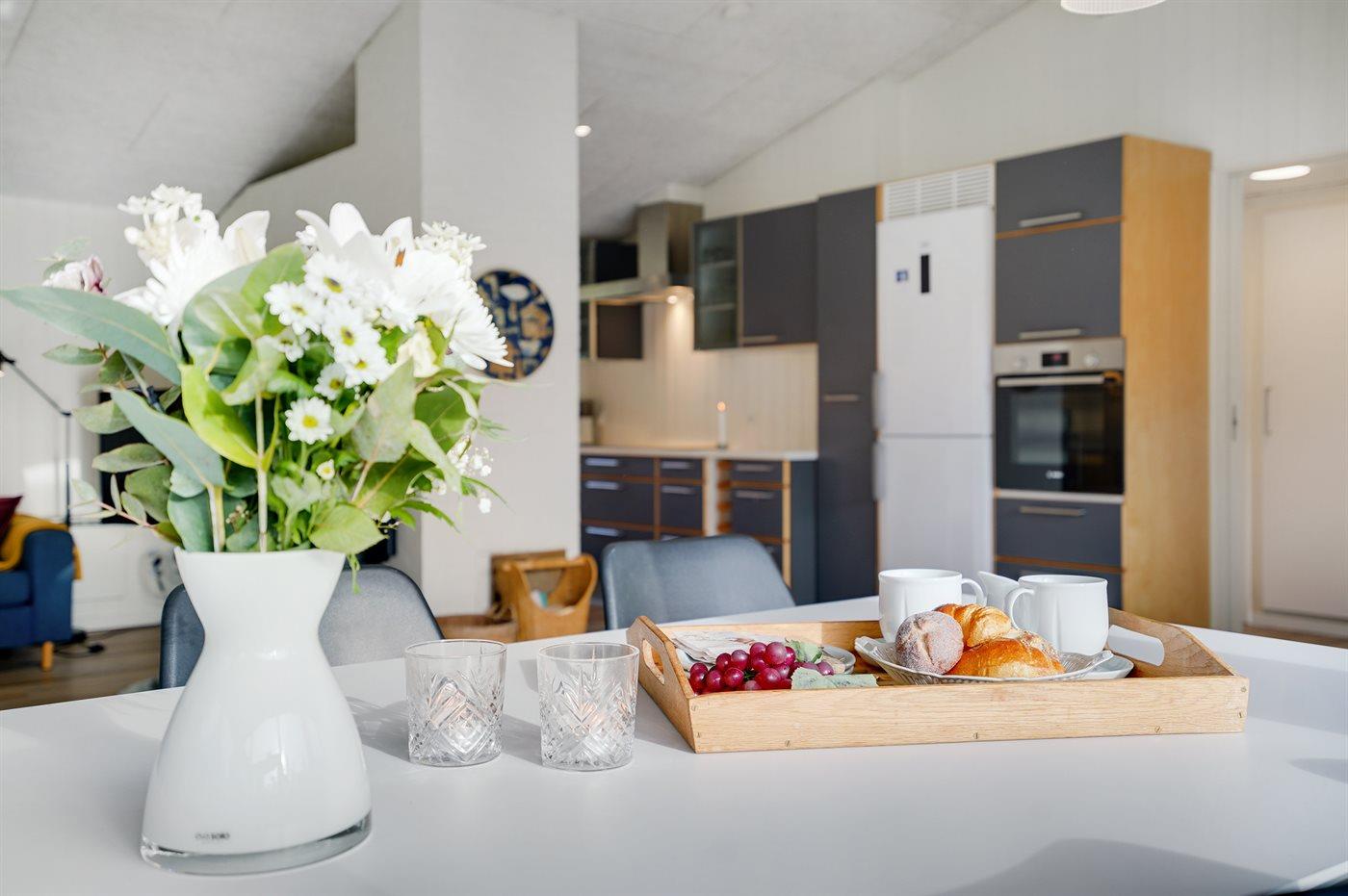 Die Küche ist mit Kühlschrank ausgestattet. Außerdem gibt es 4 Keramik-Kochfelder, Umluftofen, Mikrowelle sowie Geschirrspüler.