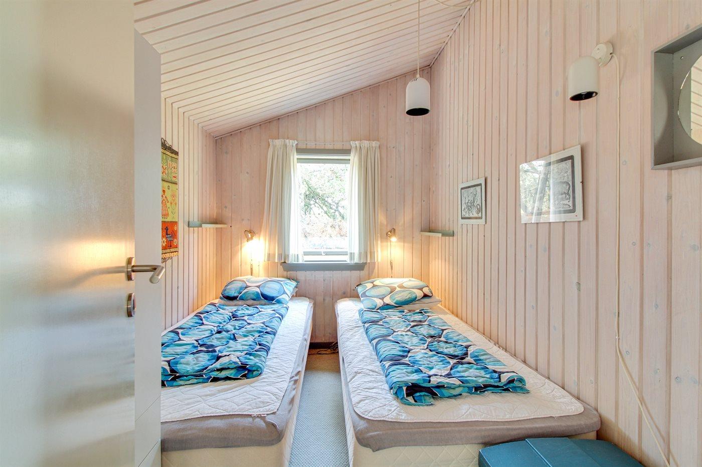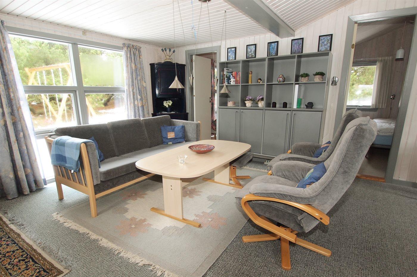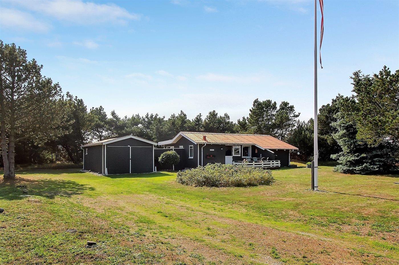 Dieses gepflegte blau- und weiß gestrichene Ferienhaus aus Holz, 1960 gebaut und 2000 renoviert, ist auf einem Naturgrundstück gelegen, von hohen Bäumen umgeben. Nach Norden gerichtete Terrasse und große nach Süden gerichtete Terrasse mit Gartenmöbeln. Sandkiste und 3 Schaukel für die Kinder. Teppichboden überall, jedoch Klinkerboden im Badezimmer und PVC-Boden in der Küche. Hell gebeizte Decken und Wände. Das Badezimmer mit Fußbodenheizung und Duschnische wurde 2015 modernisiert. Gemütliches Wohnzimmer mit TV, digitaler Satellitenanschluss und Radio mit CD-Spieler. Die große helle Küche mit gutem Schrankplatz ist u. a. mit kleinem Tiefkühlgerät und Umluftofen ausgestattet. Außerdem Kinderbett vorh. Neben dem Haupthaus gibt es eine Garage.