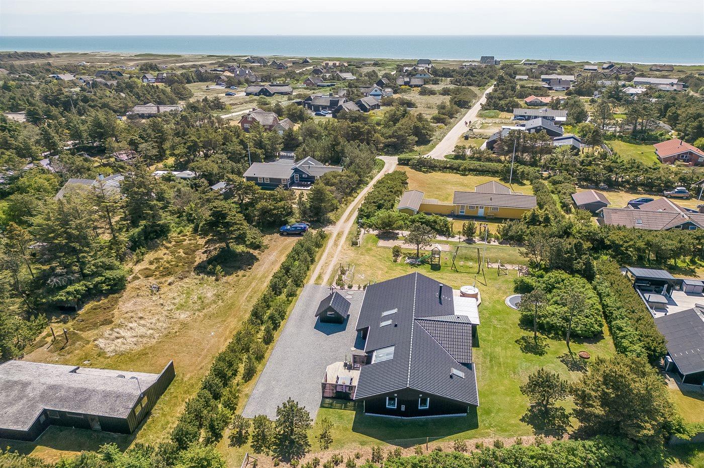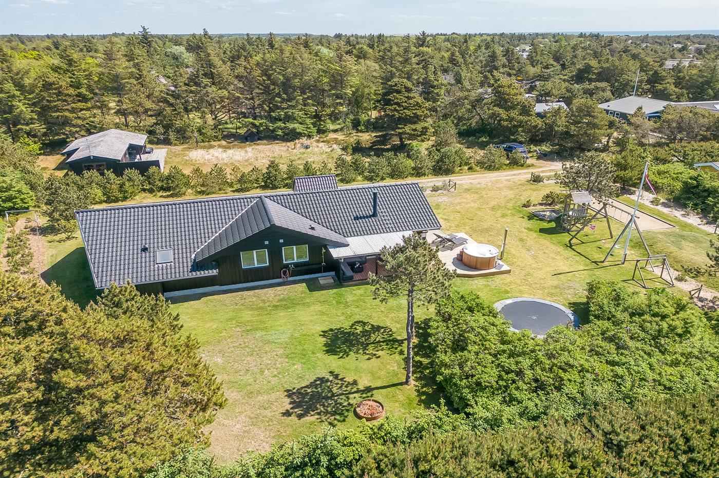 In dem beliebten Feriengebiet Blåvand, nur 300 m von dem schönen Badestrand entfernt liegt dieses nette Ferienhaus auf einem großen Naturgrundstück. Zum Haus gehören 2 in versetzter Ebene liegende und zum Teil überdachte Terrassen mit Gartenmöbeln, Grill und Hot Tub für 6 Personen. Auf dem Grundstück, wo sich die Kinder so richtig tummeln können, gibt es Schaukel, Sandkasten, Trampolin, Spielgerüst und Fußballtor sowie Petanquebahn. Außerdem stehen ein Fahrradschuppen und 2 Fahrräder zur Verfügung.